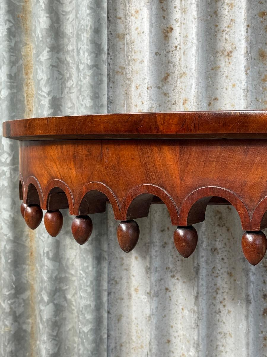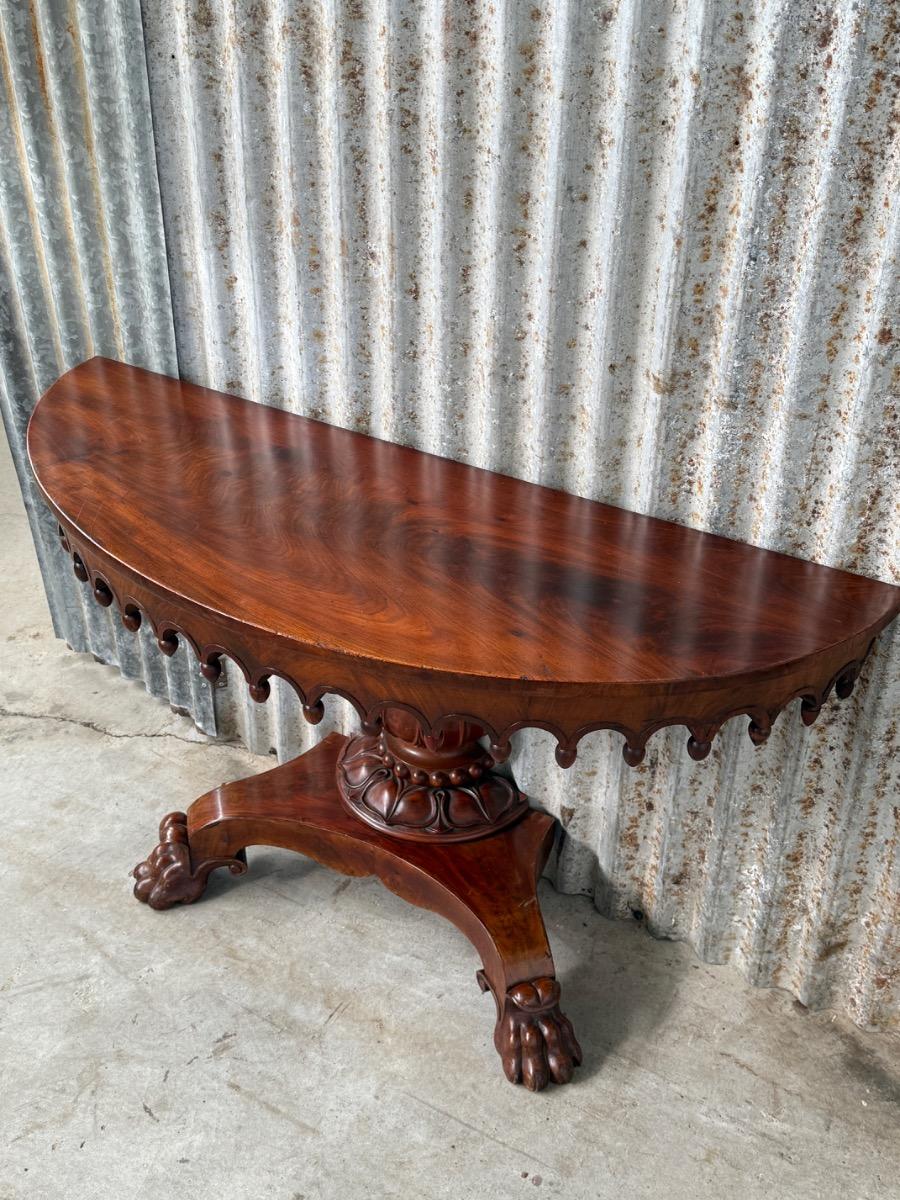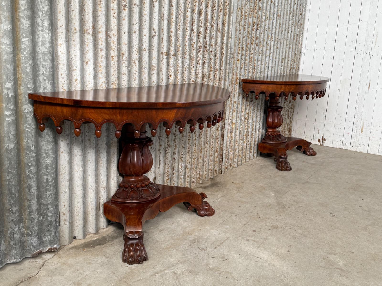 Set van 2 mahonie console tafels, vroeg 19de eeuw, houtgestoken ‘Coupe’ vormige kolom op tweespant gedragen door twee klauw poten, fraai bloem mahonie geprofileerde manchet met spitsboogjes en druppelvormige pinakels.