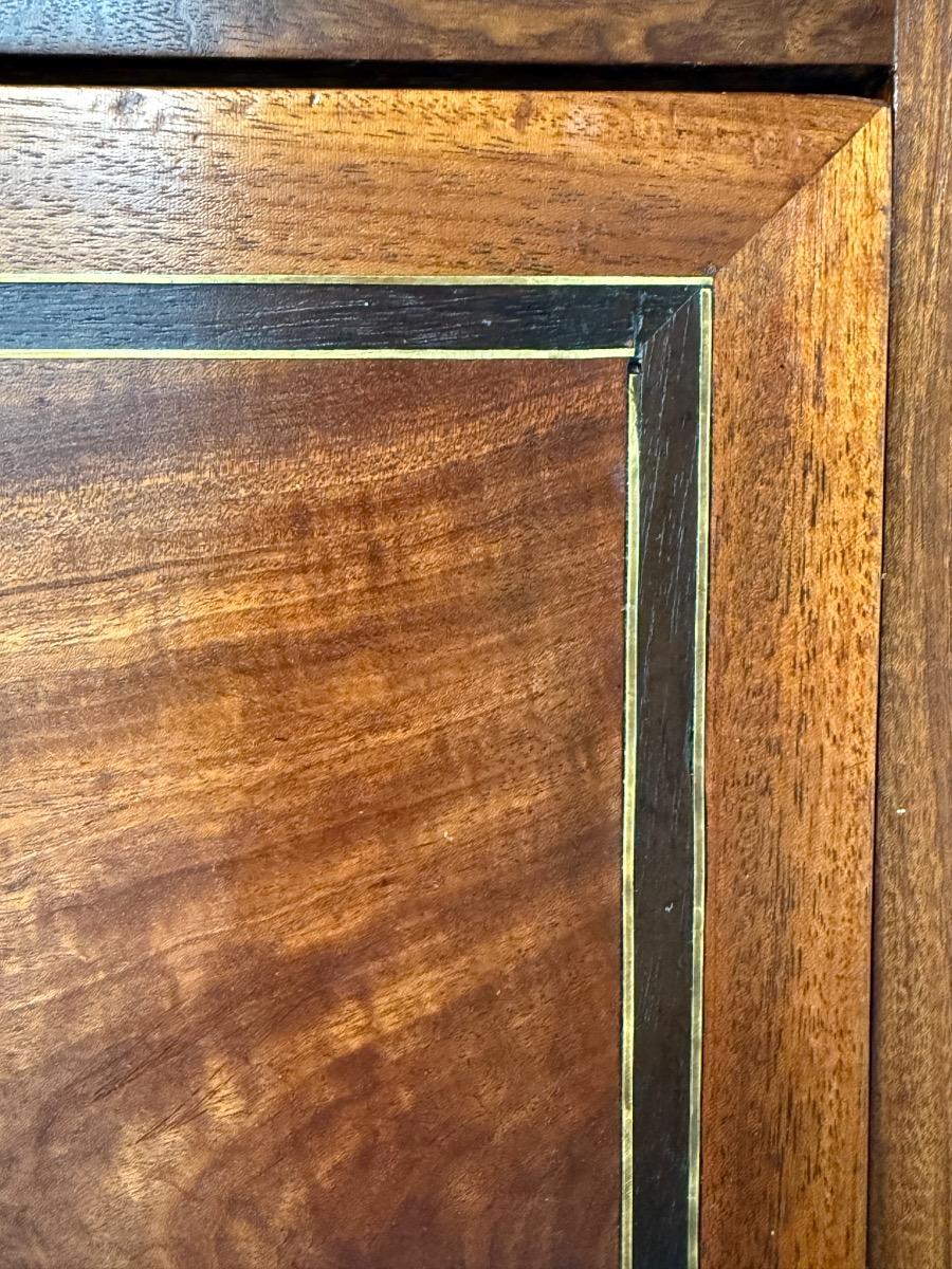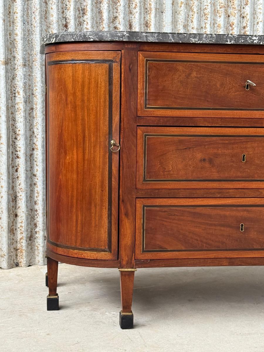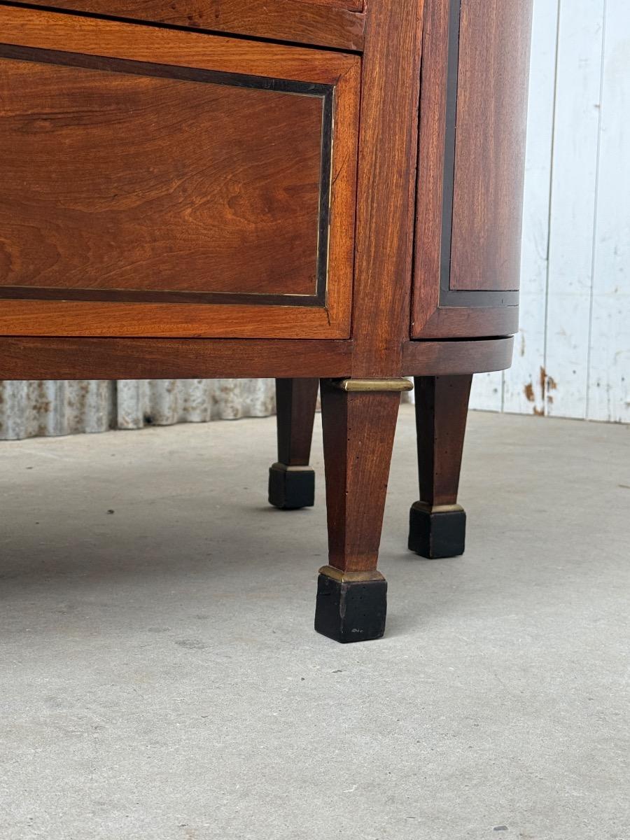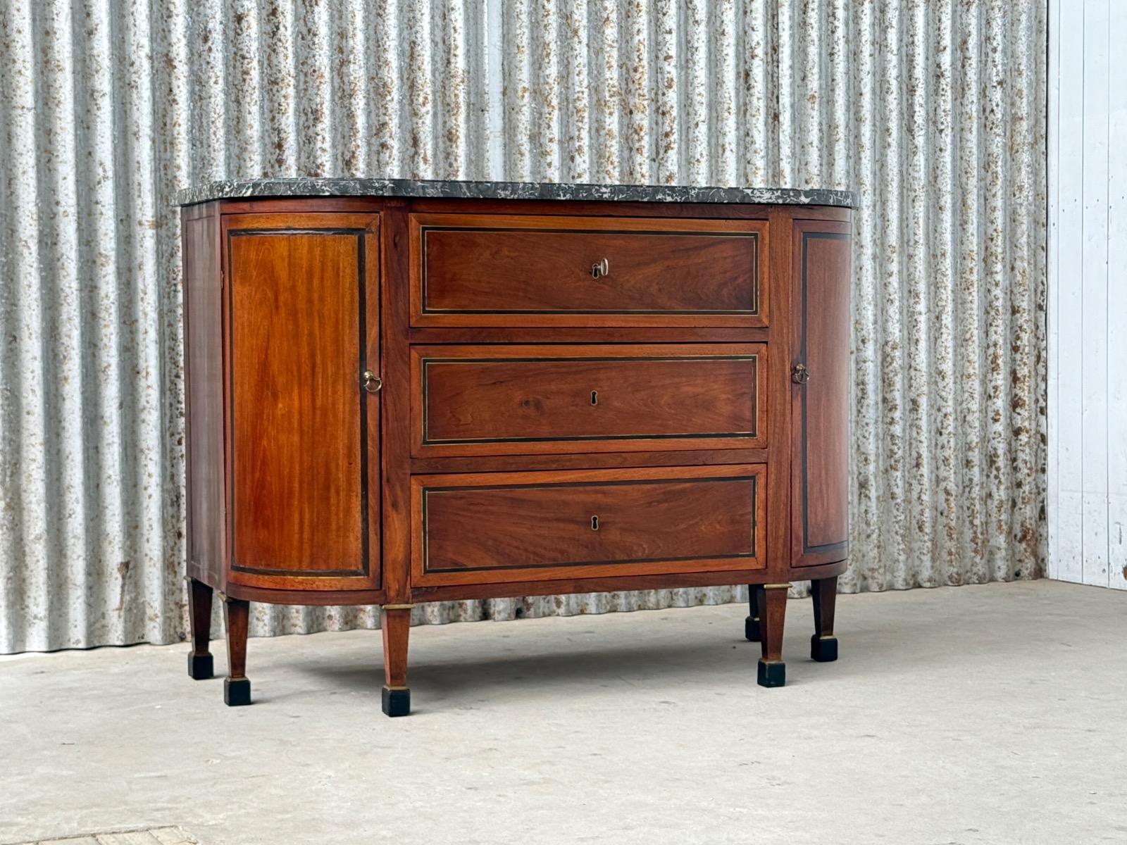 Een Frans dressoir gemaakt in de late 18e eeuw van eikenhout met mahonie, ebben en messing ingelegd.