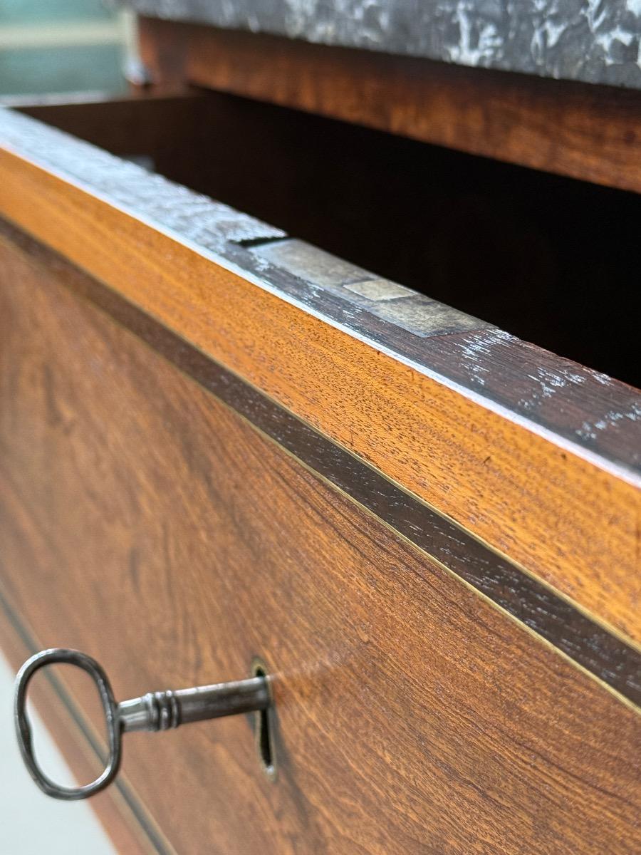 Onder het 3 cm (!!) dikke St. Anna marmer centraal 3 flinke laden met werkende oorspronkelijke sloten en sleutel. Aan weerskanten een kwart ronde deur met daarachter een legplankje.