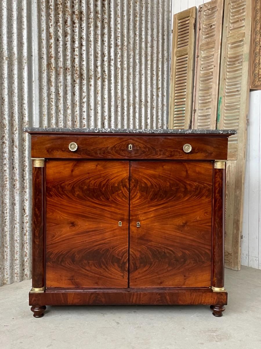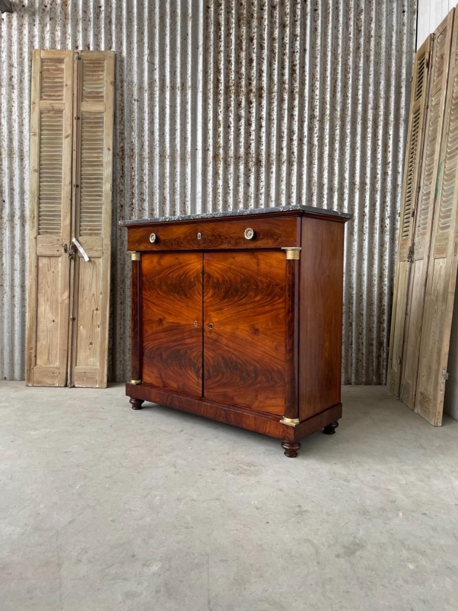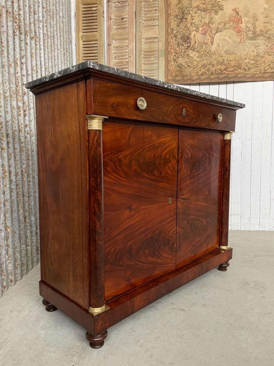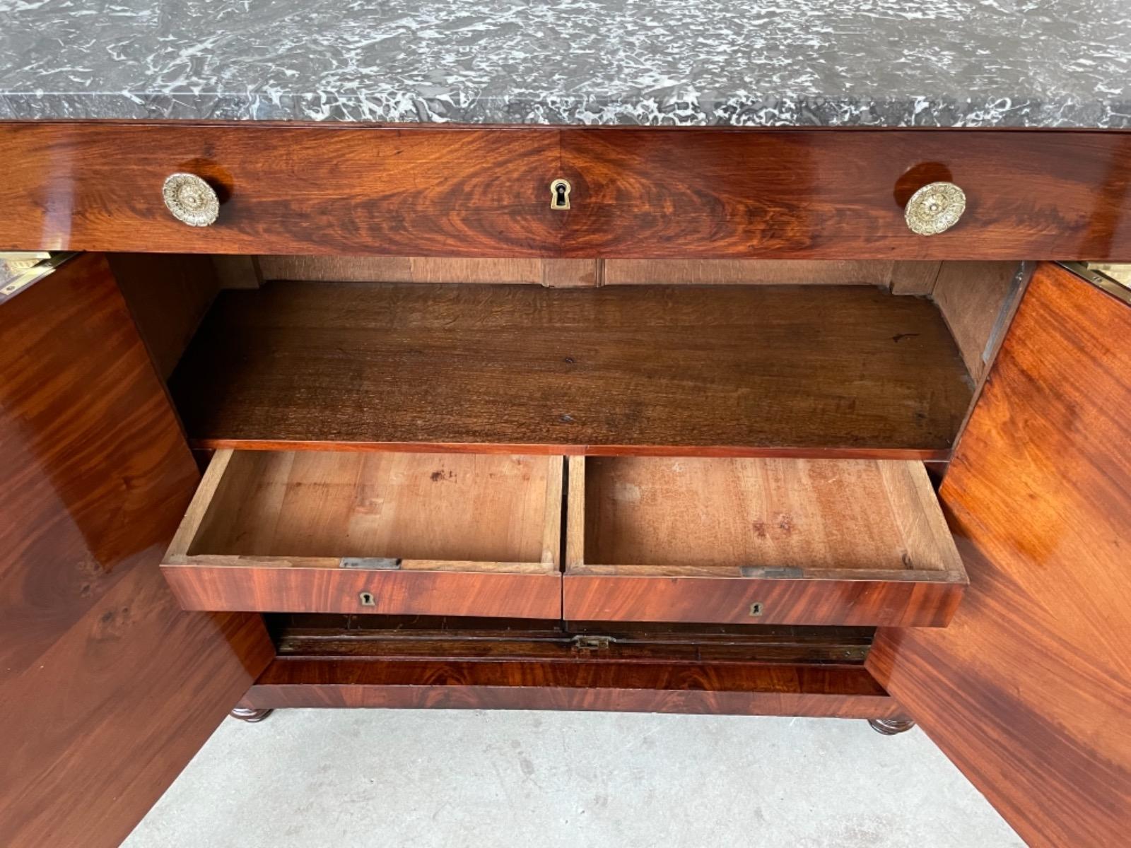 Mahonie epoque empire dressoir, lade in de kap en intern twee laden. St.Anna marmer gedekt. Half volle pilaren met vuur verguld messing kapitelen. Afm; H 111 cm B 114-122 cm D 42-50 cm Volledig nagezien, controle op houtworm; geen actieve worm, geen oude gaatjes. Dres-2303