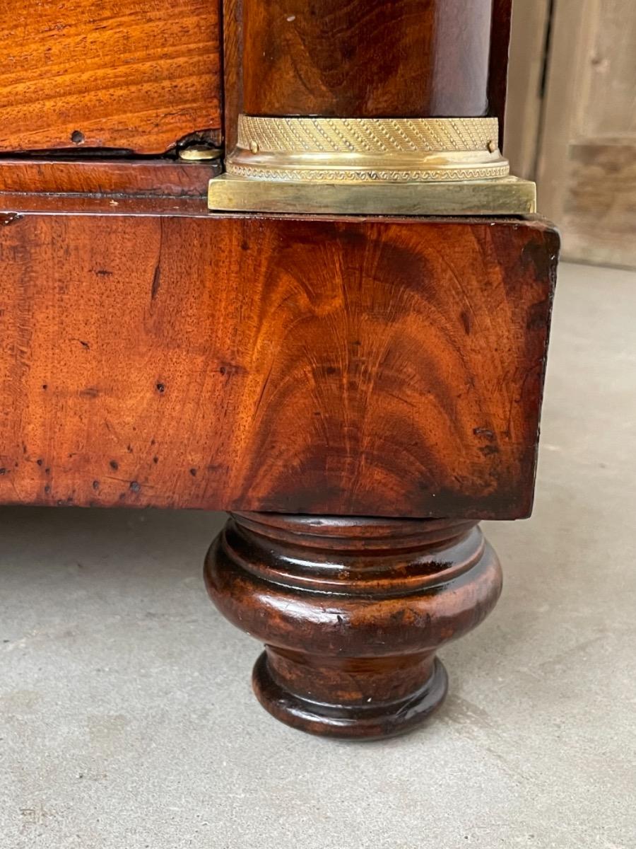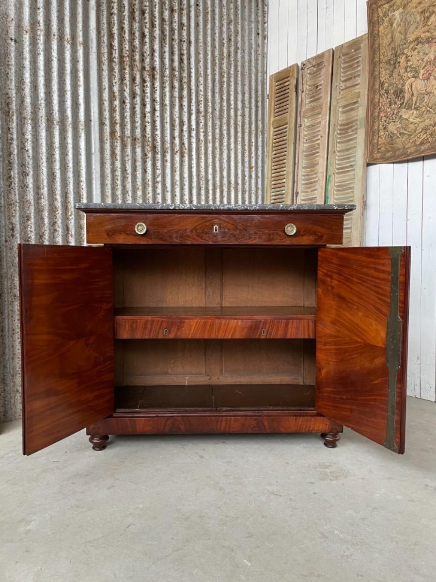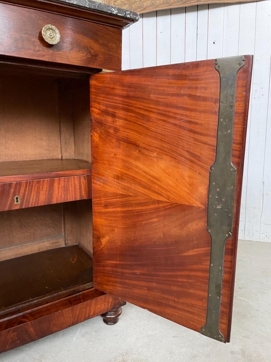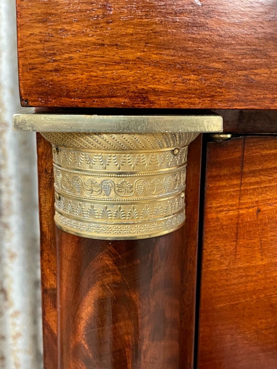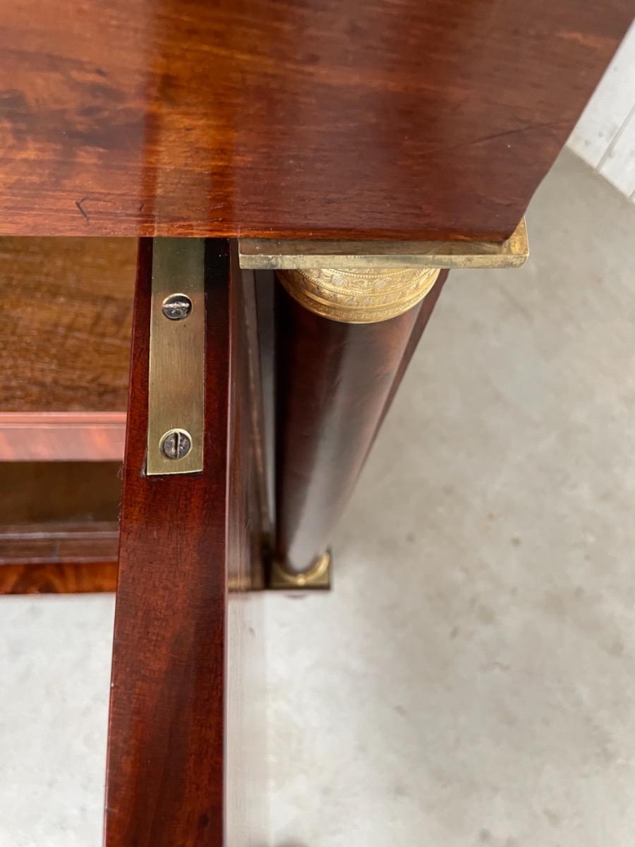 Mahonie epoque empire dressoir, lade in de kap en intern twee laden. St.Anna marmer gedekt. Half volle pilaren met vuur verguld messing kapitelen. Afm; H 111 cm B 114-122 cm D 42-50 cm Volledig nagezien, controle op houtworm; geen actieve worm, geen oude gaatjes. Dres-2303