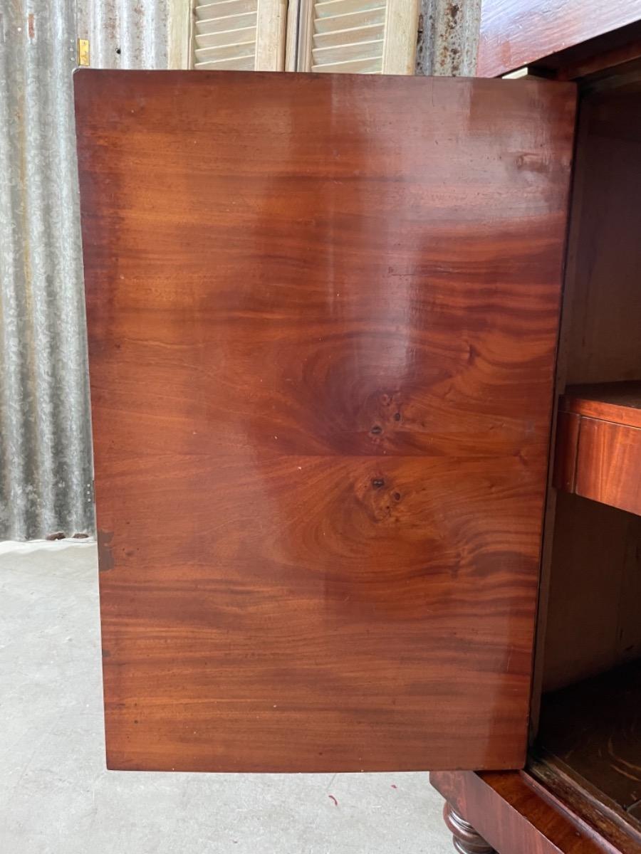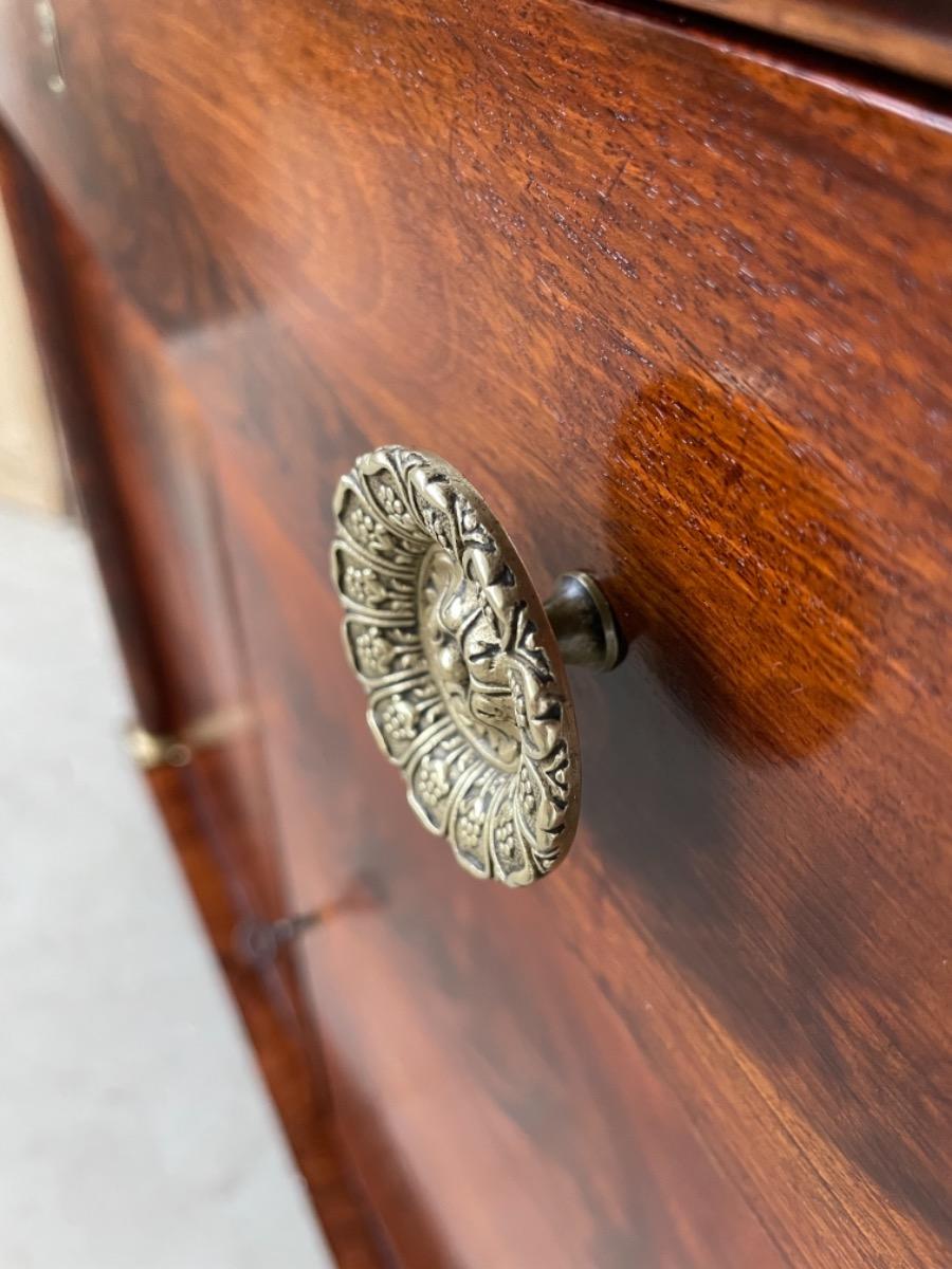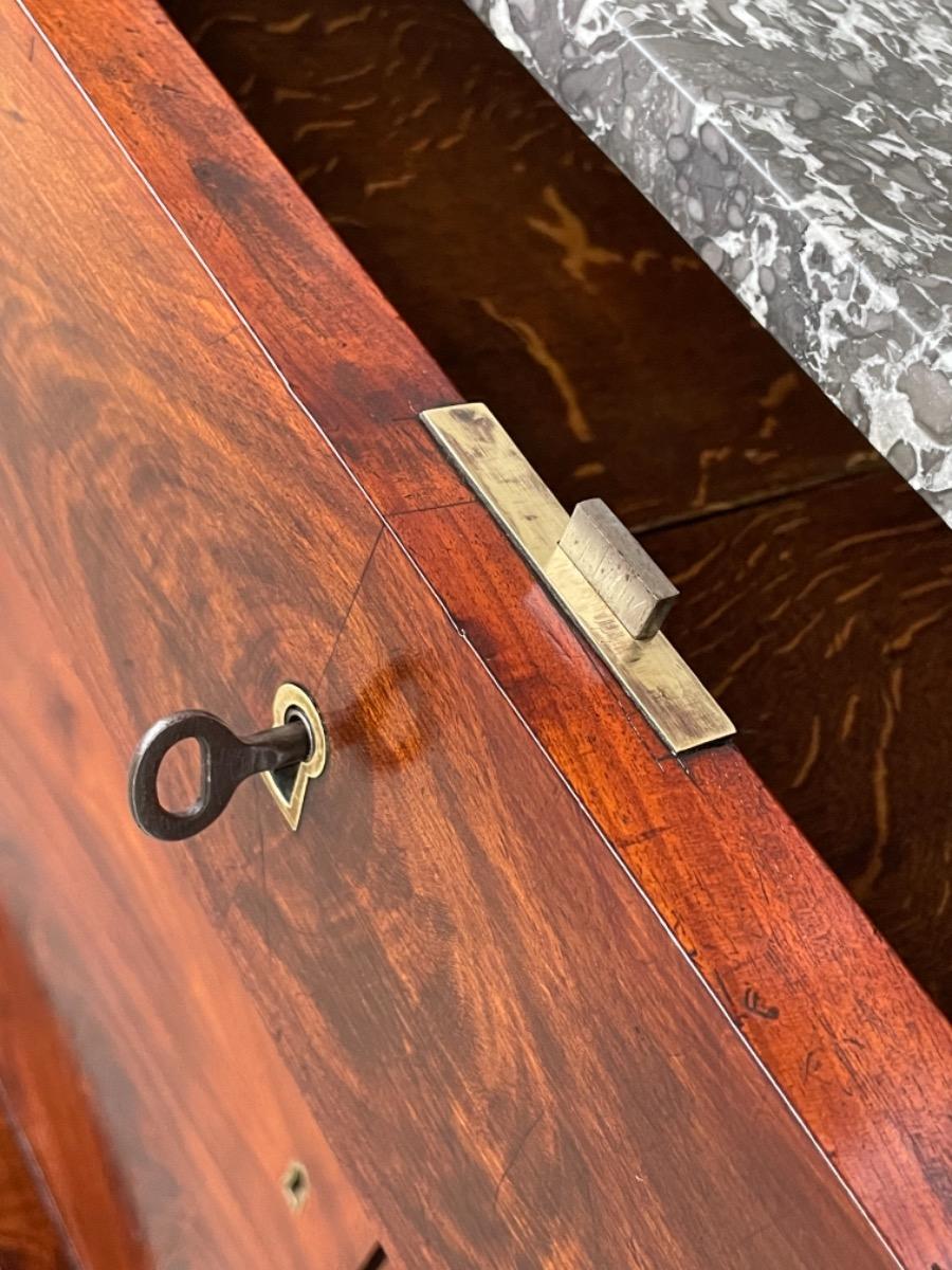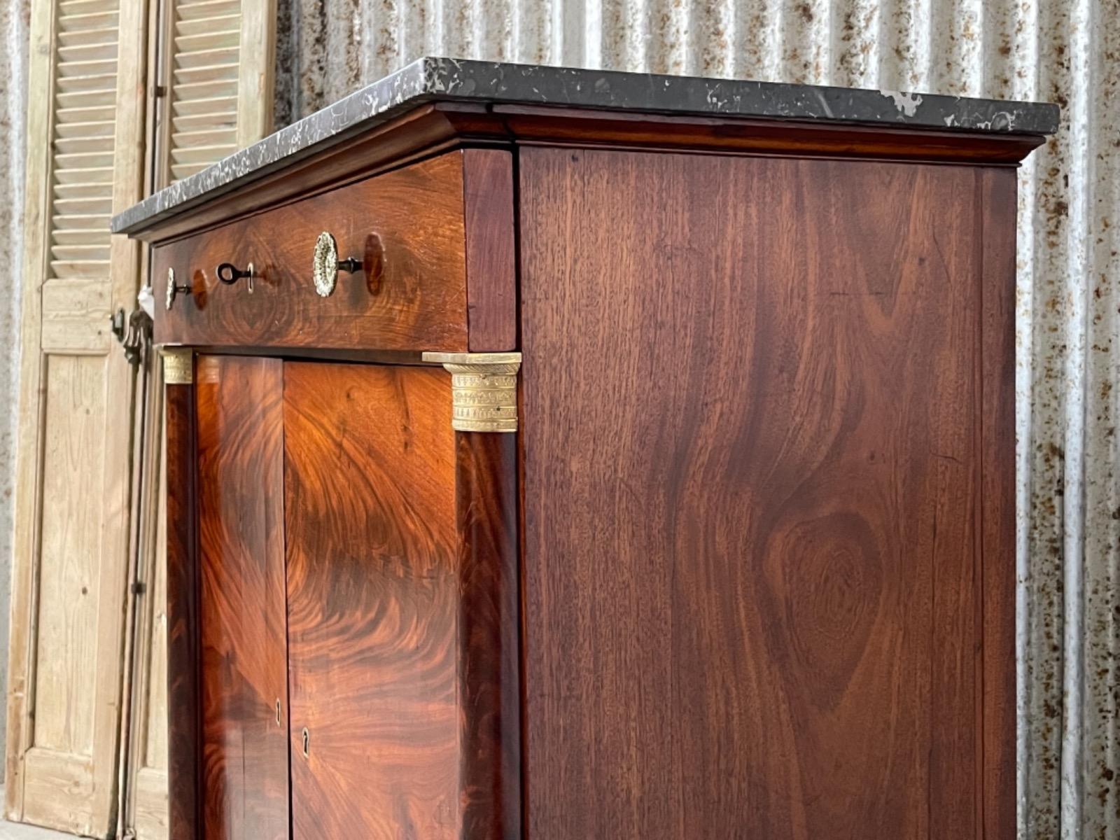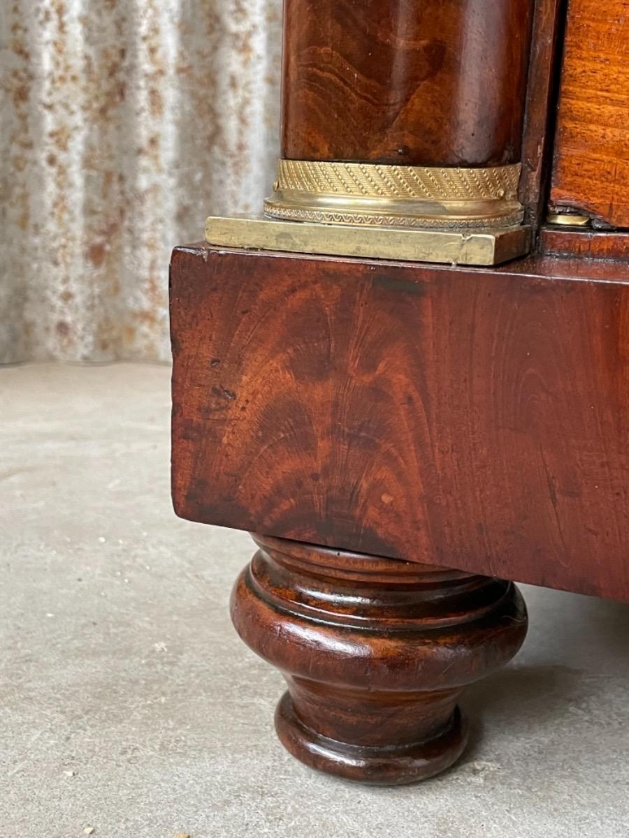 Mahonie epoque empire dressoir, lade in de kap en intern twee laden. St.Anna marmer gedekt. Half volle pilaren met vuur verguld messing kapitelen. Afm; H 111 cm B 114-122 cm D 42-50 cm Volledig nagezien, controle op houtworm; geen actieve worm, geen oude gaatjes. Dres-2303