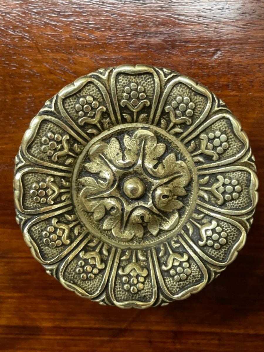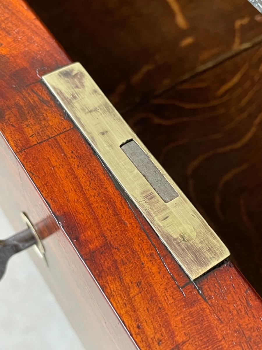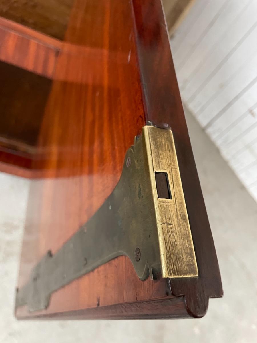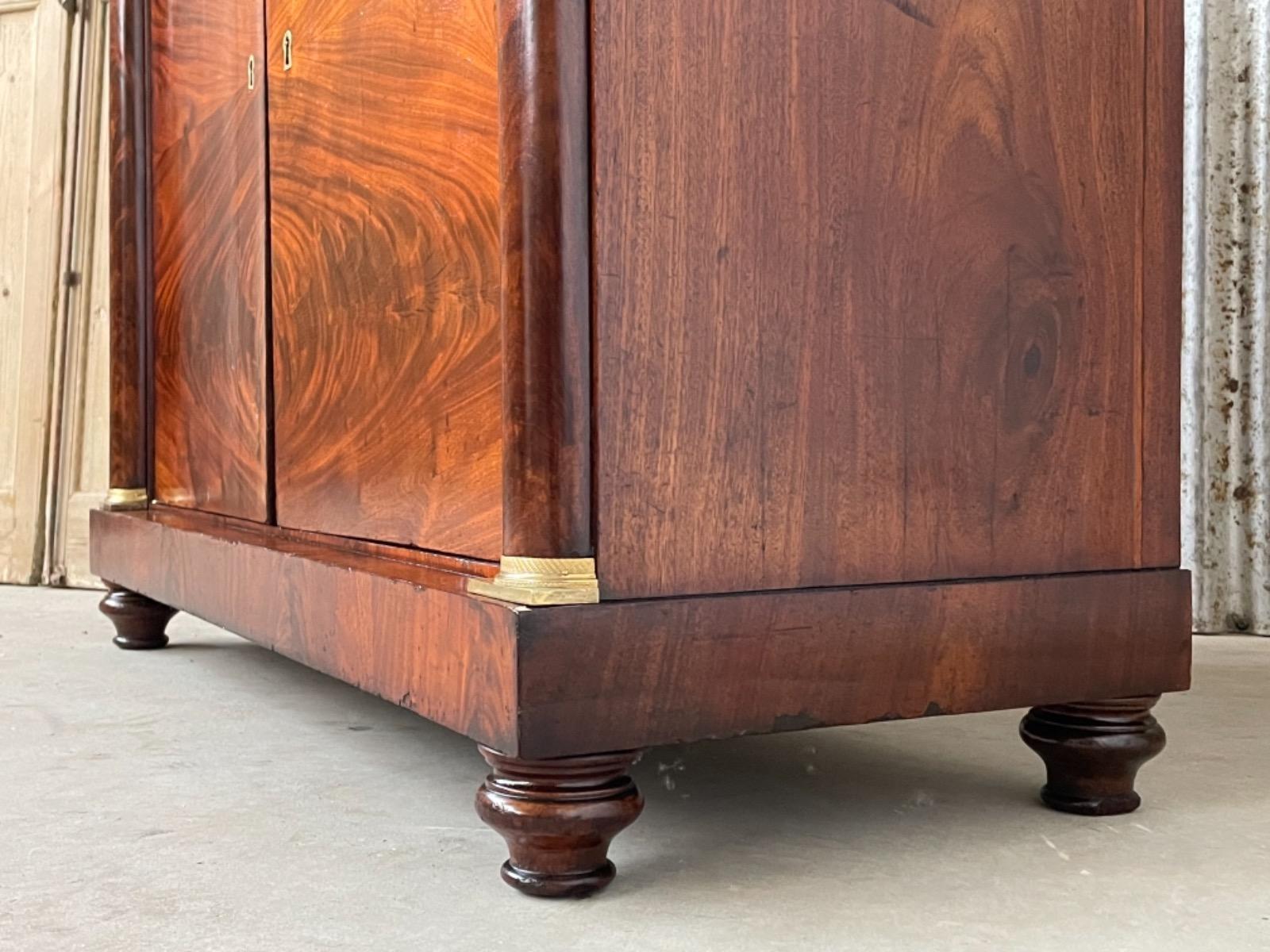 Mahonie epoque empire dressoir, lade in de kap en intern twee laden. St.Anna marmer gedekt. Half volle pilaren met vuur verguld messing kapitelen. Afm; H 111 cm B 114-122 cm D 42-50 cm Volledig nagezien, controle op houtworm; geen actieve worm, geen oude gaatjes. Dres-2303