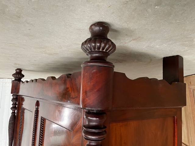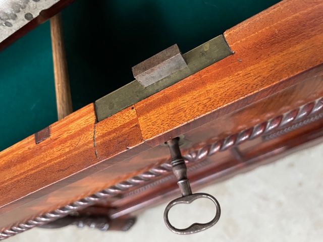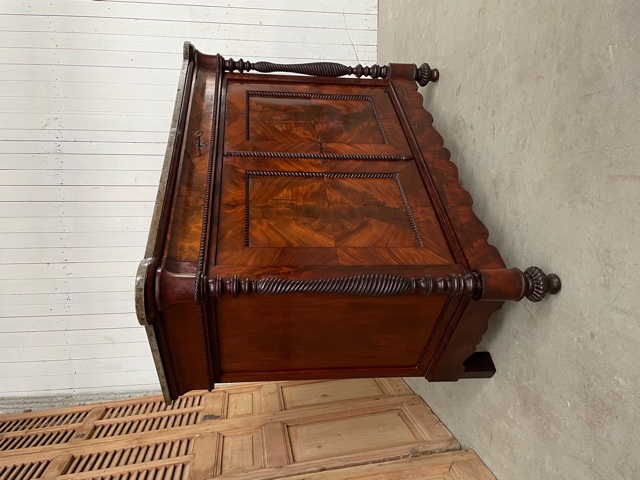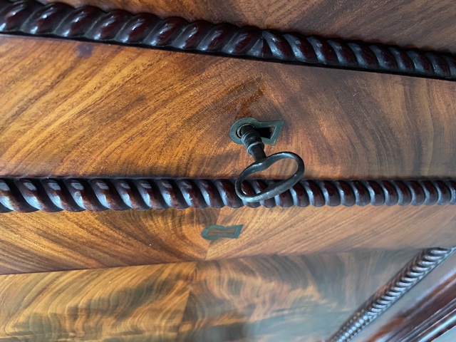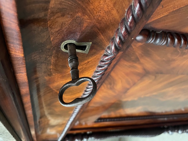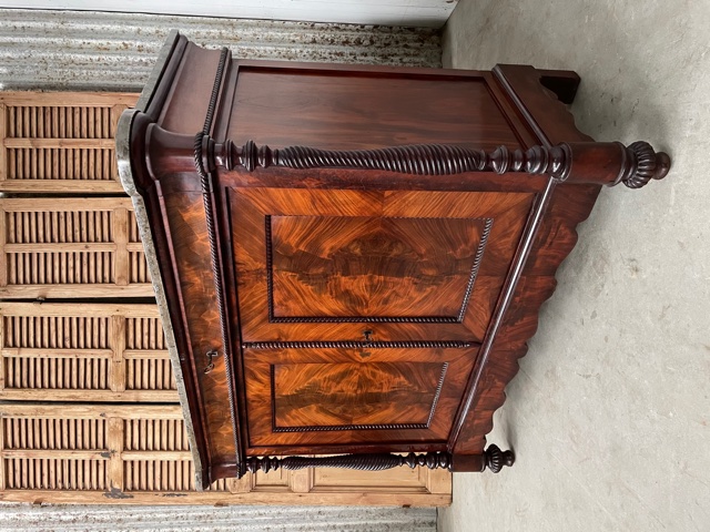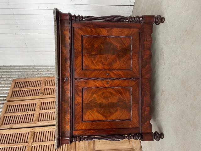 een brede lade met oorspronkelijk werkend slot en sleutel, daaronder twee deuren eveneens met oorspronkelijk en werkens slot met een sleutel. De panelen in de deuren zijn gespiegeld Cuba bloem mahonie. Daar achter een hele en een hale plank.