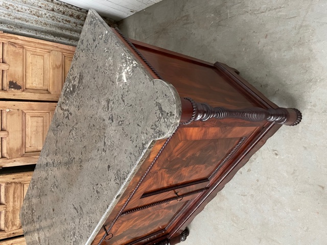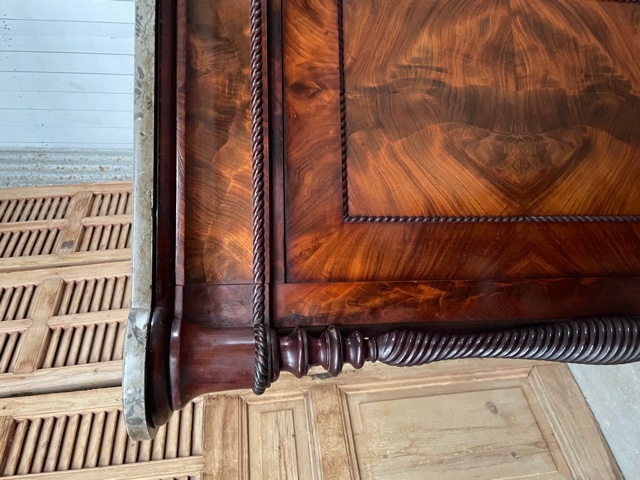 Onder her St. Anna marmer met fraaie rondingen op de hoeken dat gedragen wordt door gedraaide / getorste pilaren met snijwerk doorlopend op de voorpoten.
