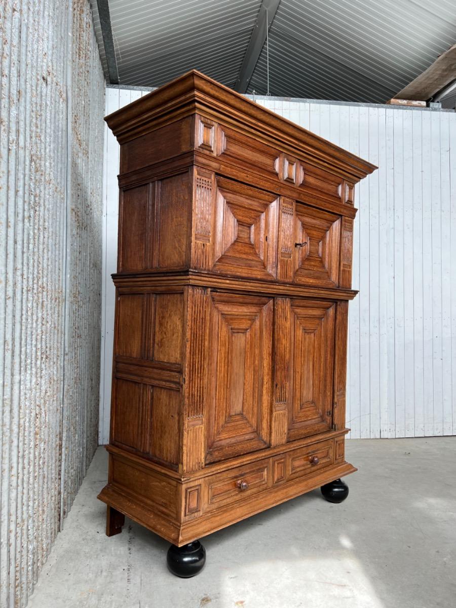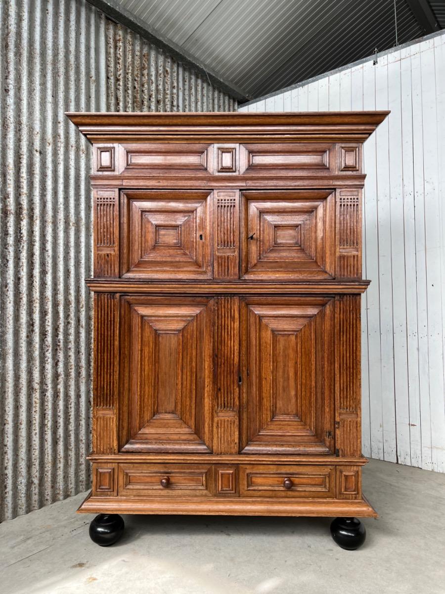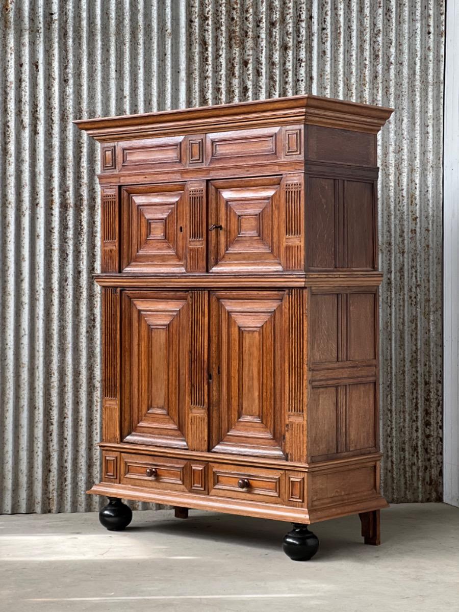 Dit fraaie meubel uit de eerste helft van de 17e eeuw is vrij uitzonderlijk sober doch sierlijk in details uitgevoerd.