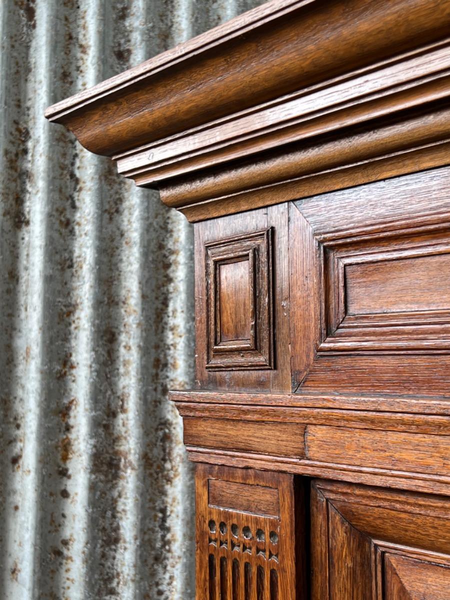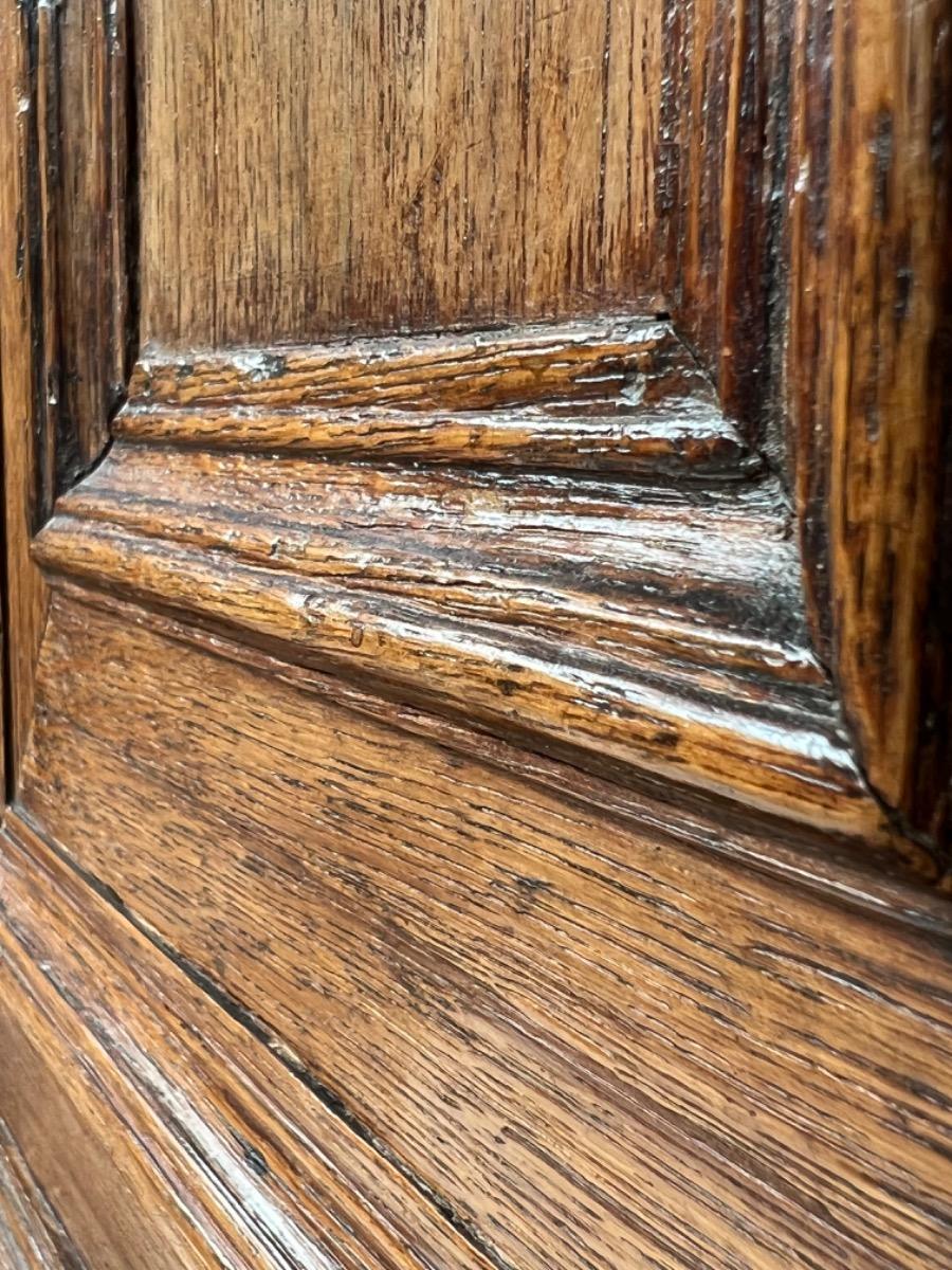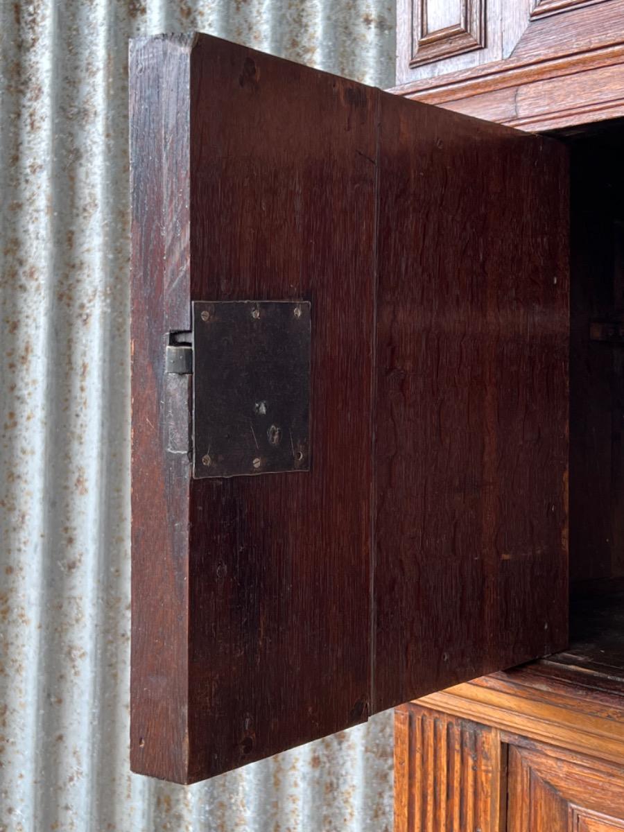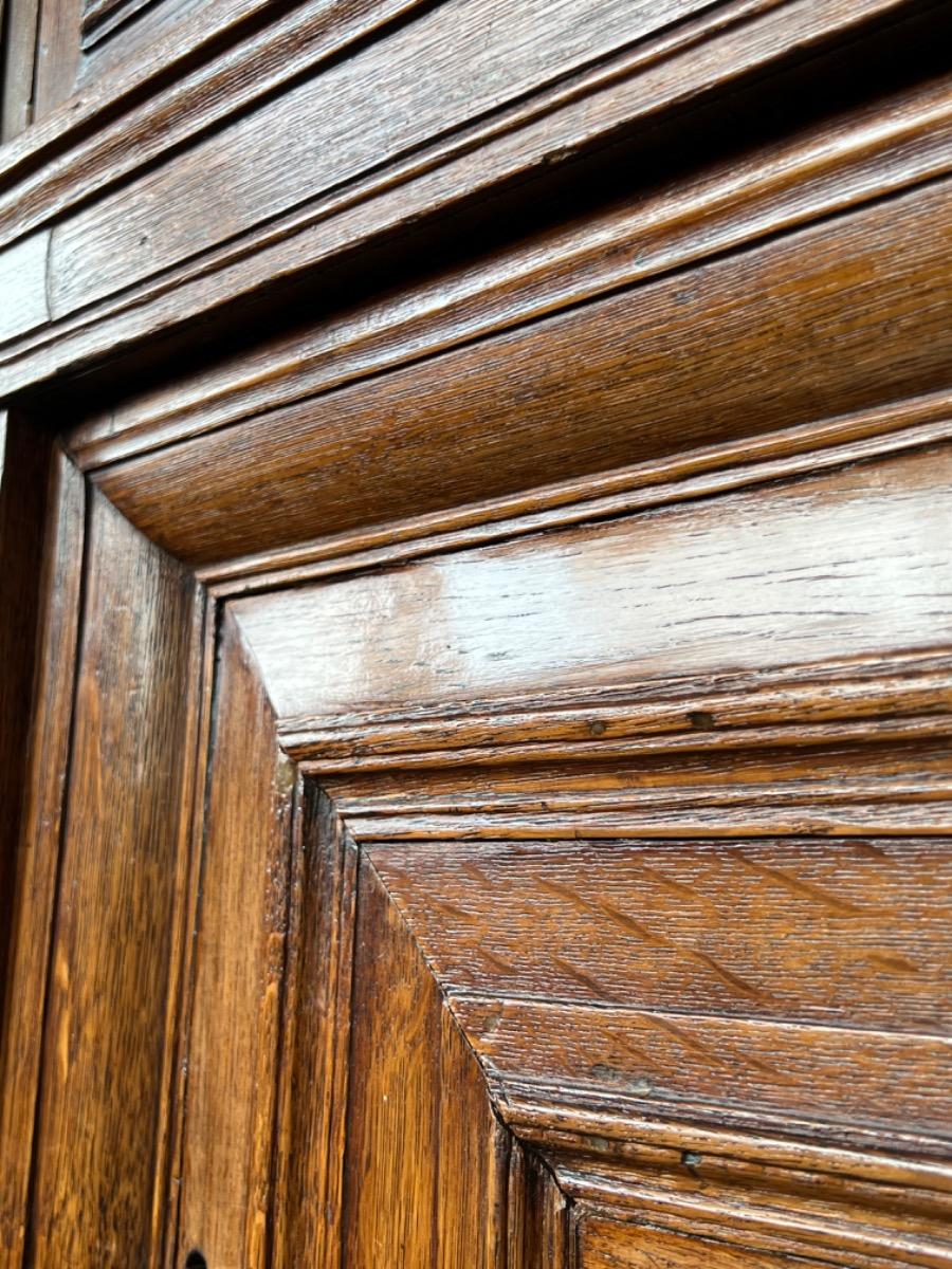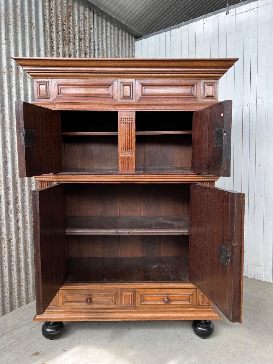 Meubel bestaat uit twee delen, heeft een prachtige, zeer warme patina van vroege wasafwerking. Kleine vroege restauraties.