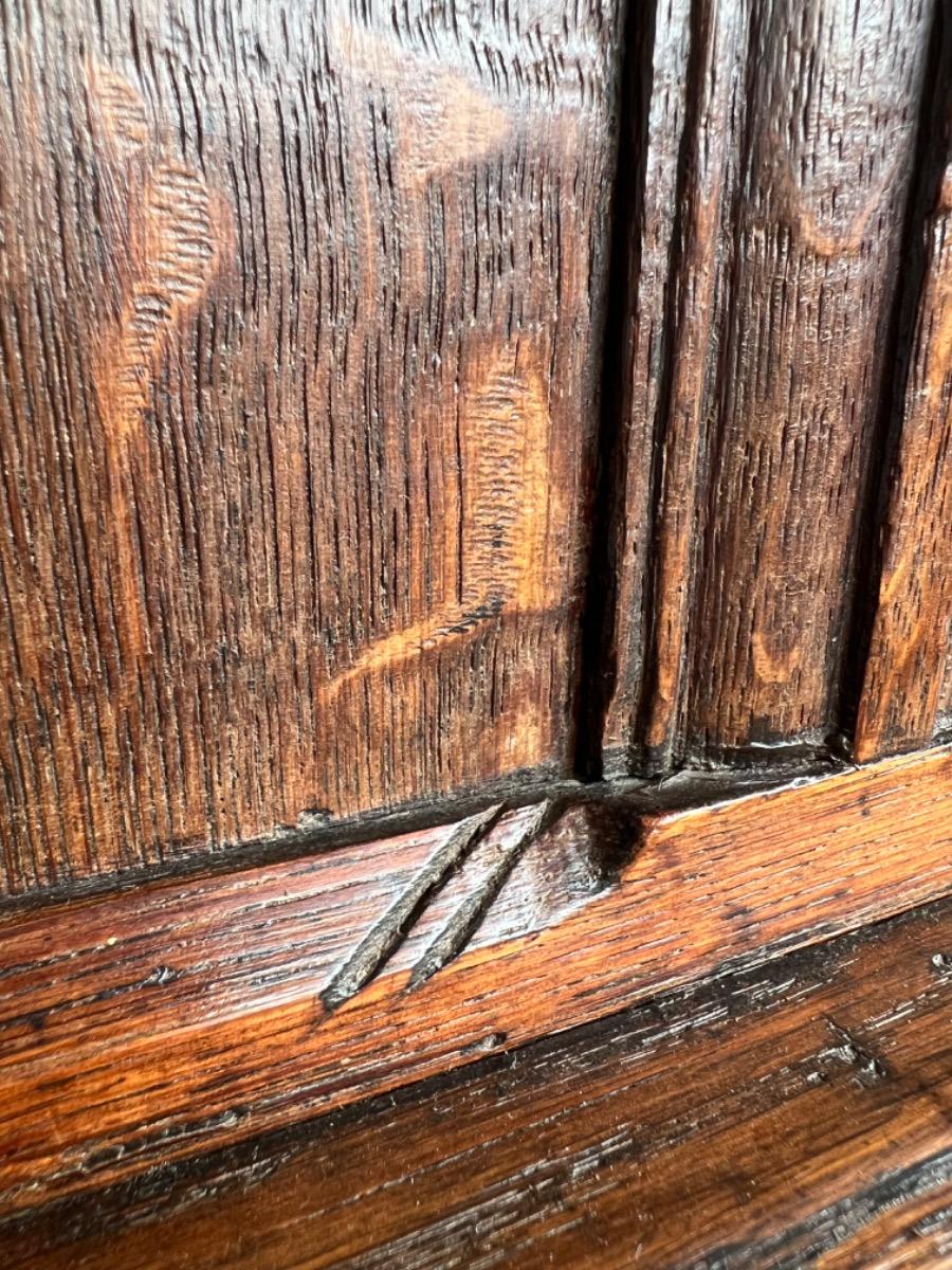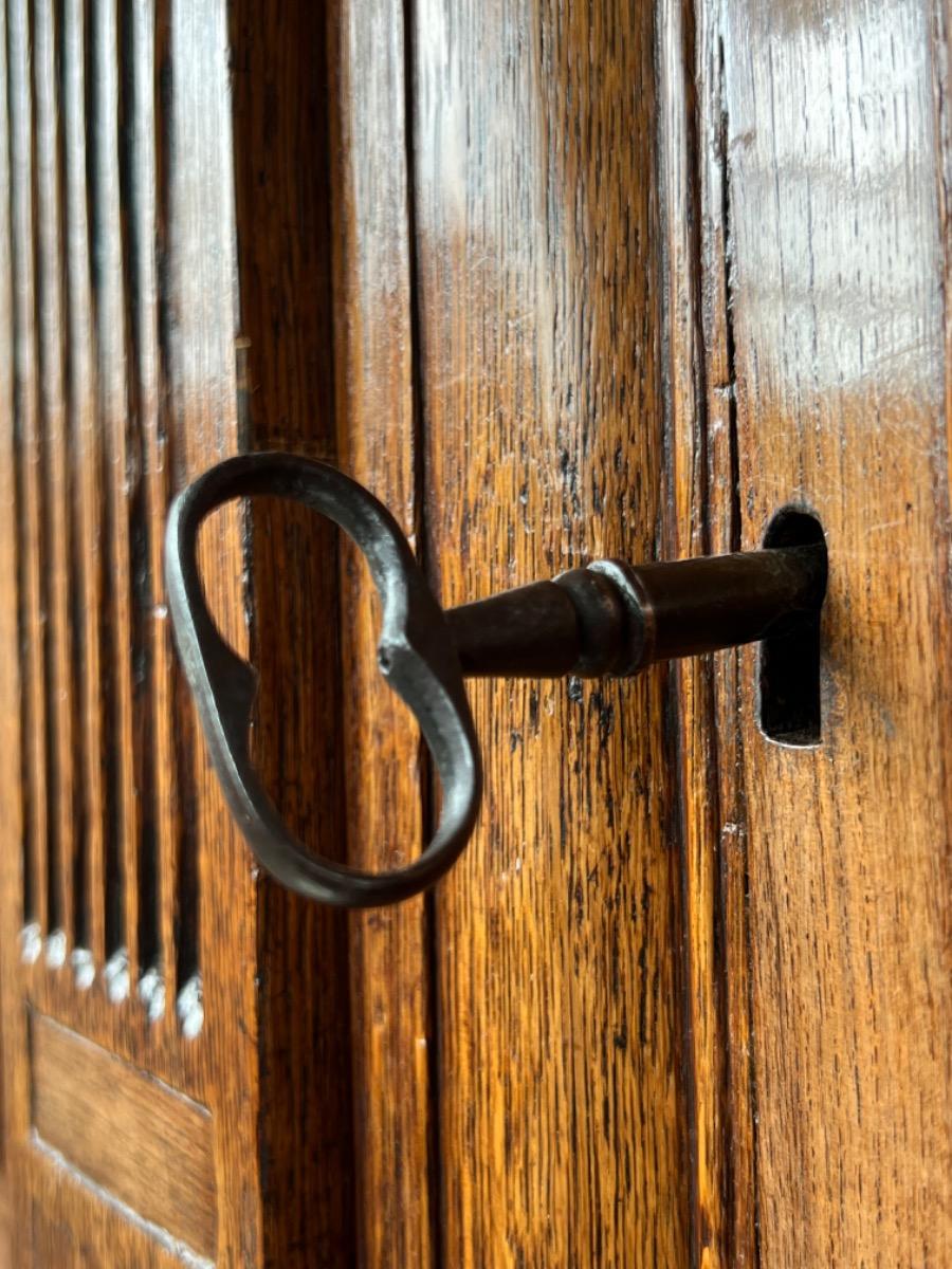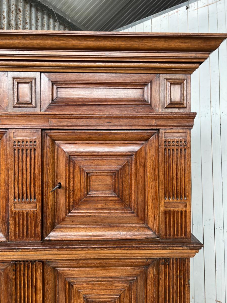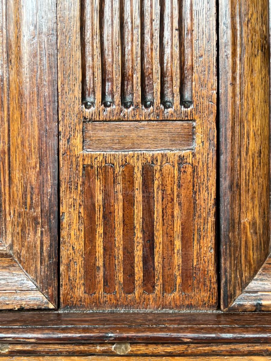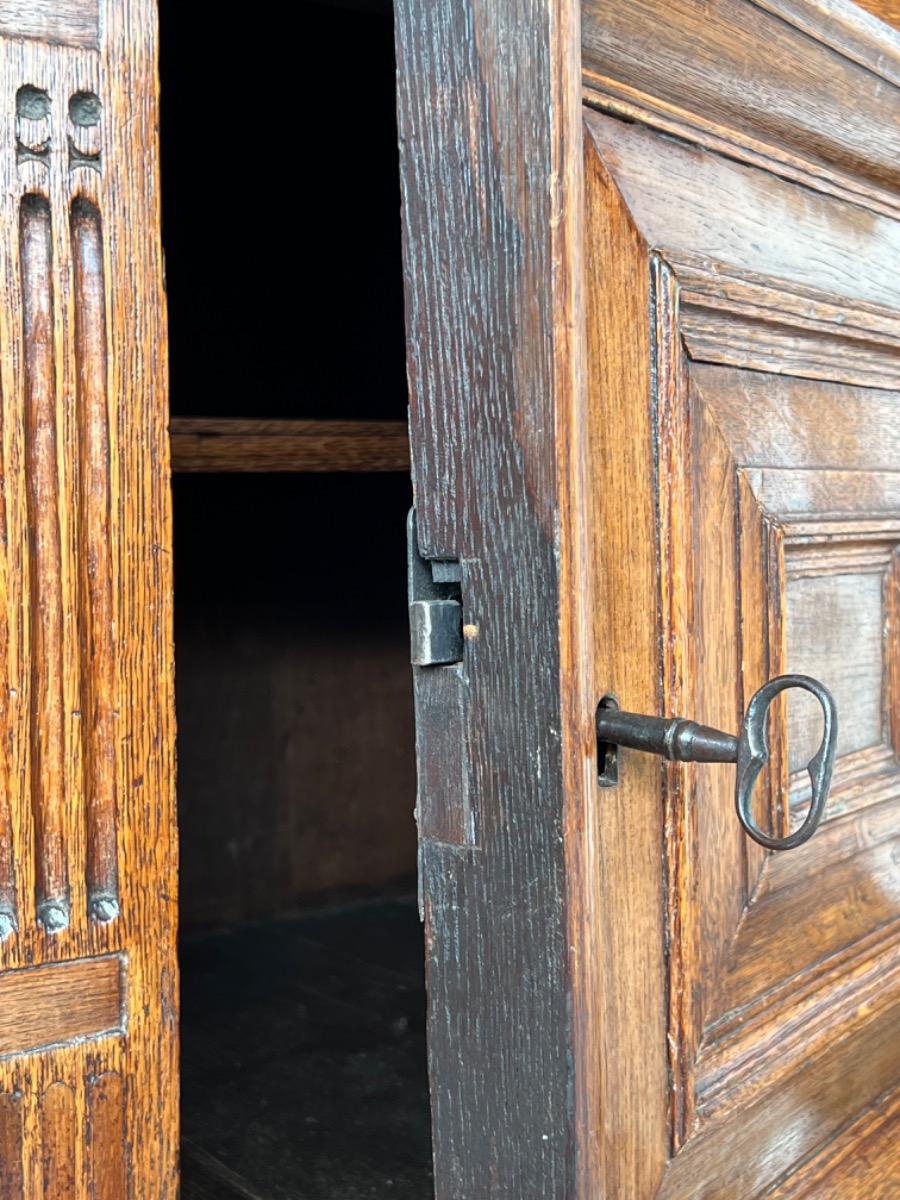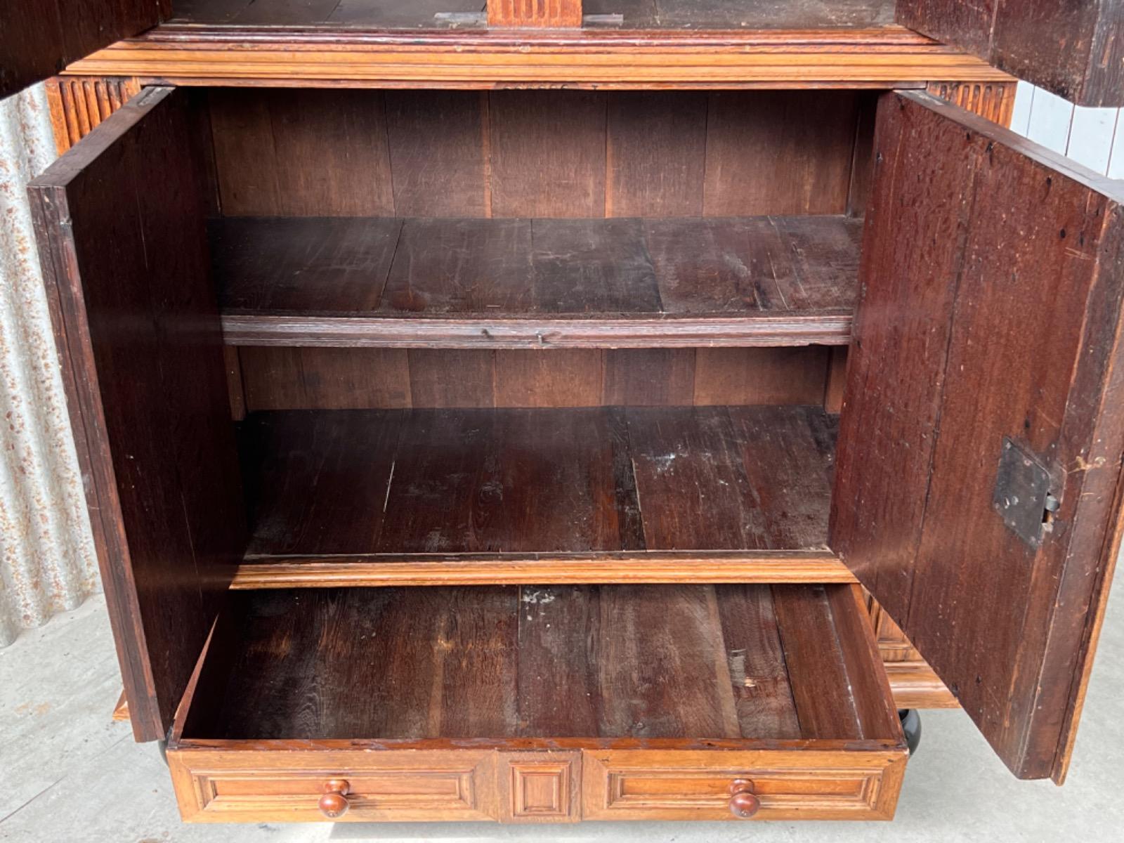 Meubel bestaat uit twee delen, heeft een prachtige, zeer warme patina van vroege wasafwerking. Kleine vroege restauraties.