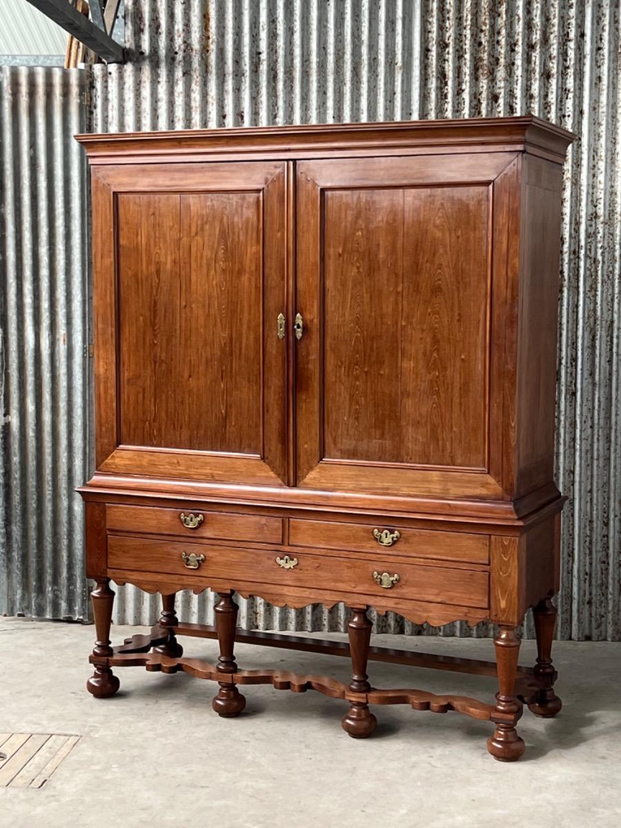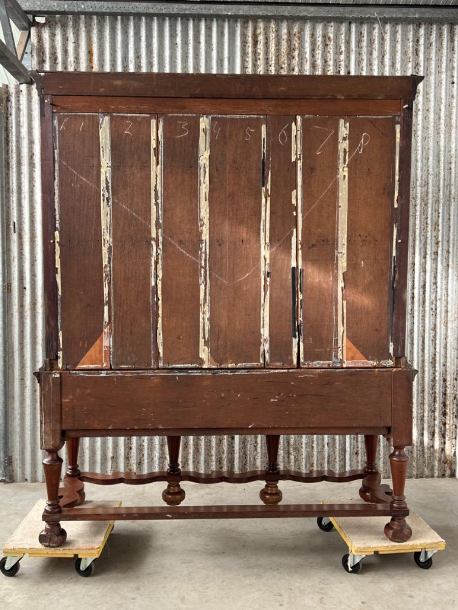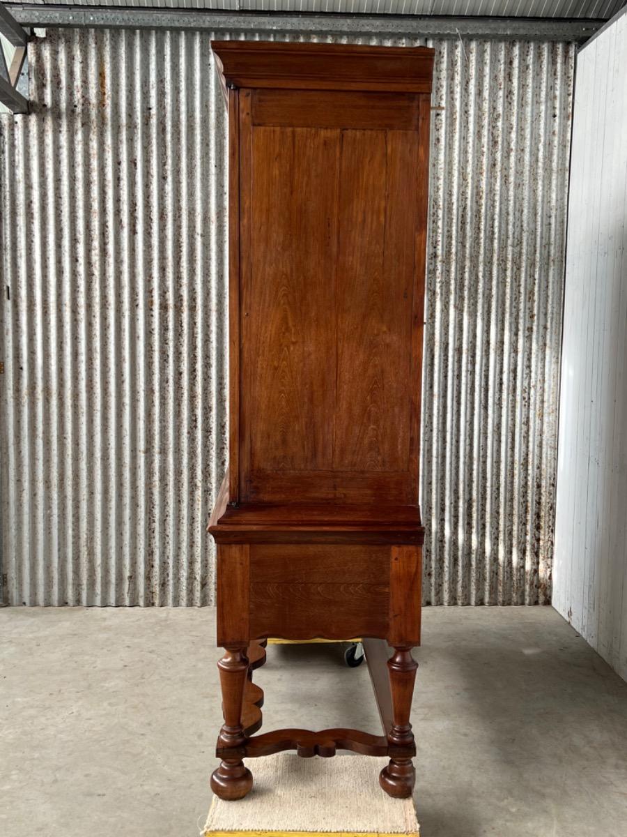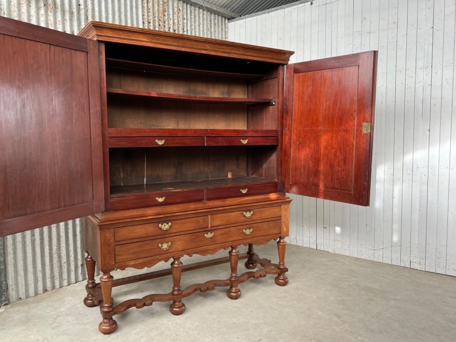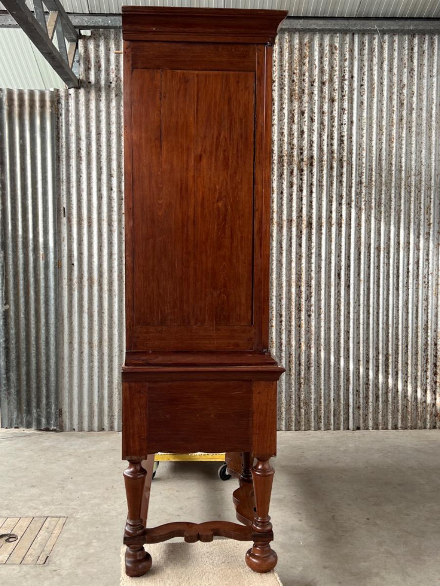 Hollands model vroeg 18e eeuws Rode Kabbes (andrina) of padouk kruisvoetkabinet op vier glad ronde ‘foedraal’ of "paraplu poten met elkaar verbonden middels een kruisverband. Door de Achter de twee deuren 2 vaste planken met in het midden 2 laden en onder 3 laden. Bovenin twee lossen planken. Oorspronkelijke (eiken) achterwand en lade bodems. Beslag op de binnen laden verguld en oorspronkelijk. (!! Lade trekkers worden van de 3 onderste laden onder de deuren nog vervangen door hetzelfde model als binnen in!!) Deurslot en sleutel werkend! Warme tint / patina, mooie diepe kleur en glans. Geheel is in twee delen. Hollands meubel, circa 1700. Afm; H= 218 cm. B= 169 - 180 cm. (Breed - breedst) D= 57 - 61 cm. (Diep - diepst) Onlangs grondig nagelopen op losse delen van constructie en fineer. Geen active houtworm aangetroffen op 17/11/2024. Kabi-2857~