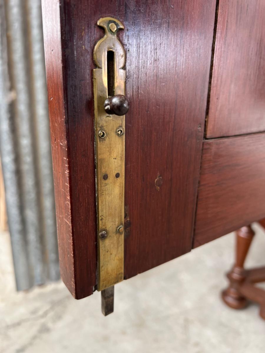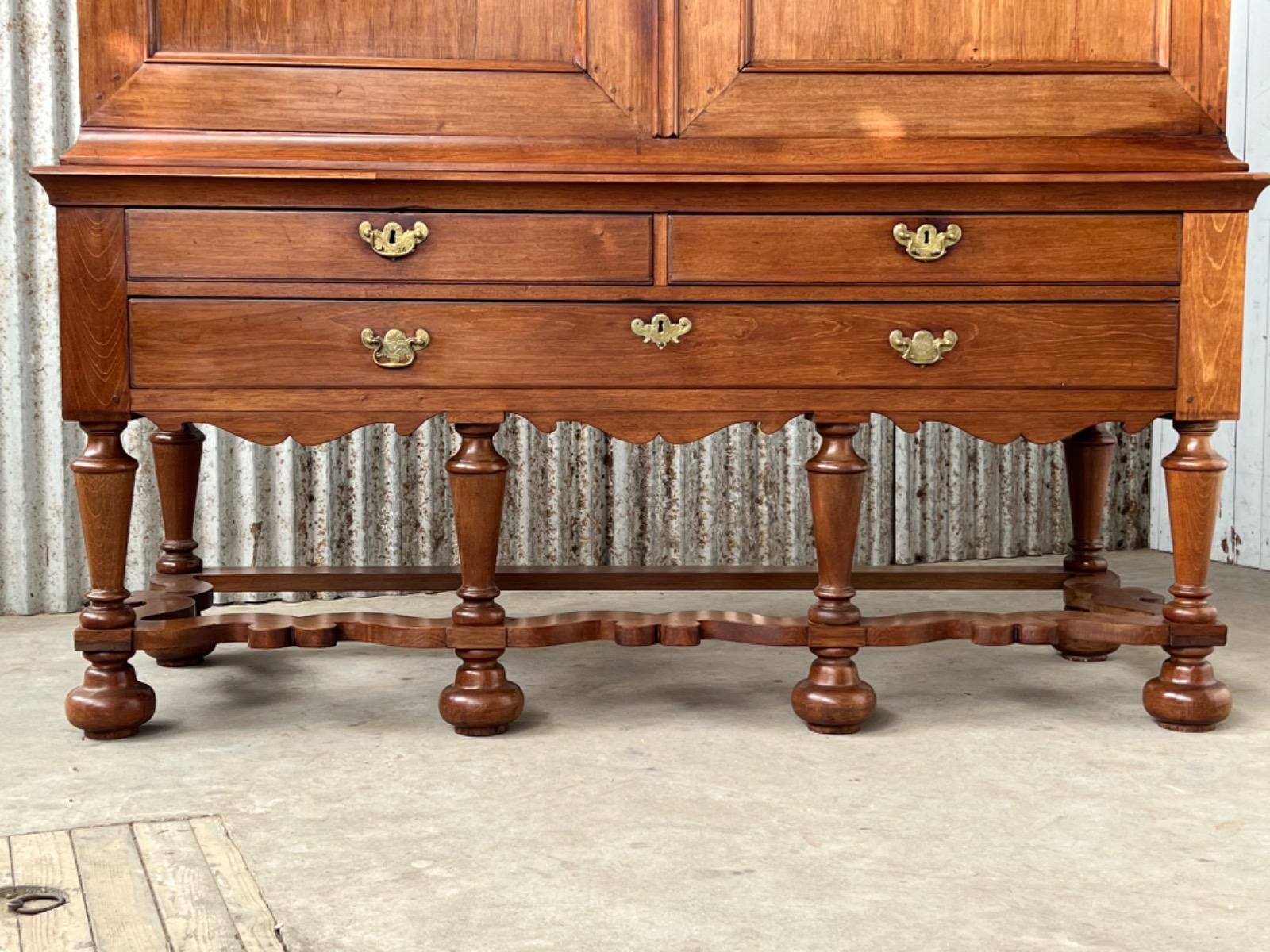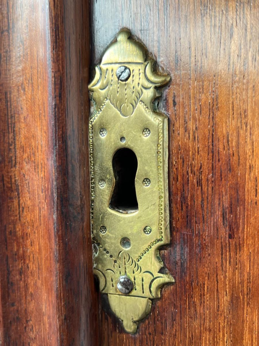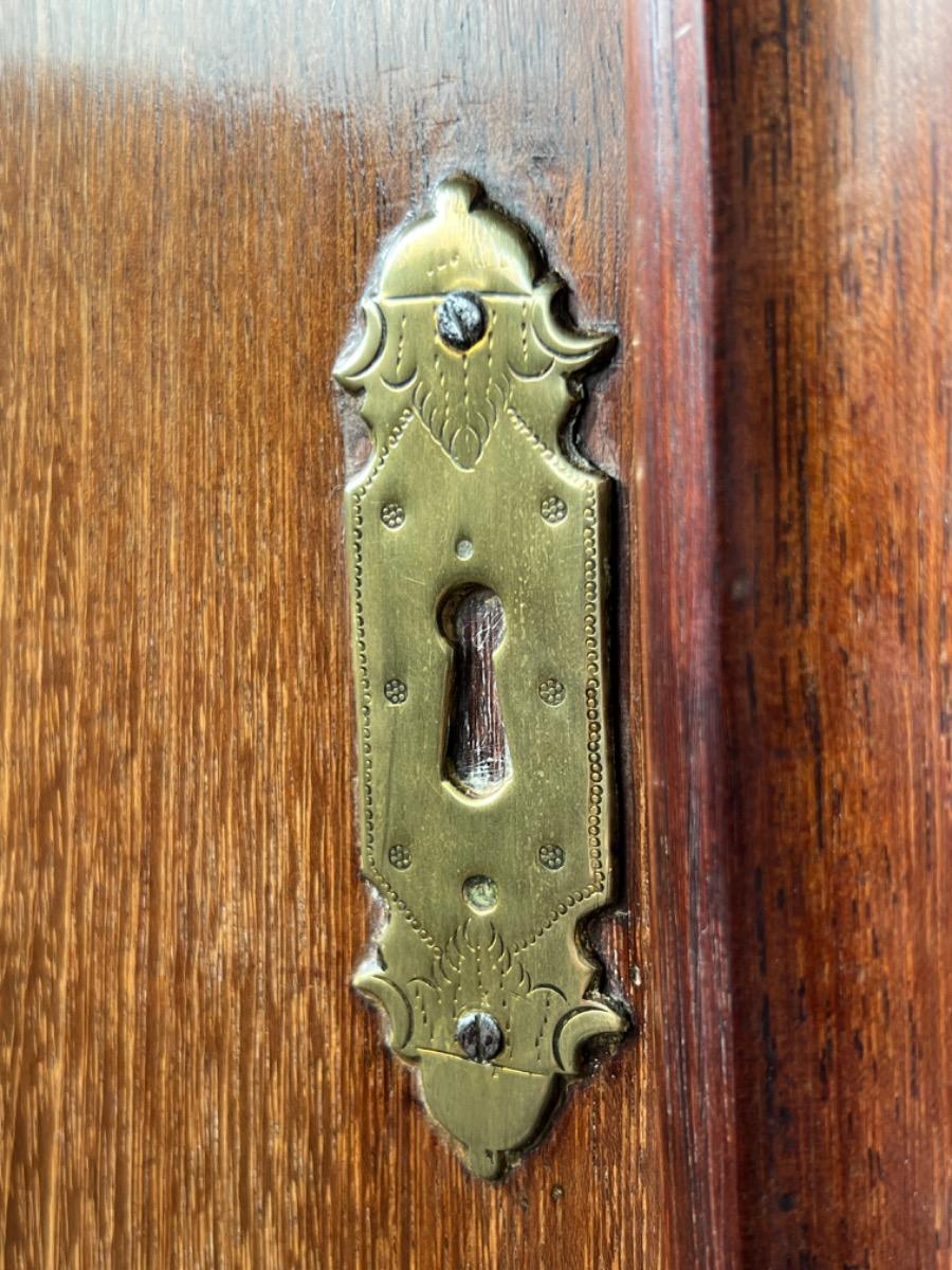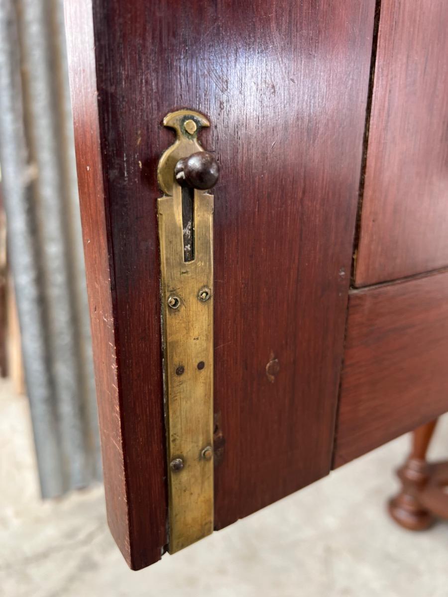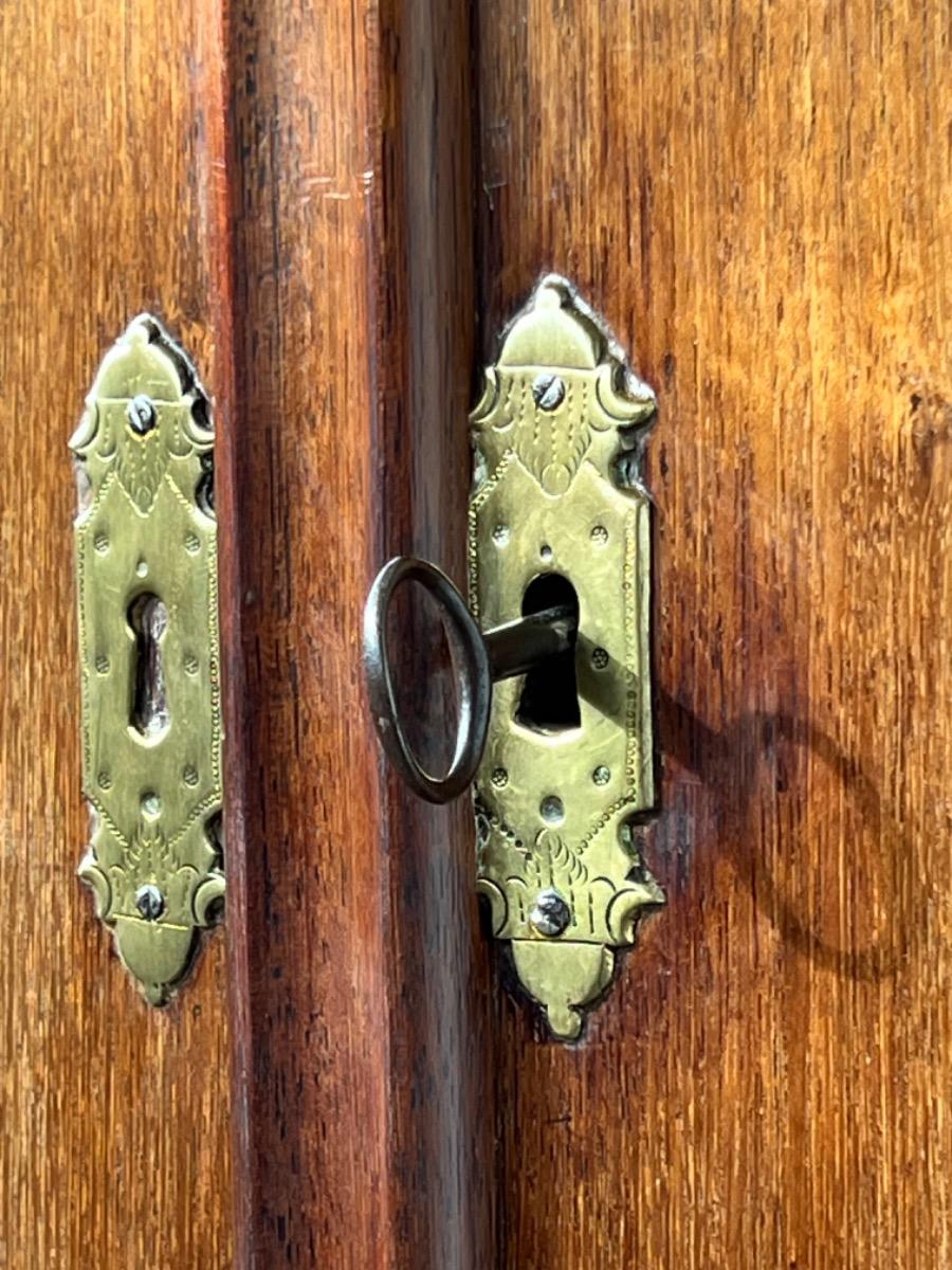 Hollands model vroeg 18e eeuws Rode Kabbes (andrina) of padouk kruisvoetkabinet op vier glad ronde ‘foedraal’ of "paraplu poten met elkaar verbonden middels een kruisverband. Door de Achter de twee deuren 2 vaste planken met in het midden 2 laden en onder 3 laden. Bovenin twee lossen planken. Oorspronkelijke (eiken) achterwand en lade bodems. Beslag op de binnen laden verguld en oorspronkelijk. (!! Lade trekkers worden van de 3 onderste laden onder de deuren nog vervangen door hetzelfde model als binnen in!!) Deurslot en sleutel werkend! Warme tint / patina, mooie diepe kleur en glans. Geheel is in twee delen. Hollands meubel, circa 1700. Afm; H= 218 cm. B= 169 - 180 cm. (Breed - breedst) D= 57 - 61 cm. (Diep - diepst) Onlangs grondig nagelopen op losse delen van constructie en fineer. Geen active houtworm aangetroffen op 17/11/2024. Kabi-2857~