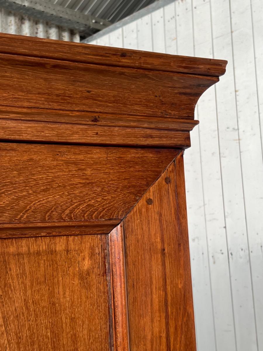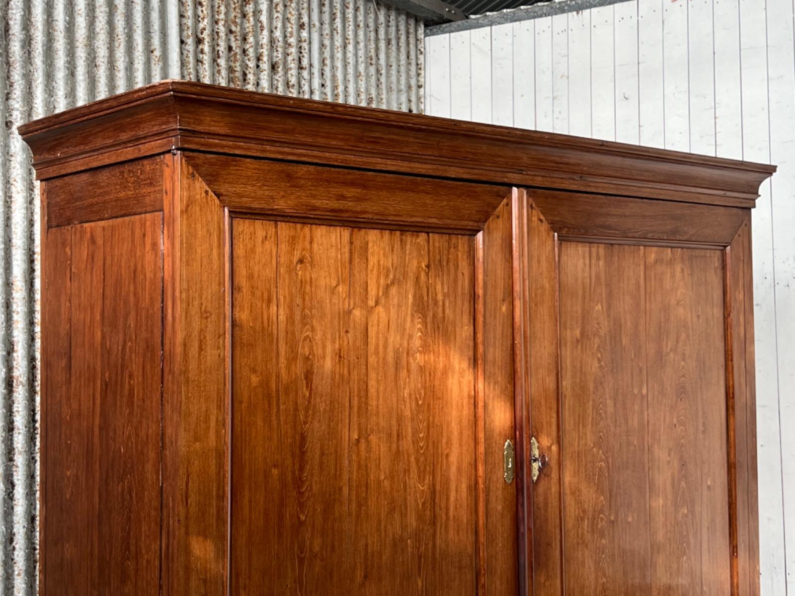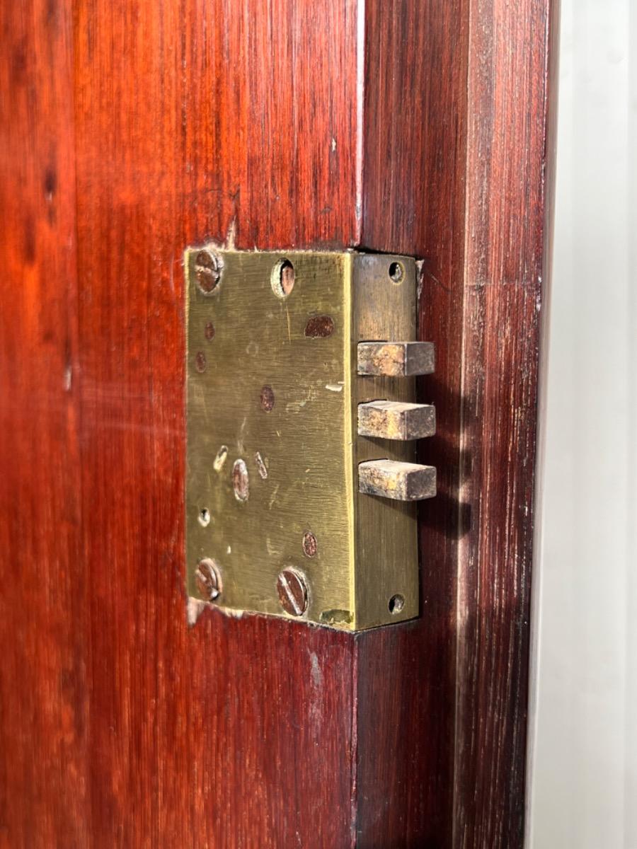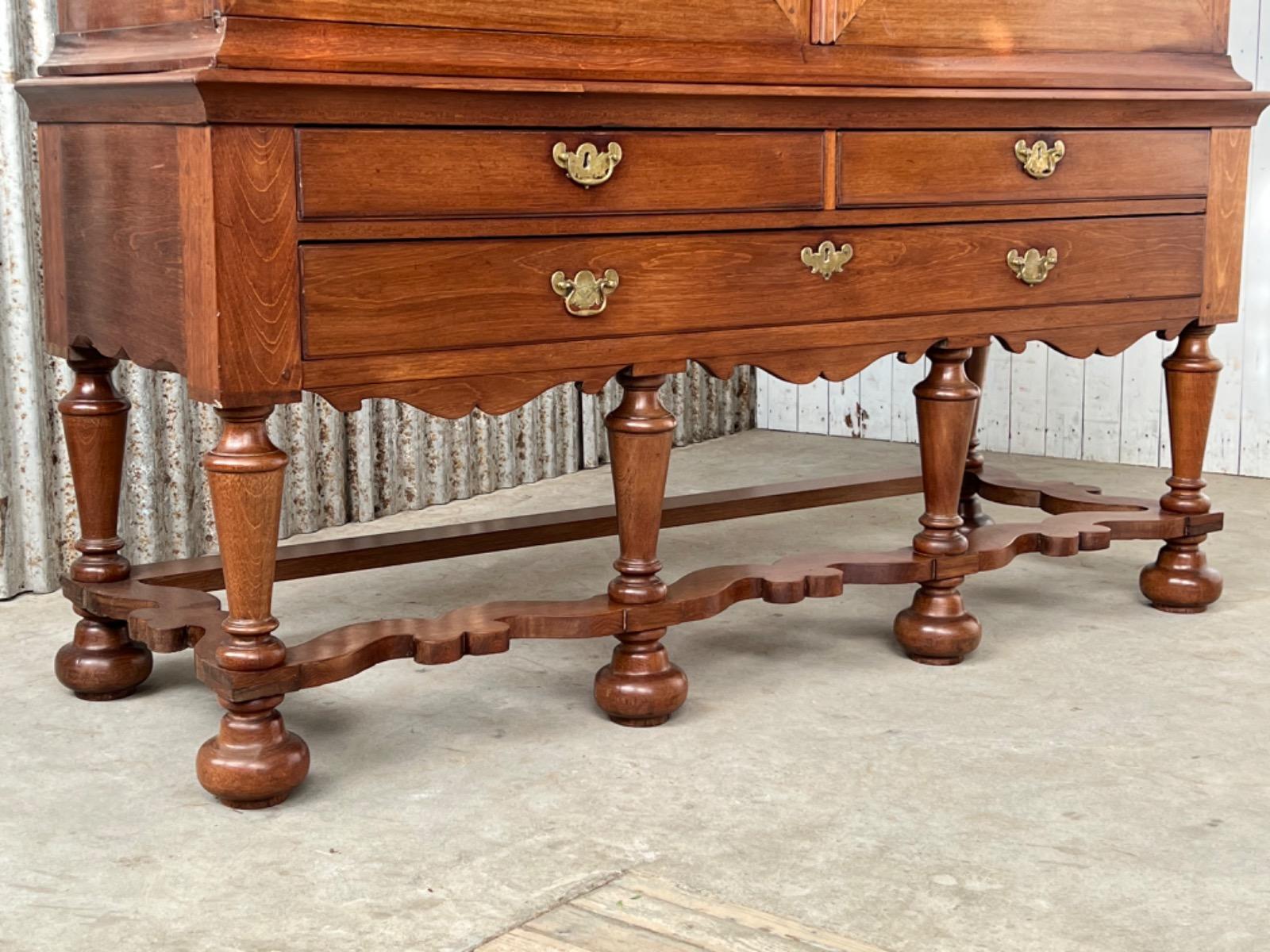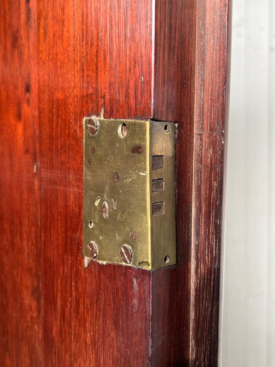 Hollands model vroeg 18e eeuws Rode Kabbes (andrina) of padouk kruisvoetkabinet op vier glad ronde ‘foedraal’ of "paraplu poten met elkaar verbonden middels een kruisverband. Door de Achter de twee deuren 2 vaste planken met in het midden 2 laden en onder 3 laden. Bovenin twee lossen planken. Oorspronkelijke (eiken) achterwand en lade bodems. Beslag op de binnen laden verguld en oorspronkelijk. (!! Lade trekkers worden van de 3 onderste laden onder de deuren nog vervangen door hetzelfde model als binnen in!!) Deurslot en sleutel werkend! Warme tint / patina, mooie diepe kleur en glans. Geheel is in twee delen. Hollands meubel, circa 1700. Afm; H= 218 cm. B= 169 - 180 cm. (Breed - breedst) D= 57 - 61 cm. (Diep - diepst) Onlangs grondig nagelopen op losse delen van constructie en fineer. Geen active houtworm aangetroffen op 17/11/2024. Kabi-2857~