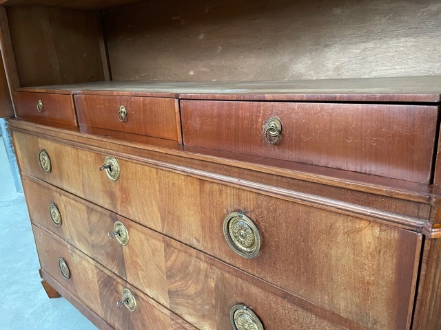Enkel de achterwand van de bovenkast is in het verleden vervangen en bestaat uit 1 deel (wat als voor deel heeft dat het niet los krimpt)