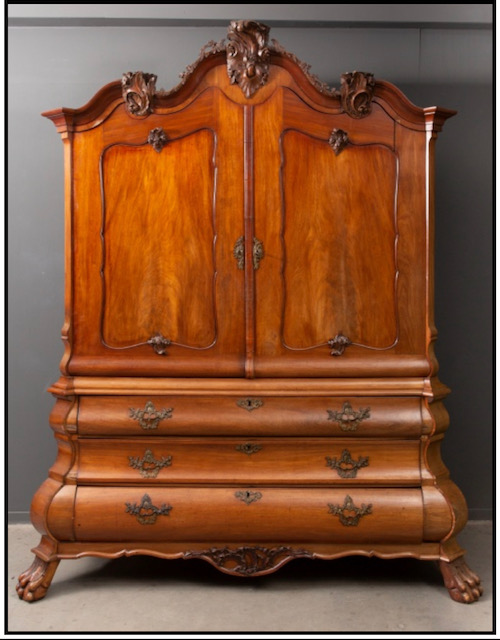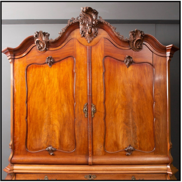 Mahonie kabinet, de kap en deuren bekroond door gesneden houten ornamenten, drie lades in de dubbelgebogen onderkast, staand op bolklauwpoten, Louis Quinze