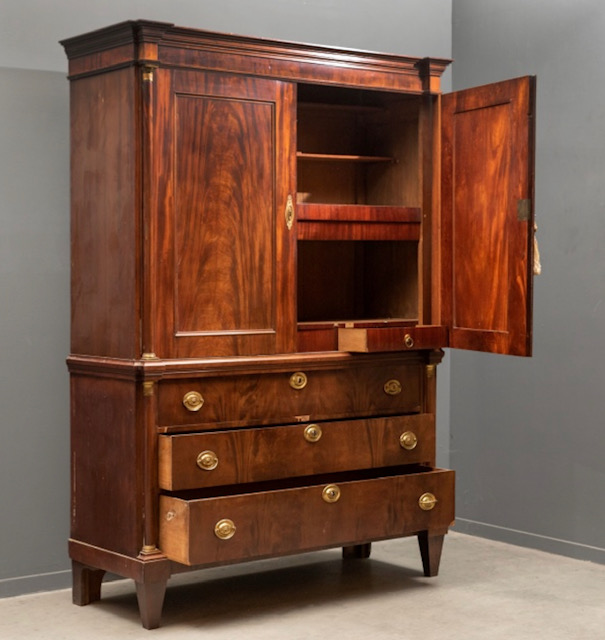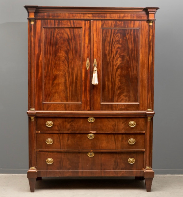 Boven de drie laden twee deuren geflankeerd door halfzuilen, staand op taps toelopende poten. De drie laden voorzien van ovaal laoen koper beslag (oorspronkelijk). Vrij klein model.