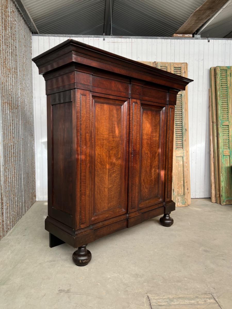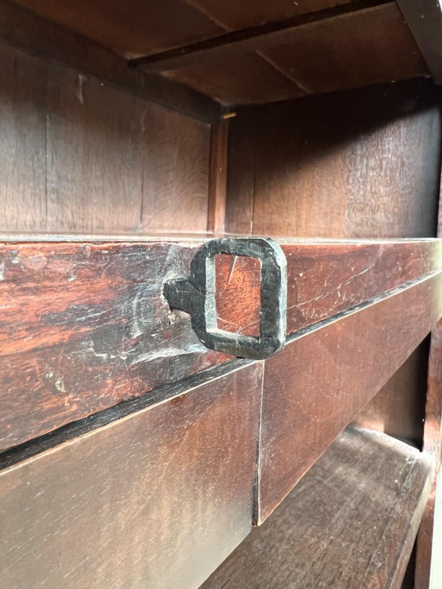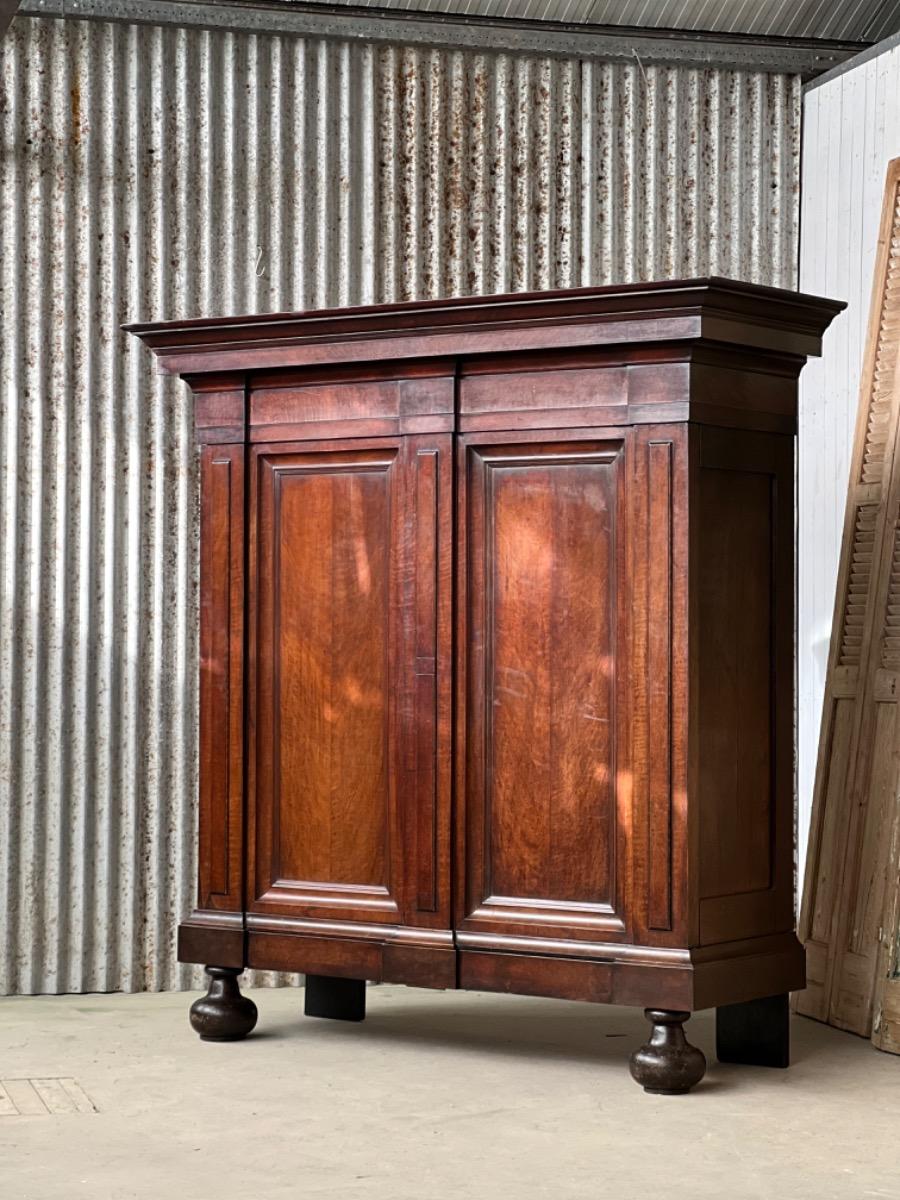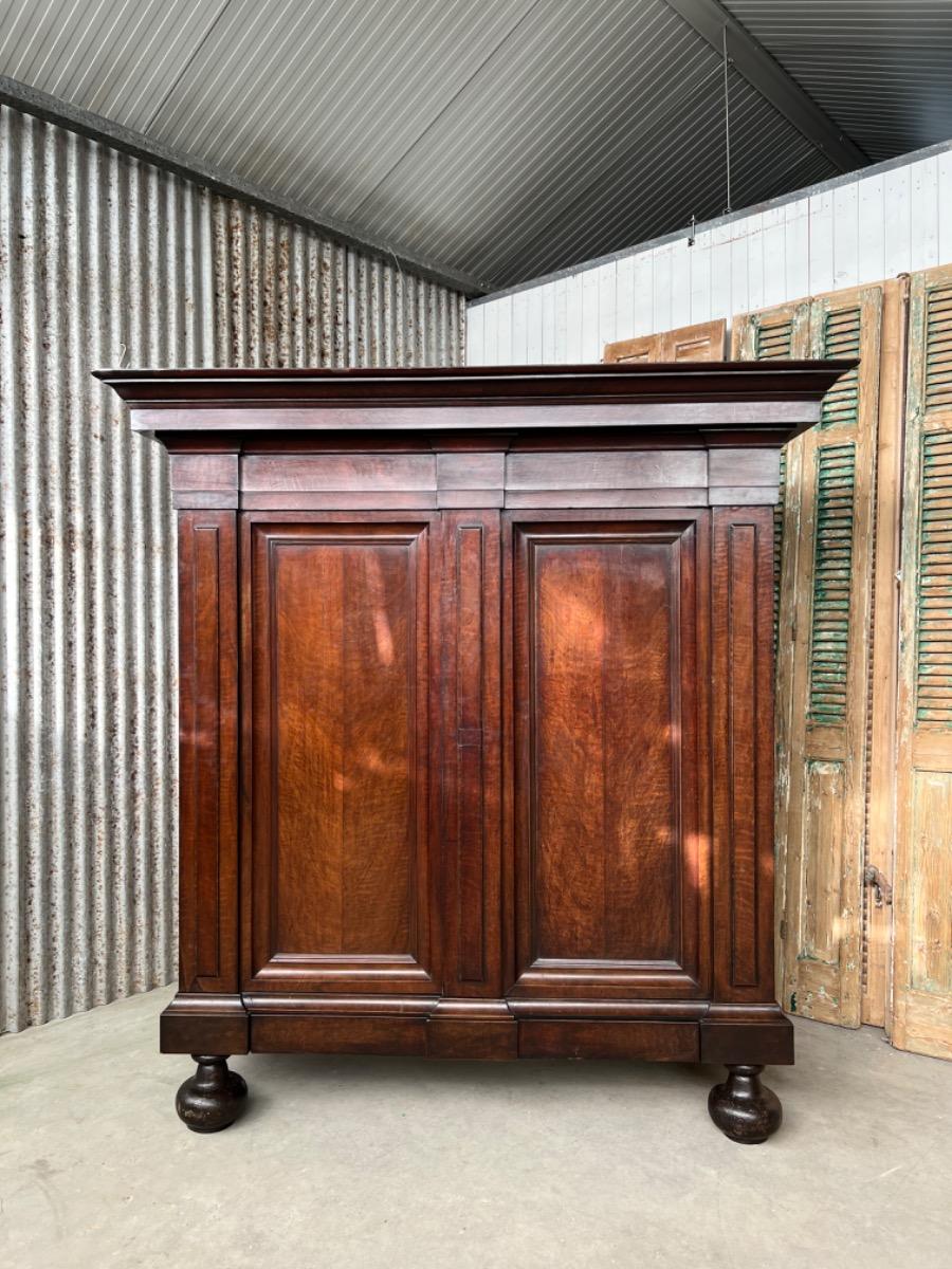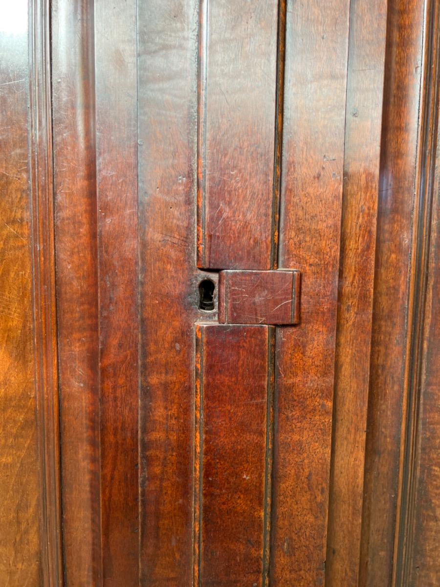 Notenhouten Notaris of Pastoors kast. 2e-3e kwart 18e eeuw. Grote overhangende en rijk geprofileerde kap met daaronder twee flinke deuren met evenals de zijden een panel.