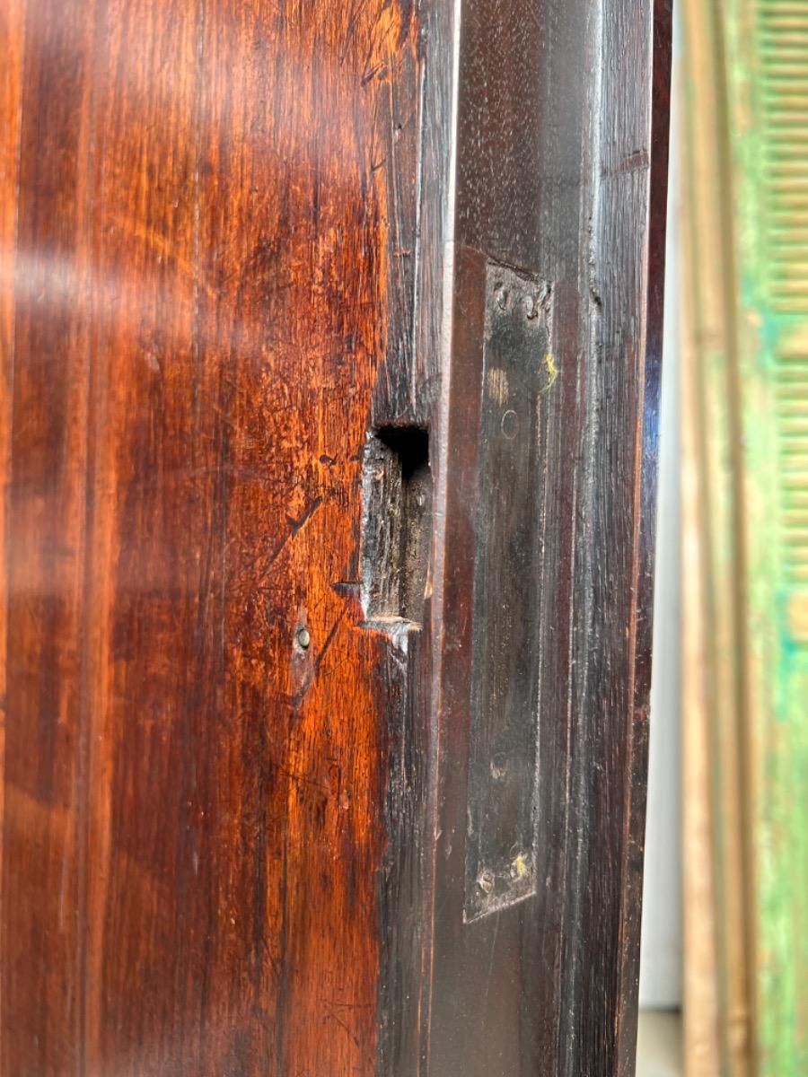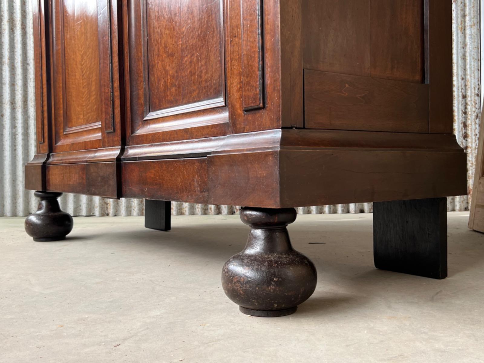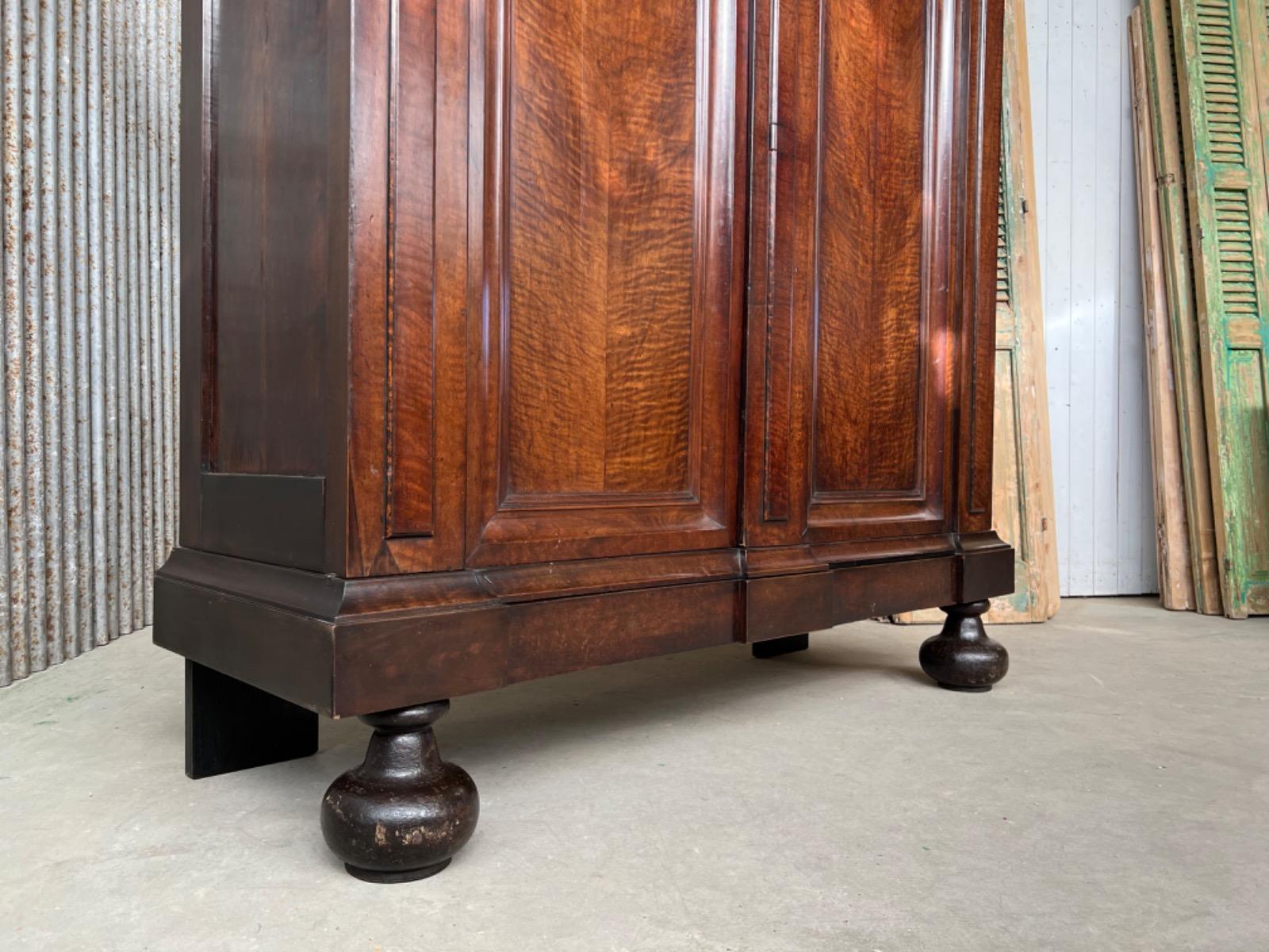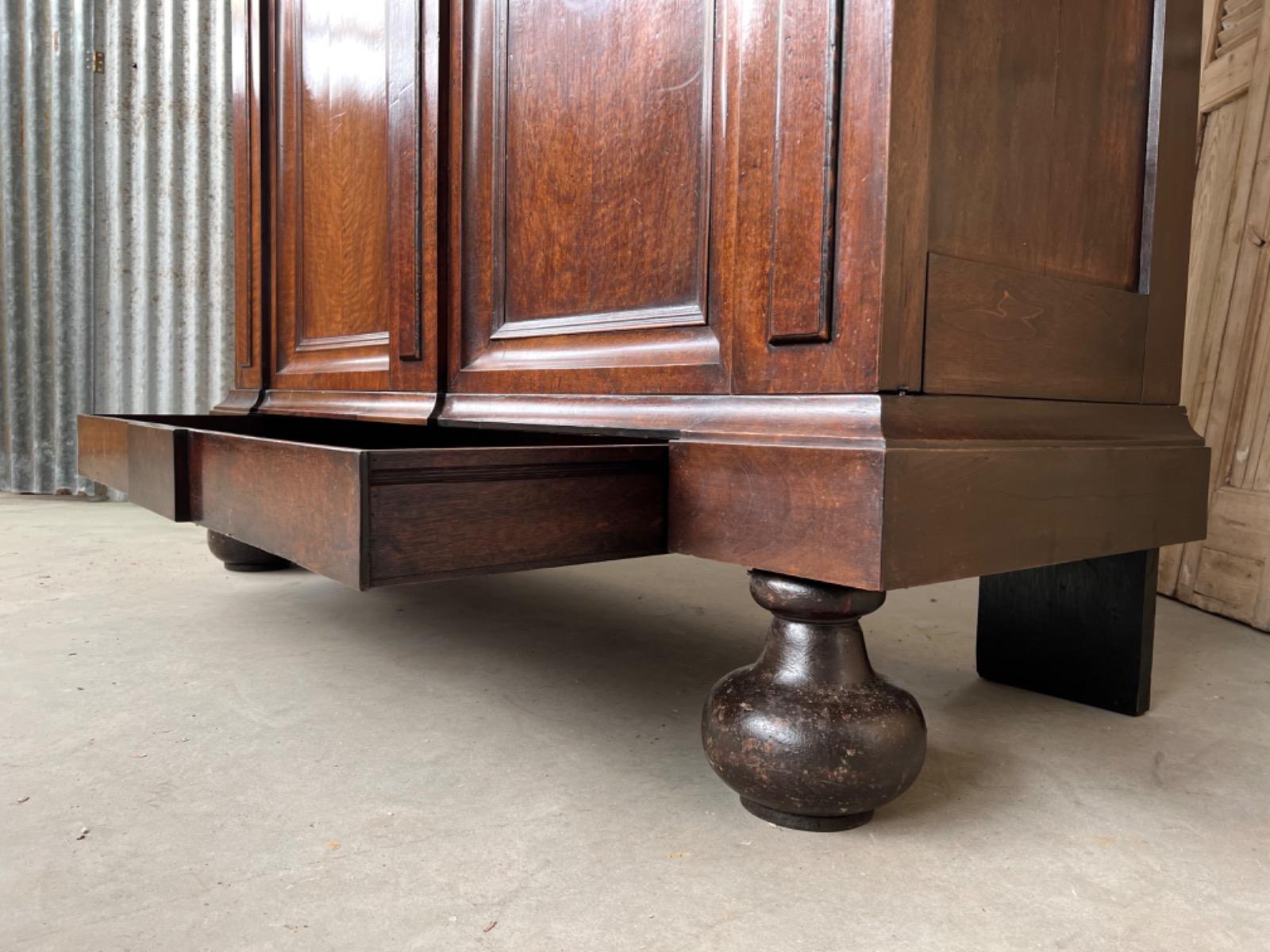 Notenhouten Notaris of Pastoors kast. 2e-3e kwart 18e eeuw. Grote overhangende en rijk geprofileerde kap met daaronder twee flinke deuren met evenals de zijden een panel.