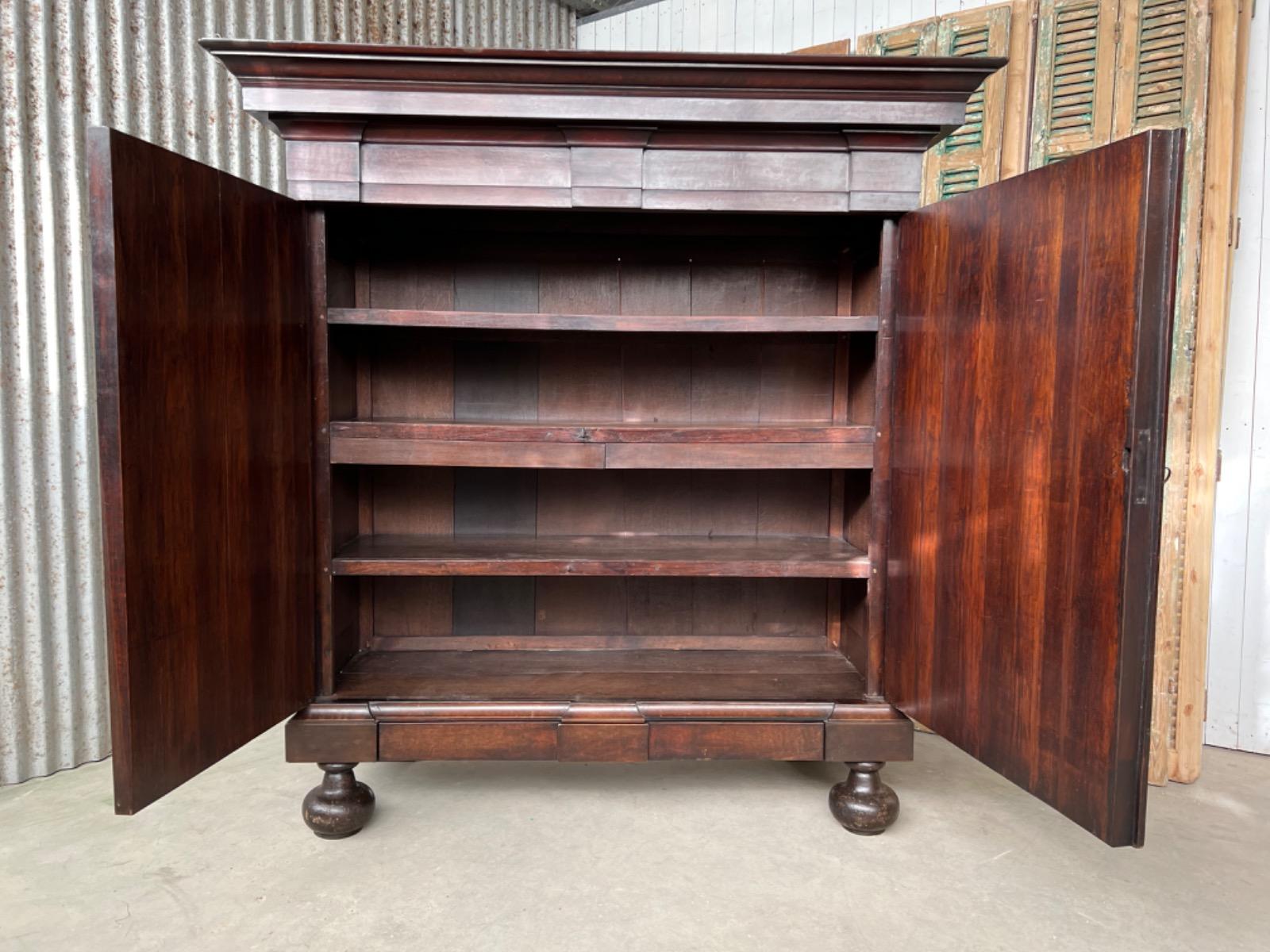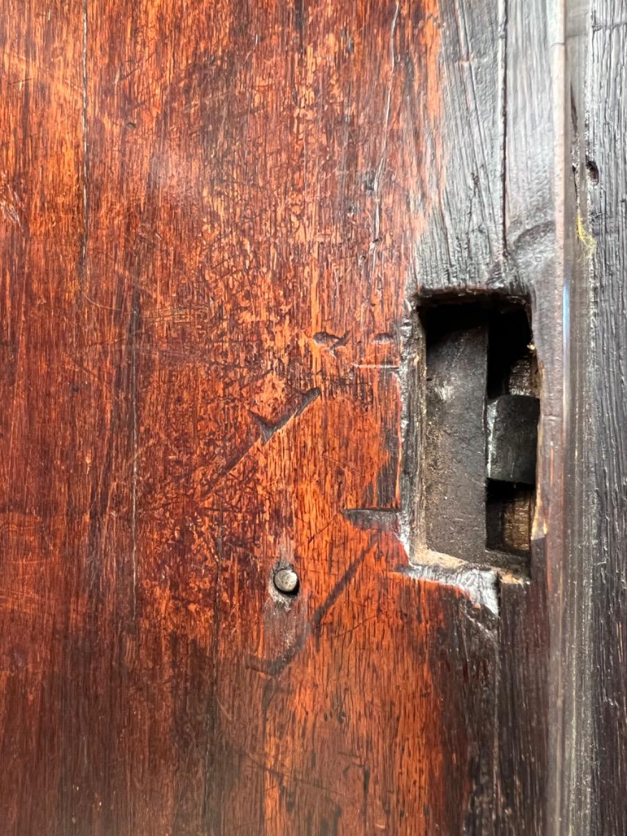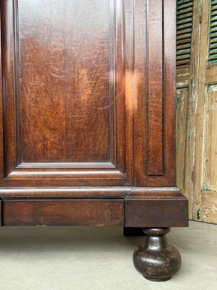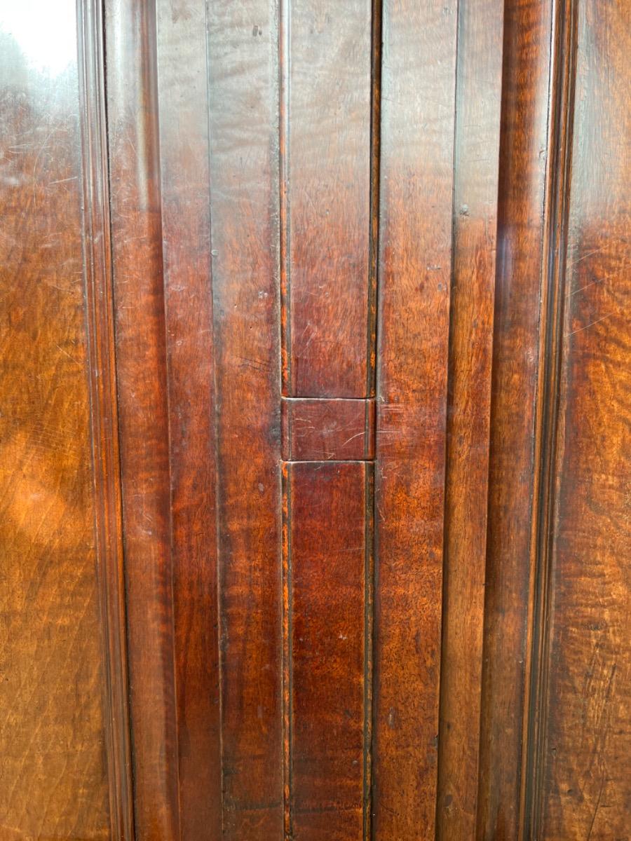 Notenhouten Notaris of Pastoors kast. 2e-3e kwart 18e eeuw. Grote overhangende en rijk geprofileerde kap met daaronder twee flinke deuren met evenals de zijden een panel.