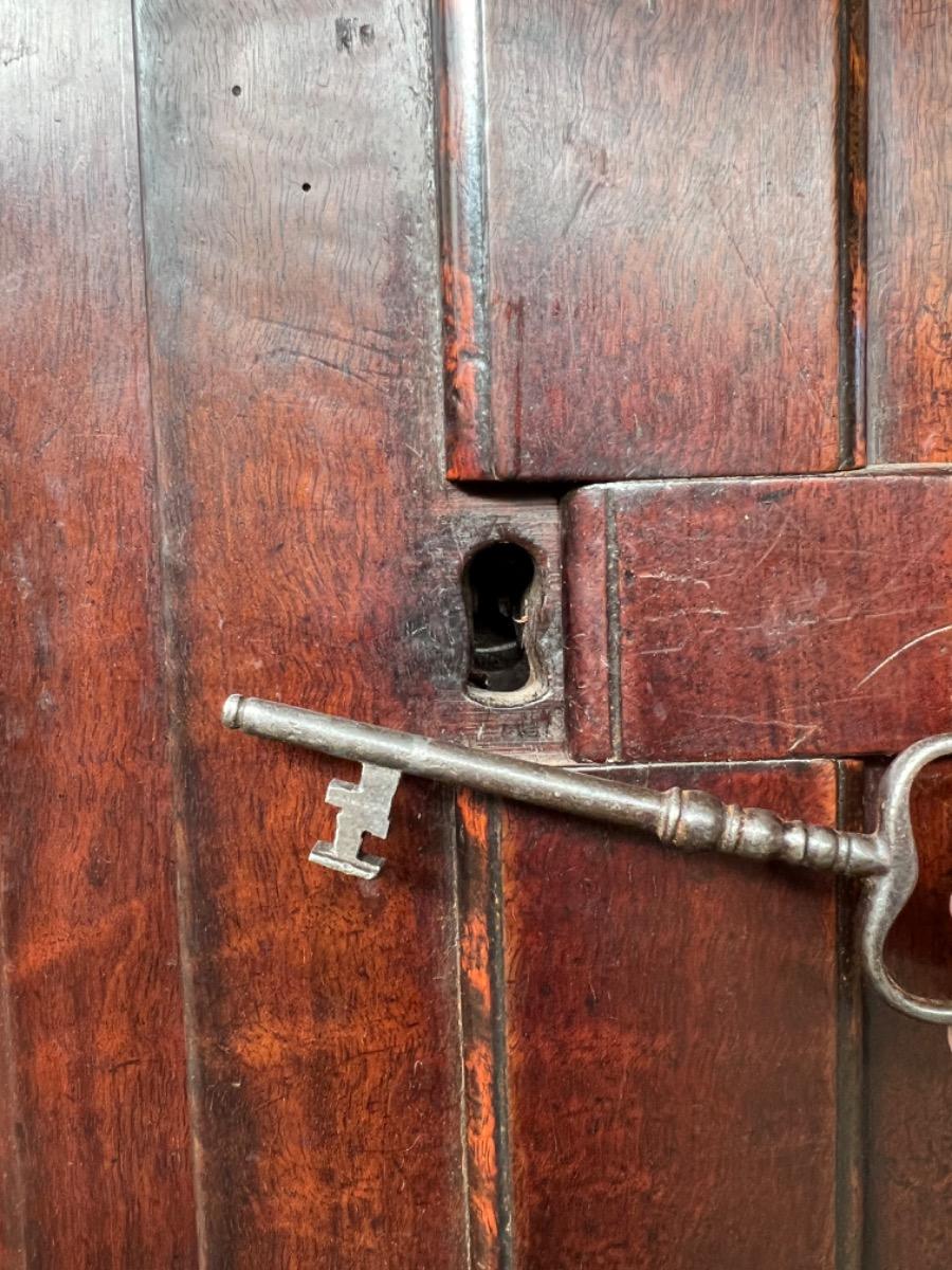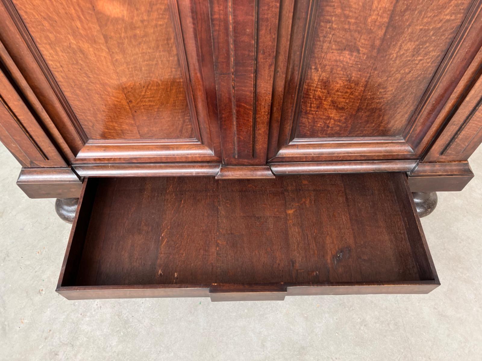 Tussen de tweed bolpoten een verborgen of blinde lade. Slot en sleutel oorspronkelijk en werkend. Sleutel entre verborgen in middenstijl.
