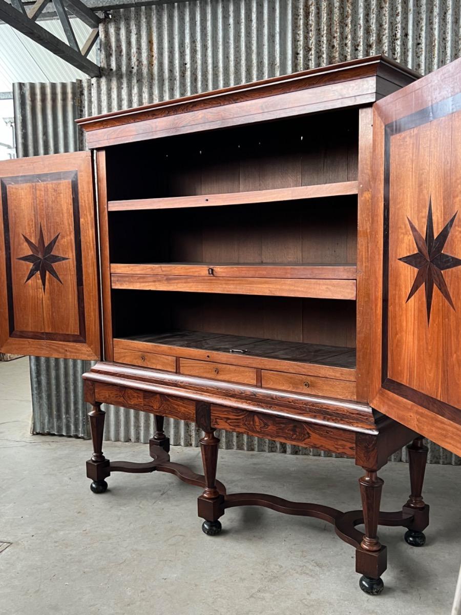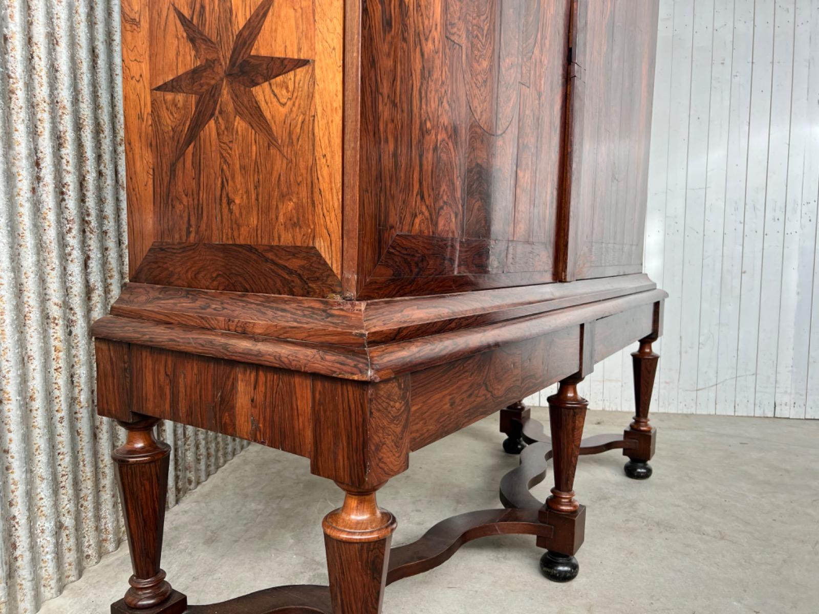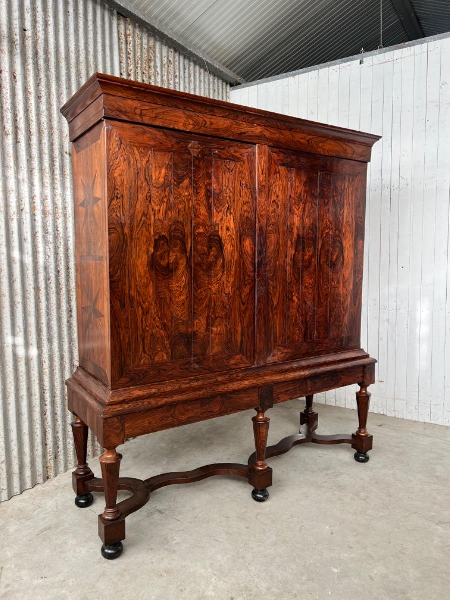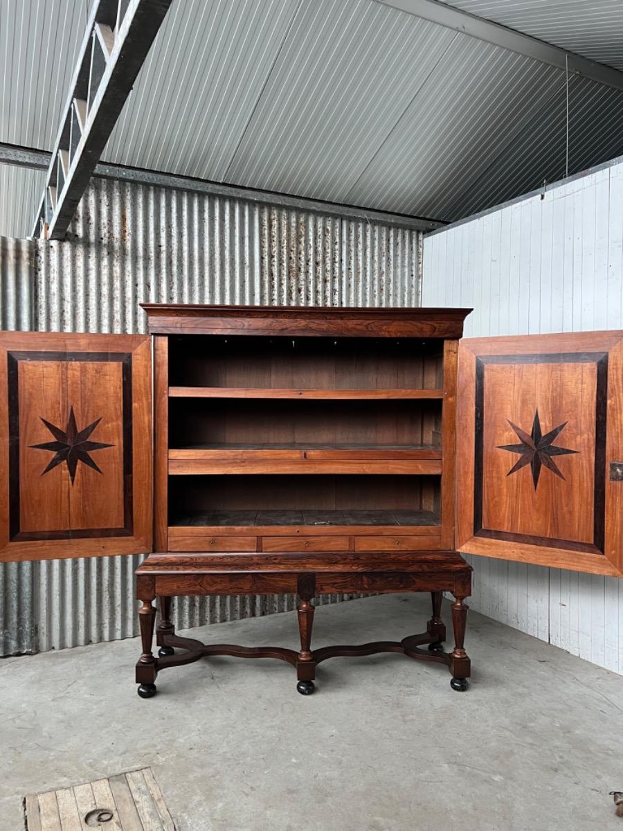 17e eeuws Zeeuws kruisvoet kabinet. Ingelegd met ebben bieswerk en sterren in zijden en deuren. Strakke kap met daaonder 2 vlakke deuren.