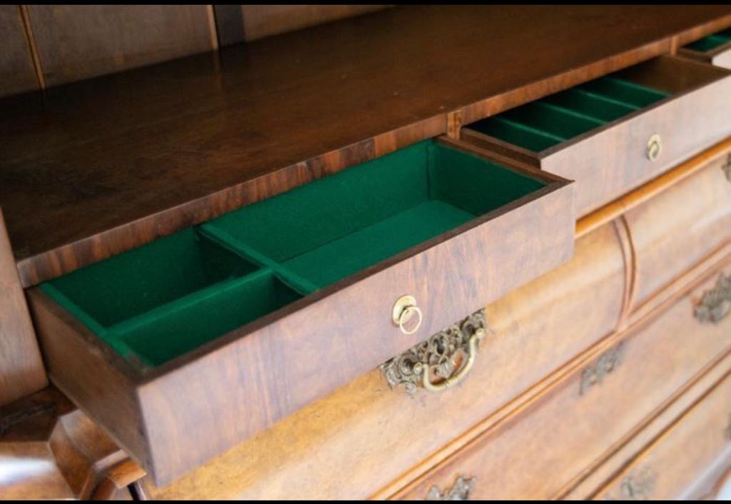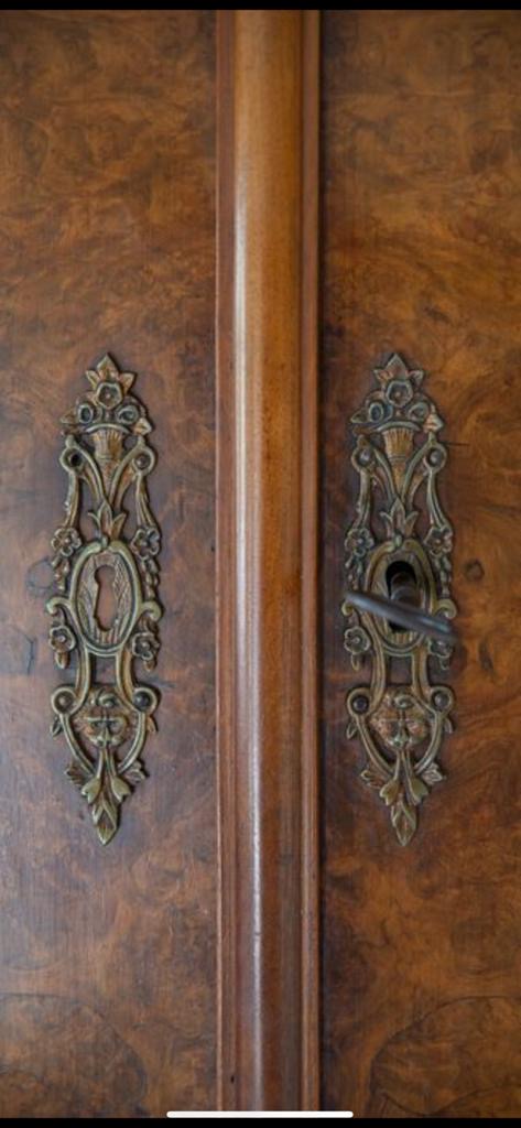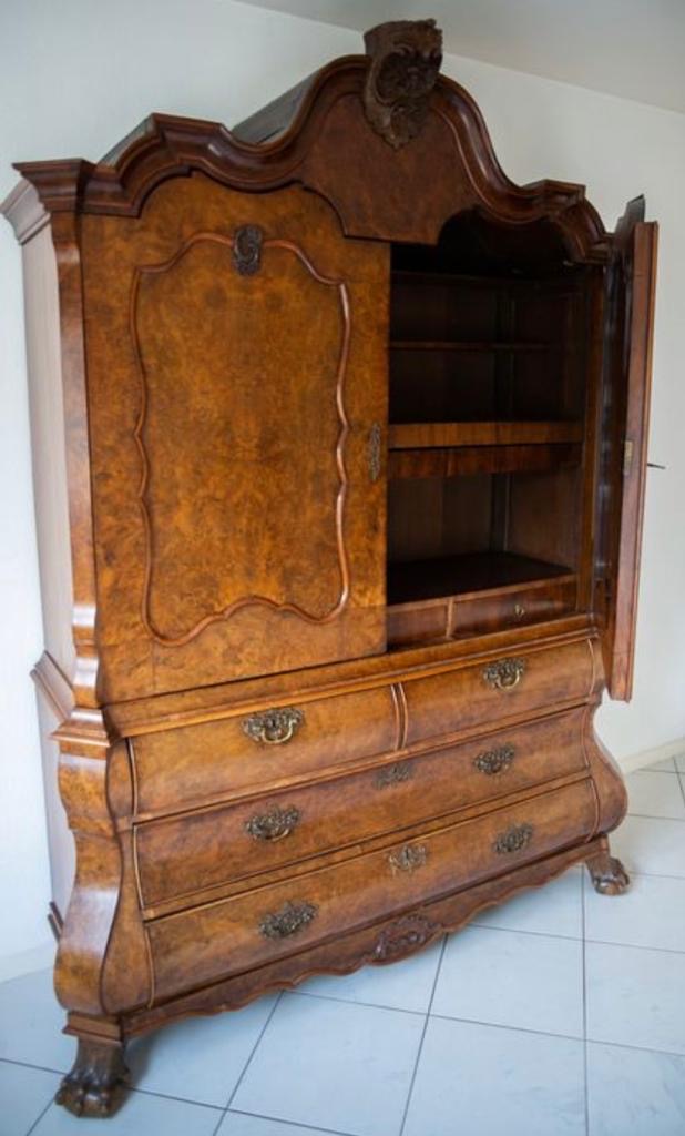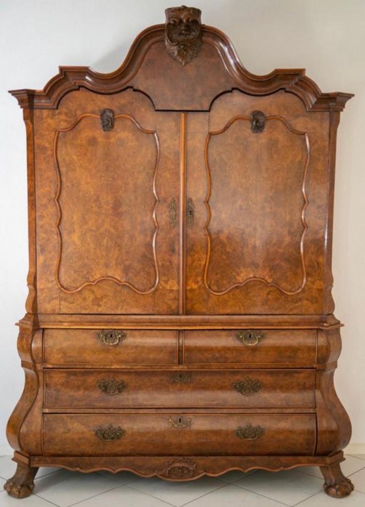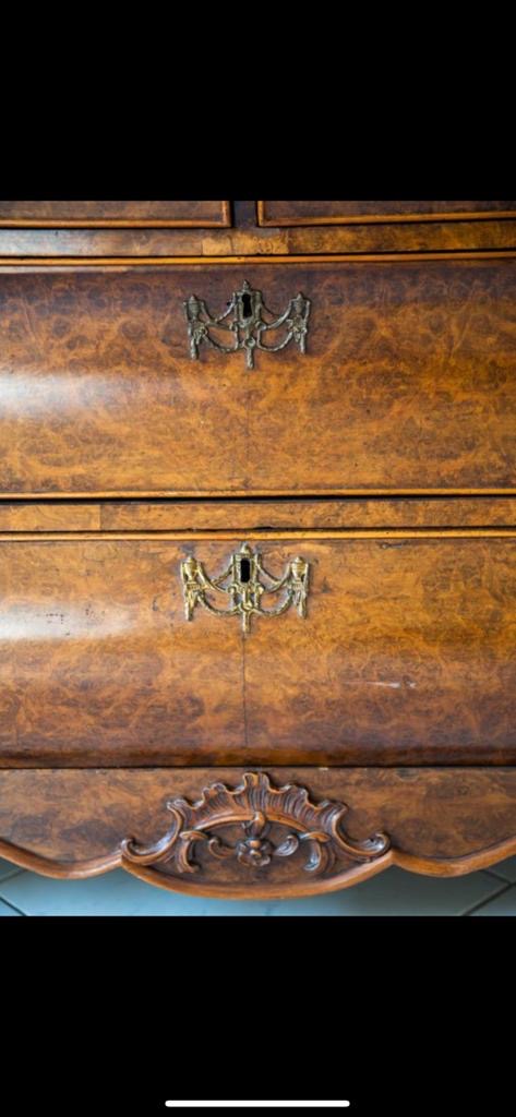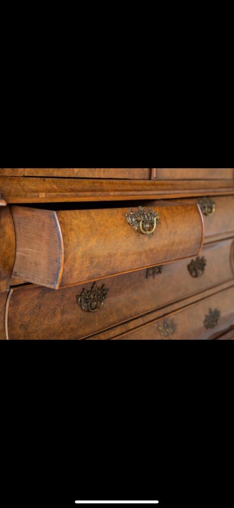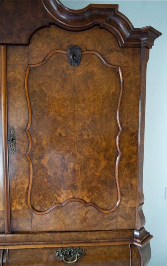 Wortelnoten kabinet Louis xv kabinet, Hollands noten kabinet. Gewelfde deuren en dubbel gebogen kap met gesneden / gestoken ornamenten. Gegoten messing ladentrekkers.