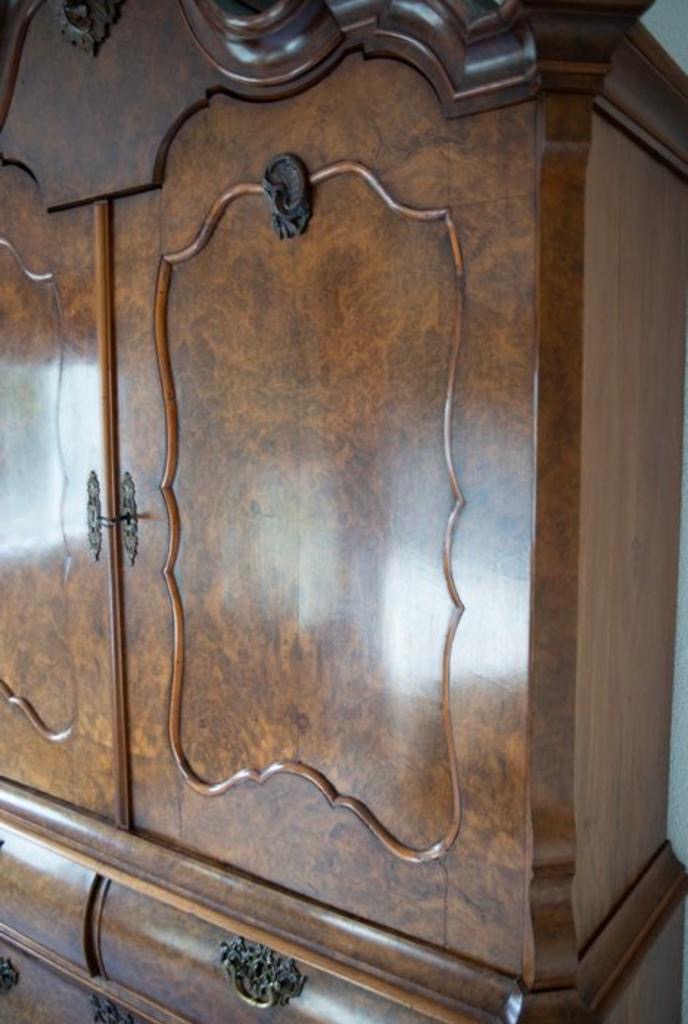 Wortelnoten kabinet Louis xv kabinet, Hollands noten kabinet. Gewelfde deuren en dubbel gebogen kap met gesneden / gestoken ornamenten.