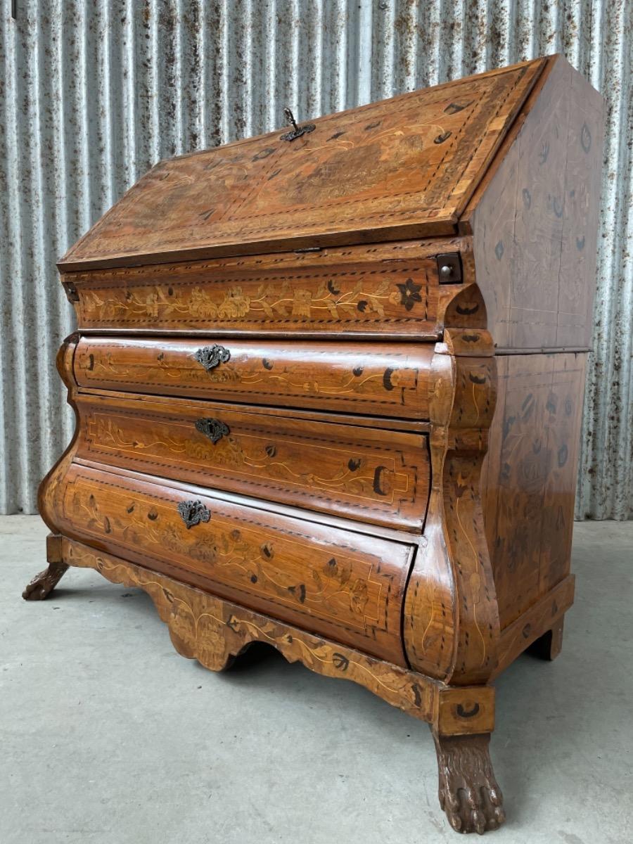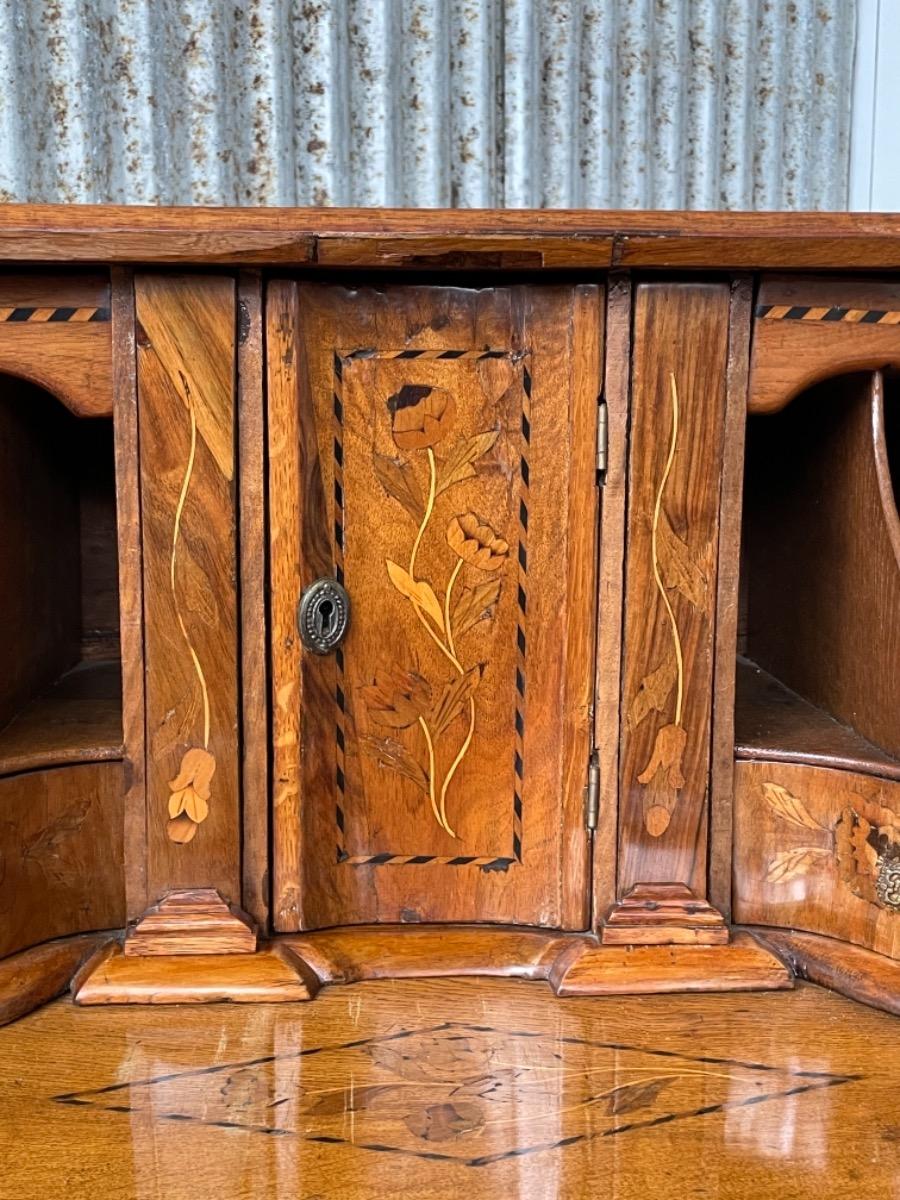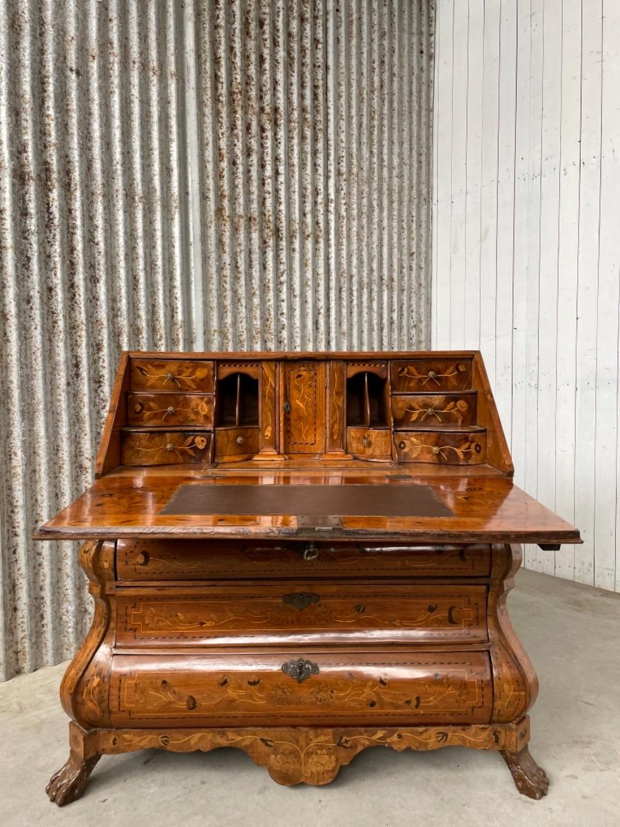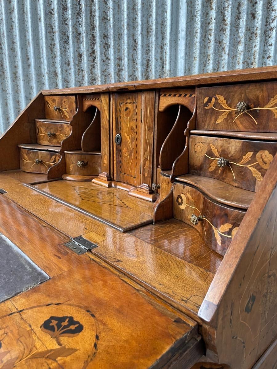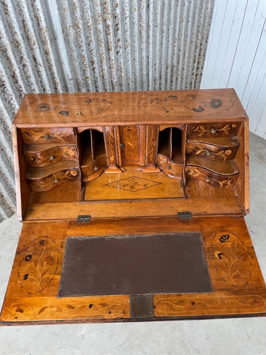 18e eeuws noten klepbureau met marquettery inlegwerk (later) Laden interieur met ‘keldertje’. Klep ingelegd met leder. 3 laads dubbel gebogen onderkast gedragen door klauwpoten. 2 delig. Ongerestaureerd maar in te gebruiken staat. (Informeer naar de opties).