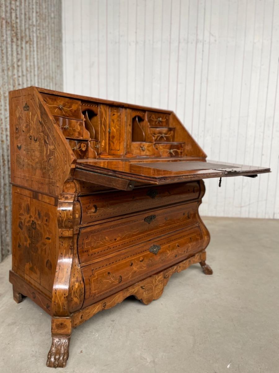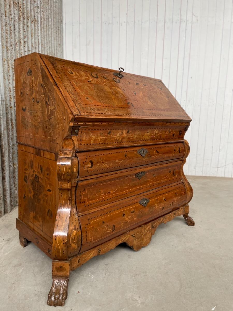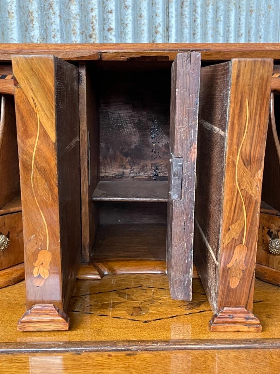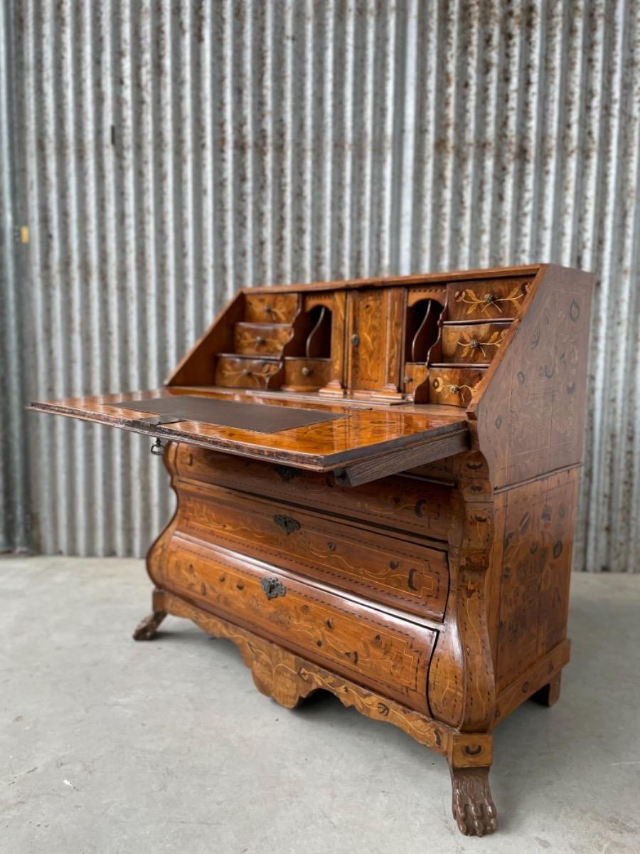 18e eeuws noten klepbureau met marquettery inlegwerk (later) Laden interieur met ‘keldertje’. Klep ingelegd met leder. 3 laads dubbel gebogen onderkast gedragen door klauwpoten. 2 delig. Ongerestaureerd maar in te gebruiken staat. (Informeer naar de opties).