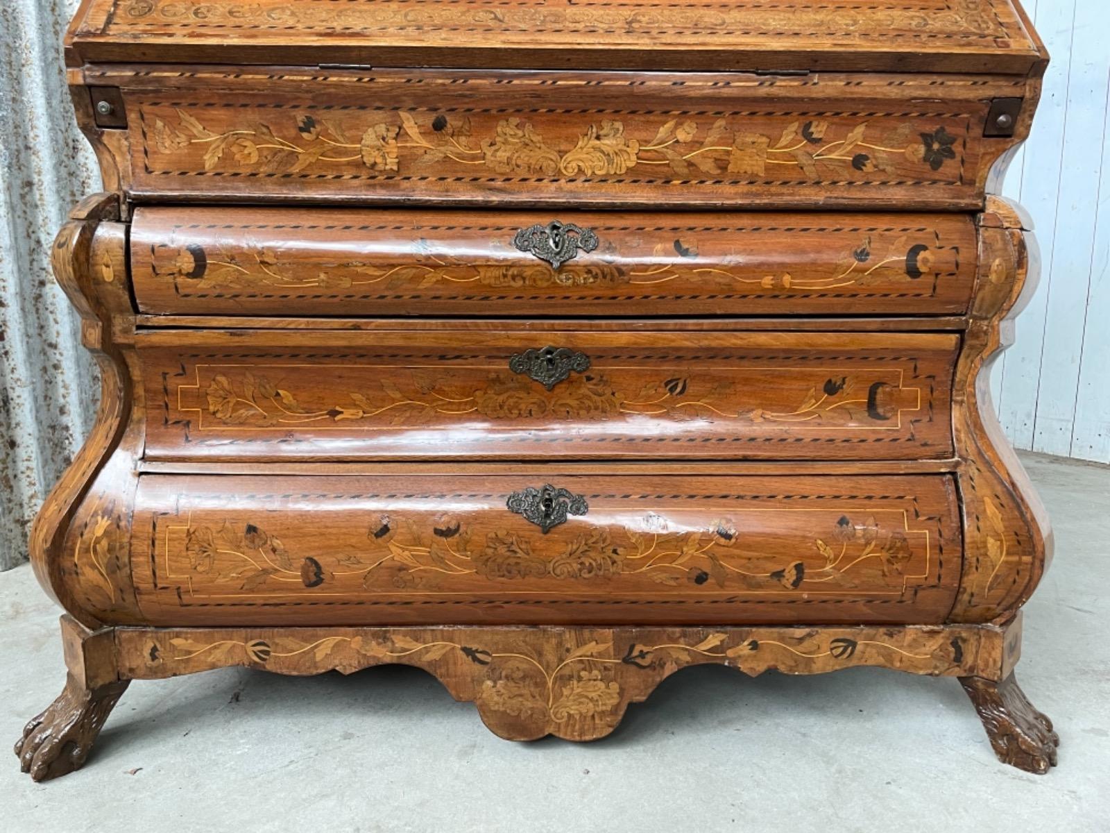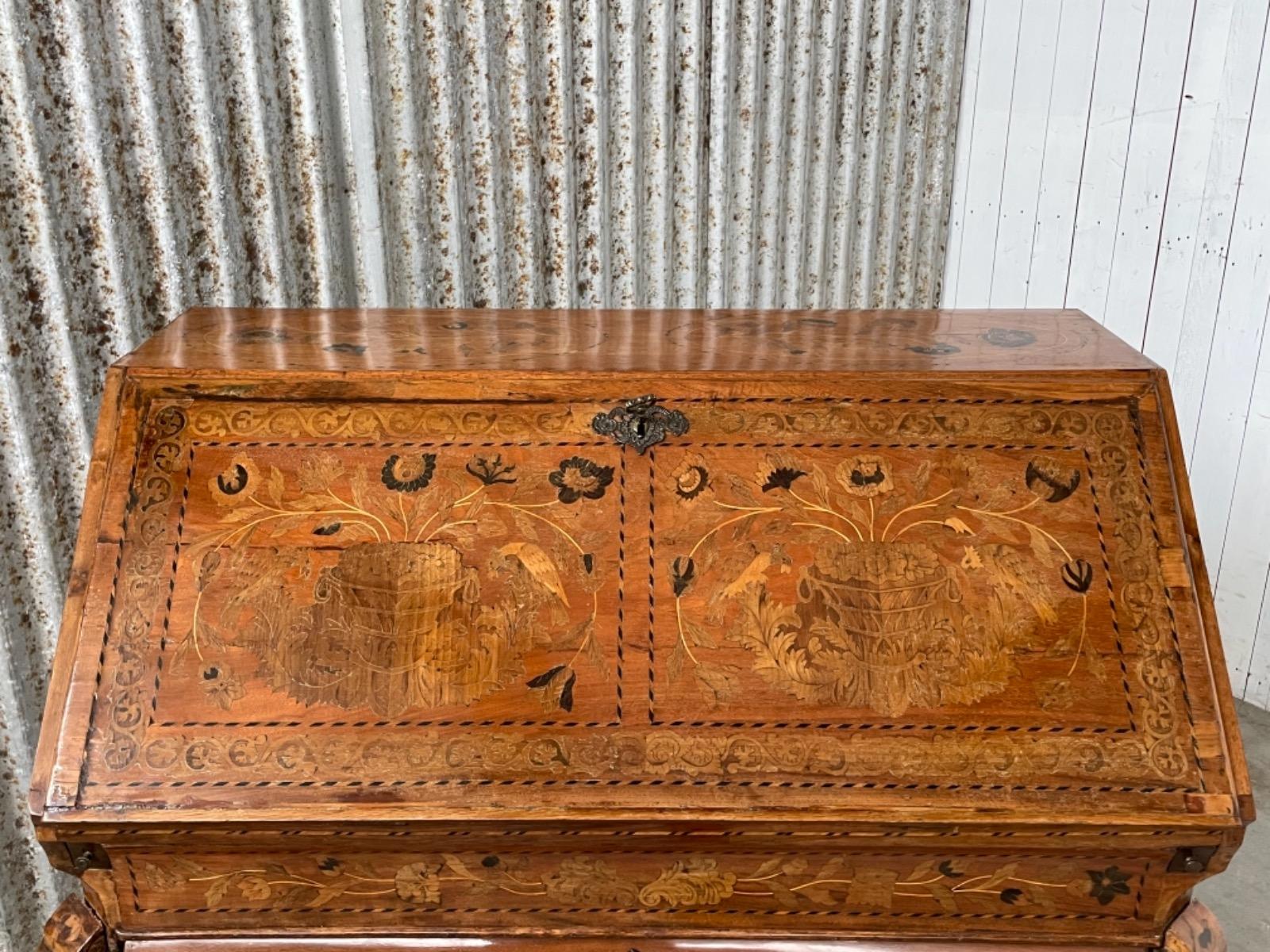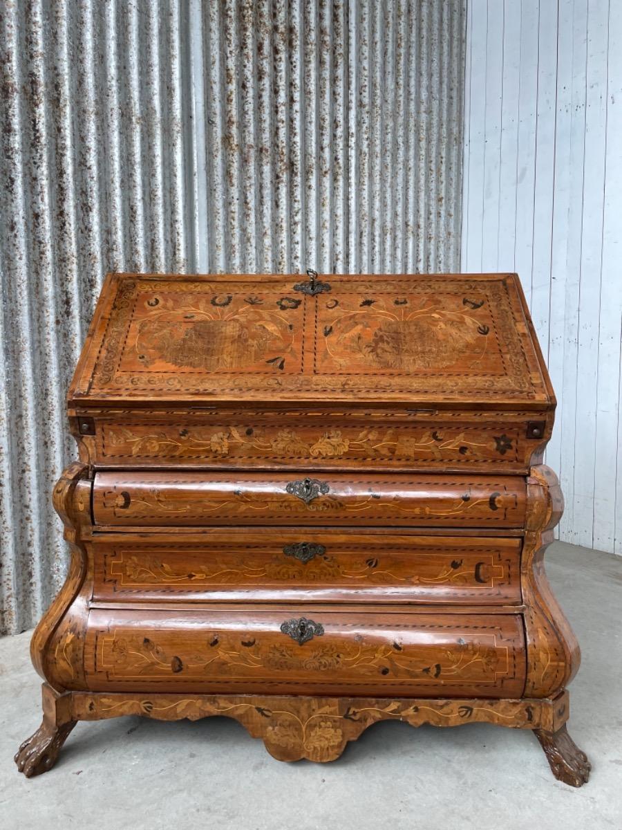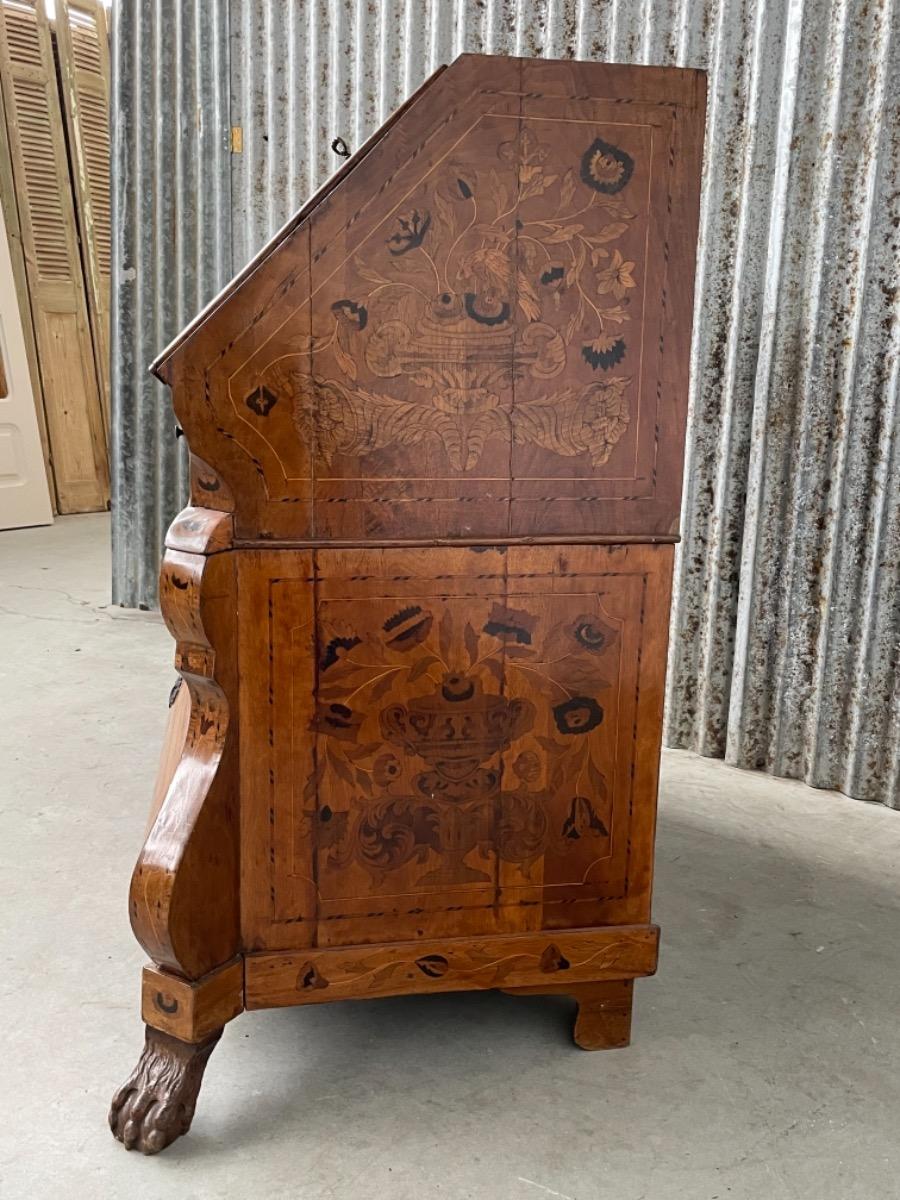 18e eeuws noten klepbureau met marquettery inlegwerk (later) Laden interieur met ‘keldertje’. Klep ingelegd met leder. 3 laads dubbel gebogen onderkast gedragen door klauwpoten. 2 delig. Ongerestaureerd maar in te gebruiken staat. (Informeer naar de opties).
