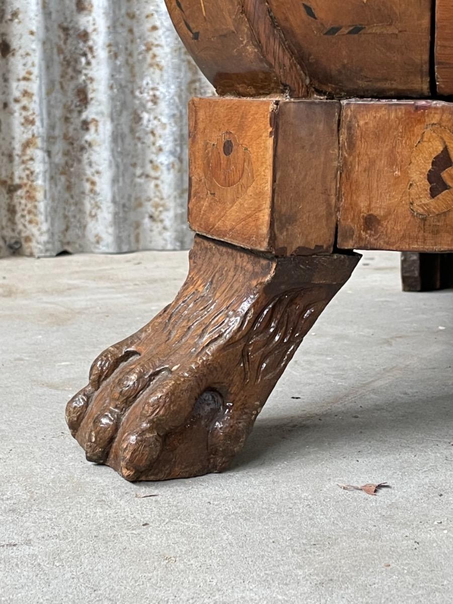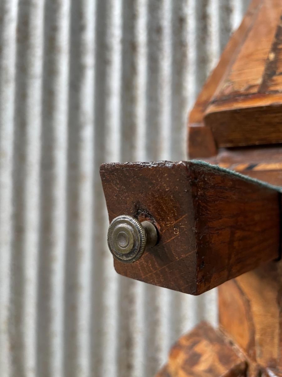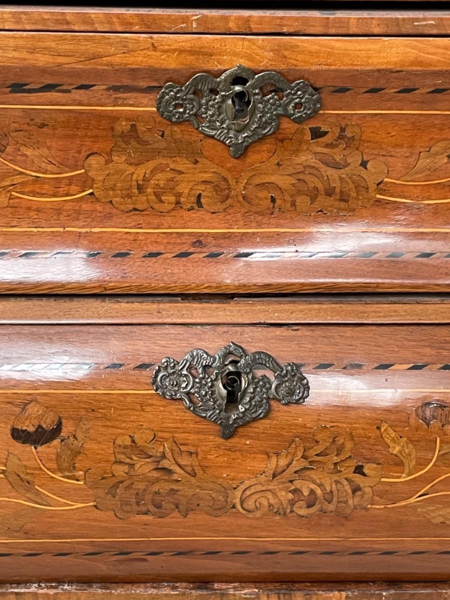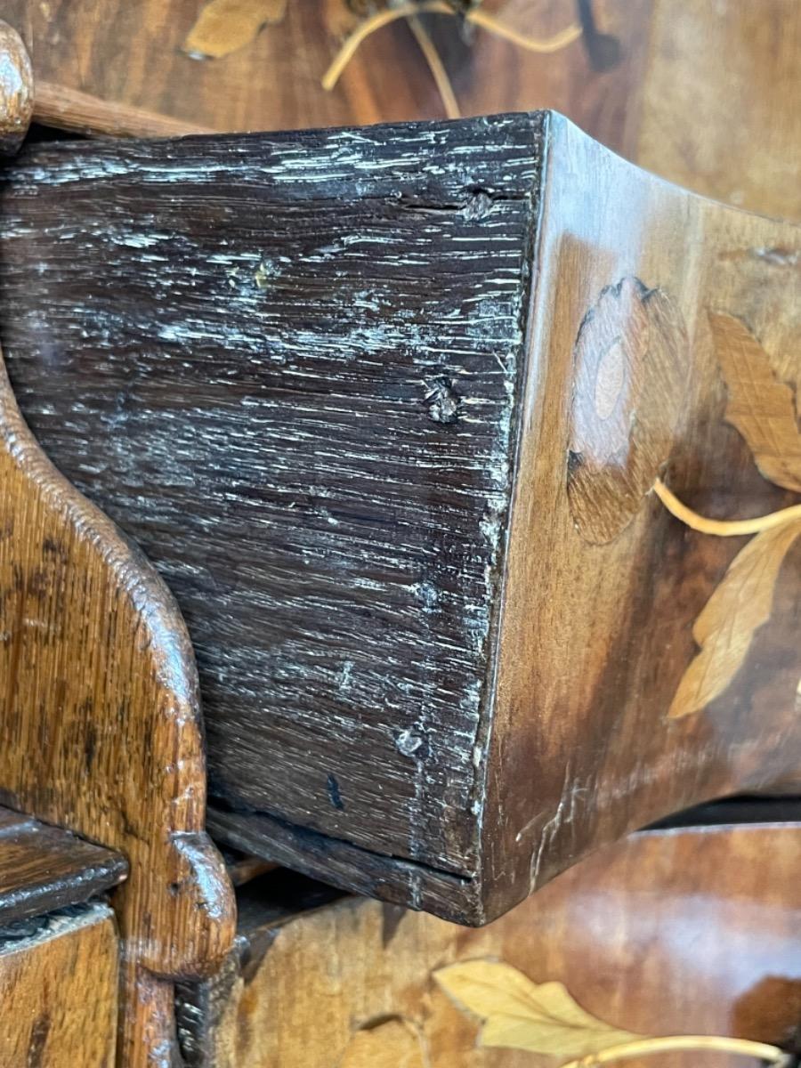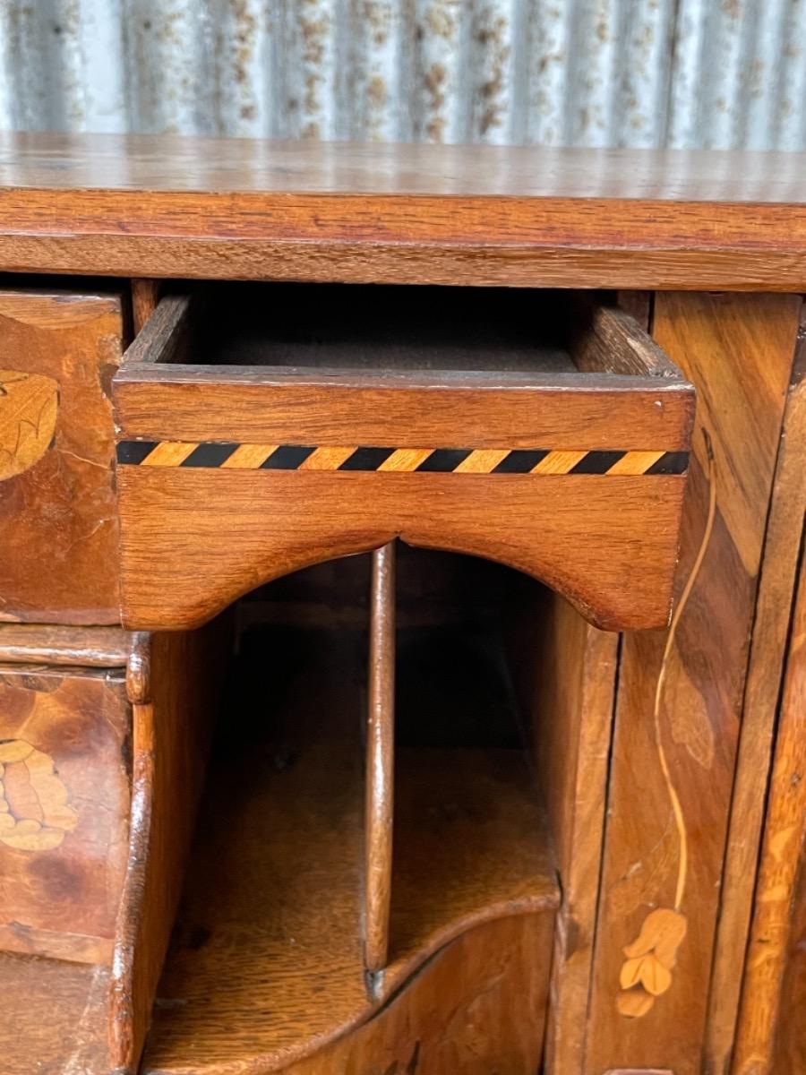18e eeuws noten klepbureau met marquettery inlegwerk (later) Laden interieur met ‘keldertje’. Klep ingelegd met leder. 3 laads dubbel gebogen onderkast gedragen door klauwpoten. 2 delig. Ongerestaureerd maar in te gebruiken staat. (Informeer naar de opties).