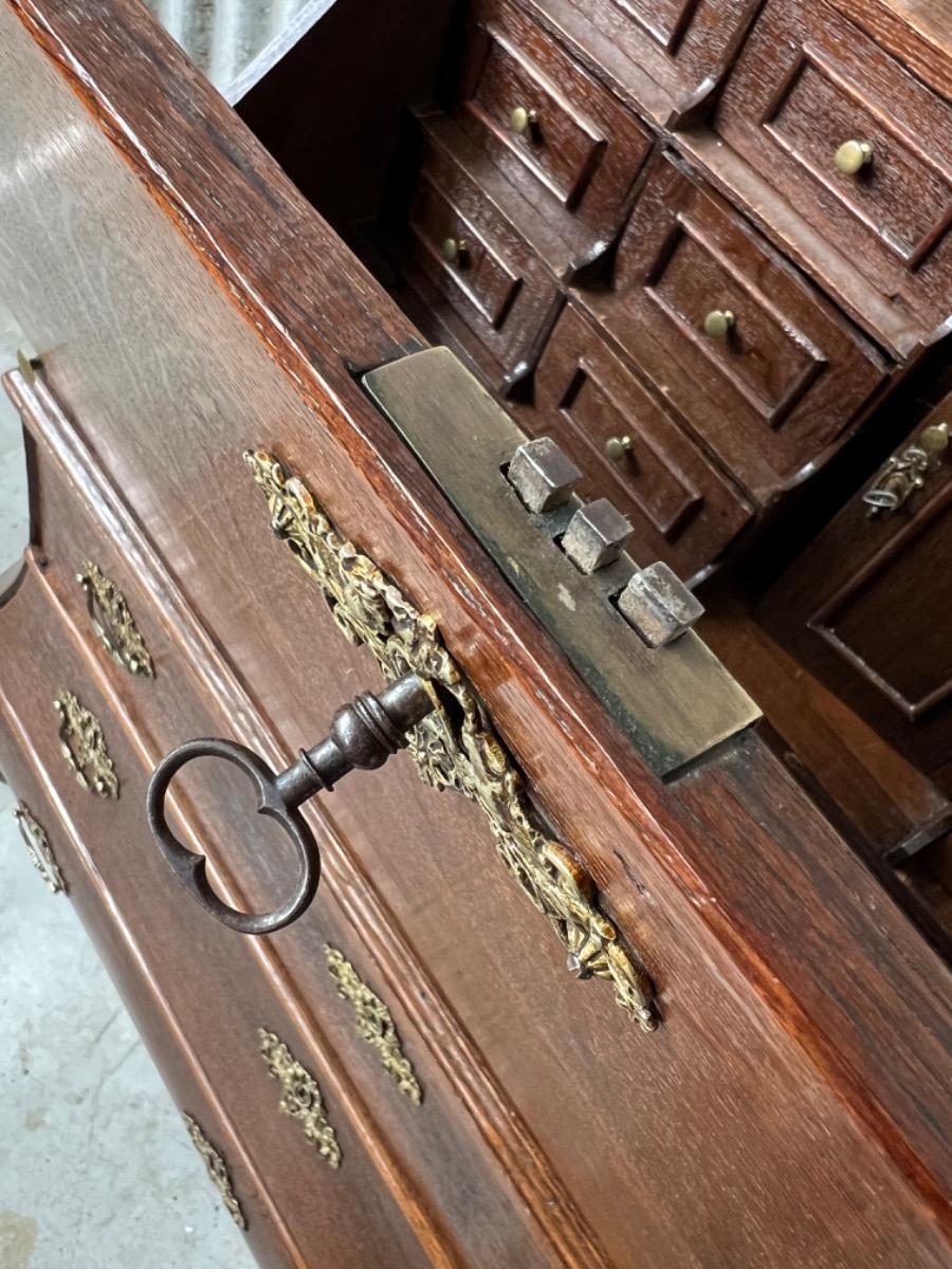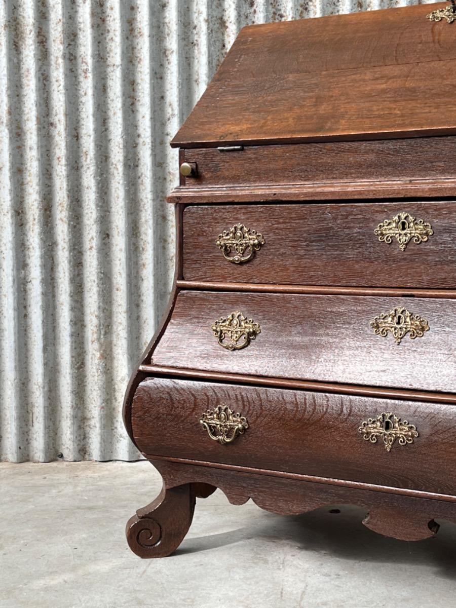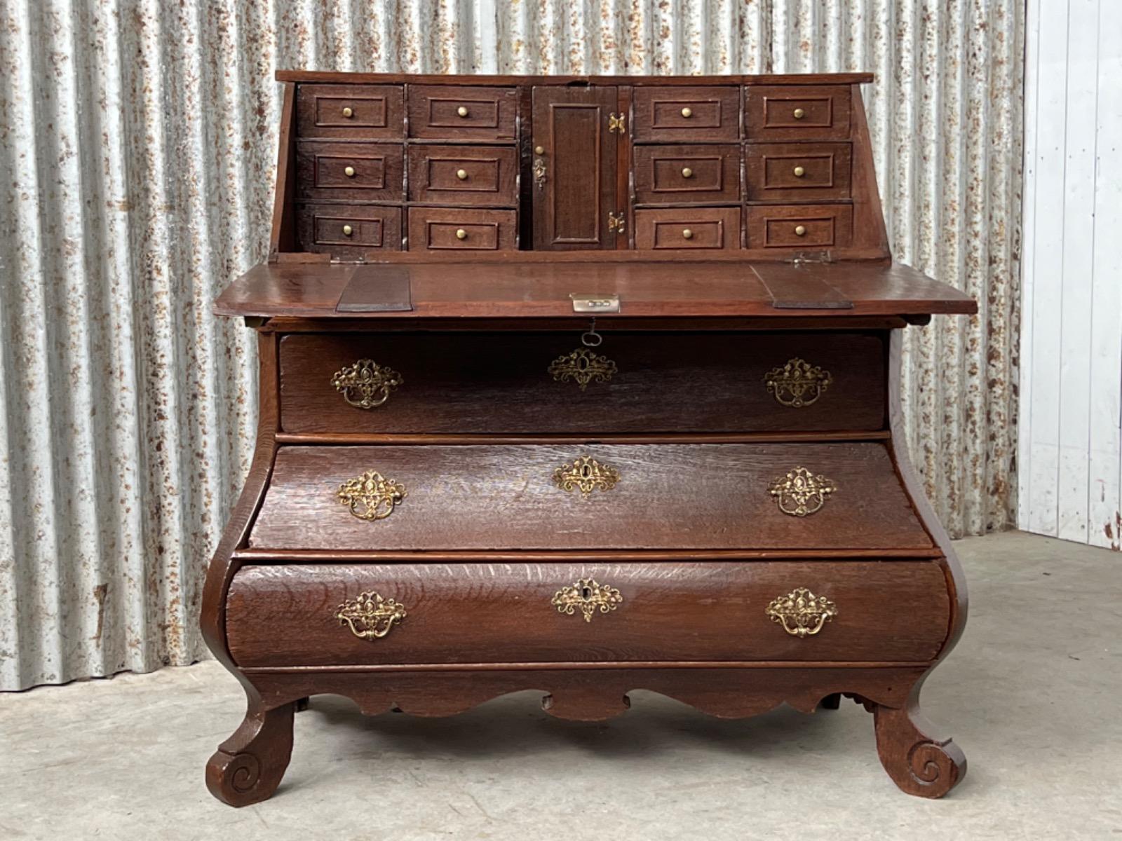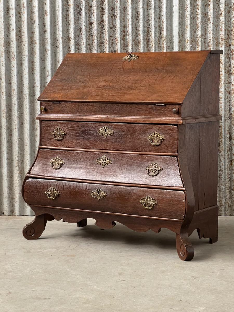 Hollands uitzonderlijk eiken houten klepbureau met deels verguld koper beslag, knopjes en scharnieren van massief koper. Op "scroll poten". Alle sloten aanwezig en oorspronkelijk.