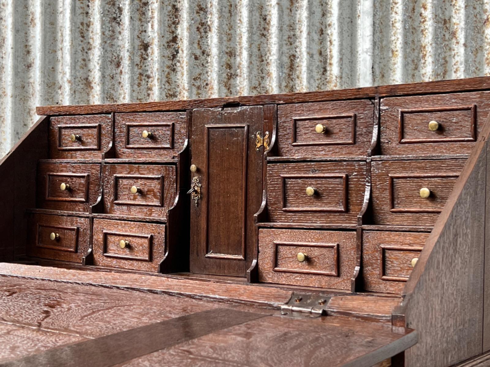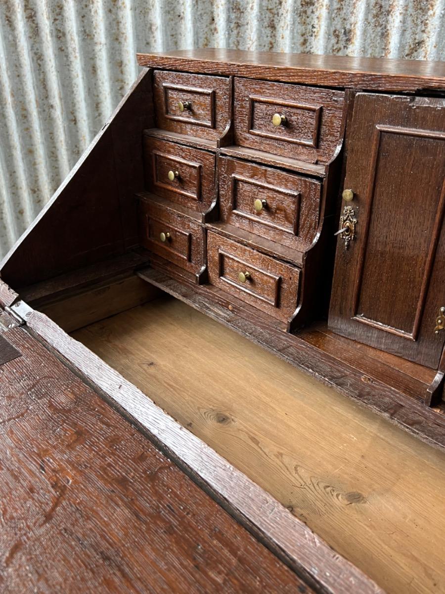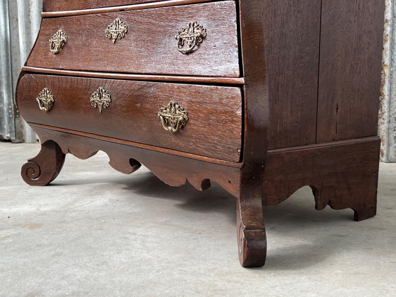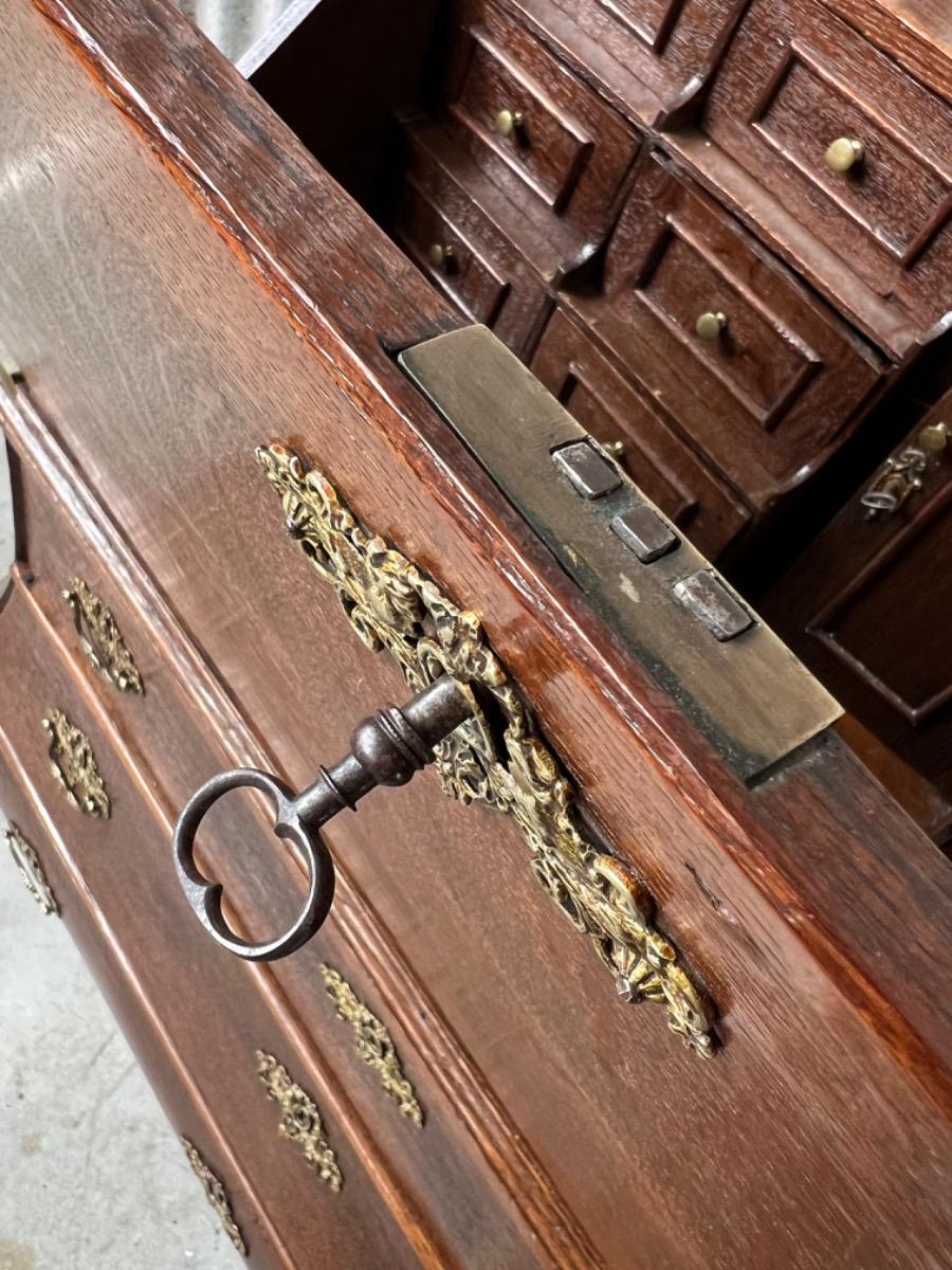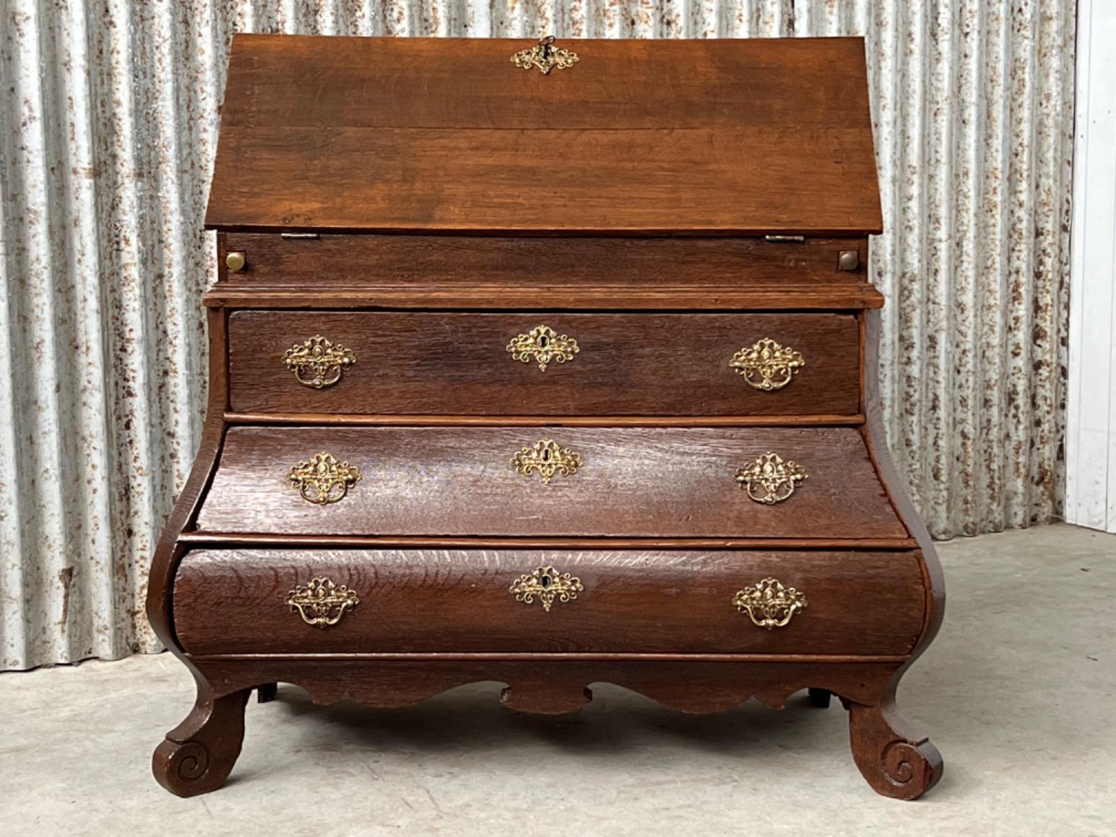 Hollands uitzonderlijk eiken houten klepbureau met deels verguld koper beslag, knopjes en scharnieren van massief koper. Op "scroll poten". Alle sloten aanwezig en oorspronkelijk.