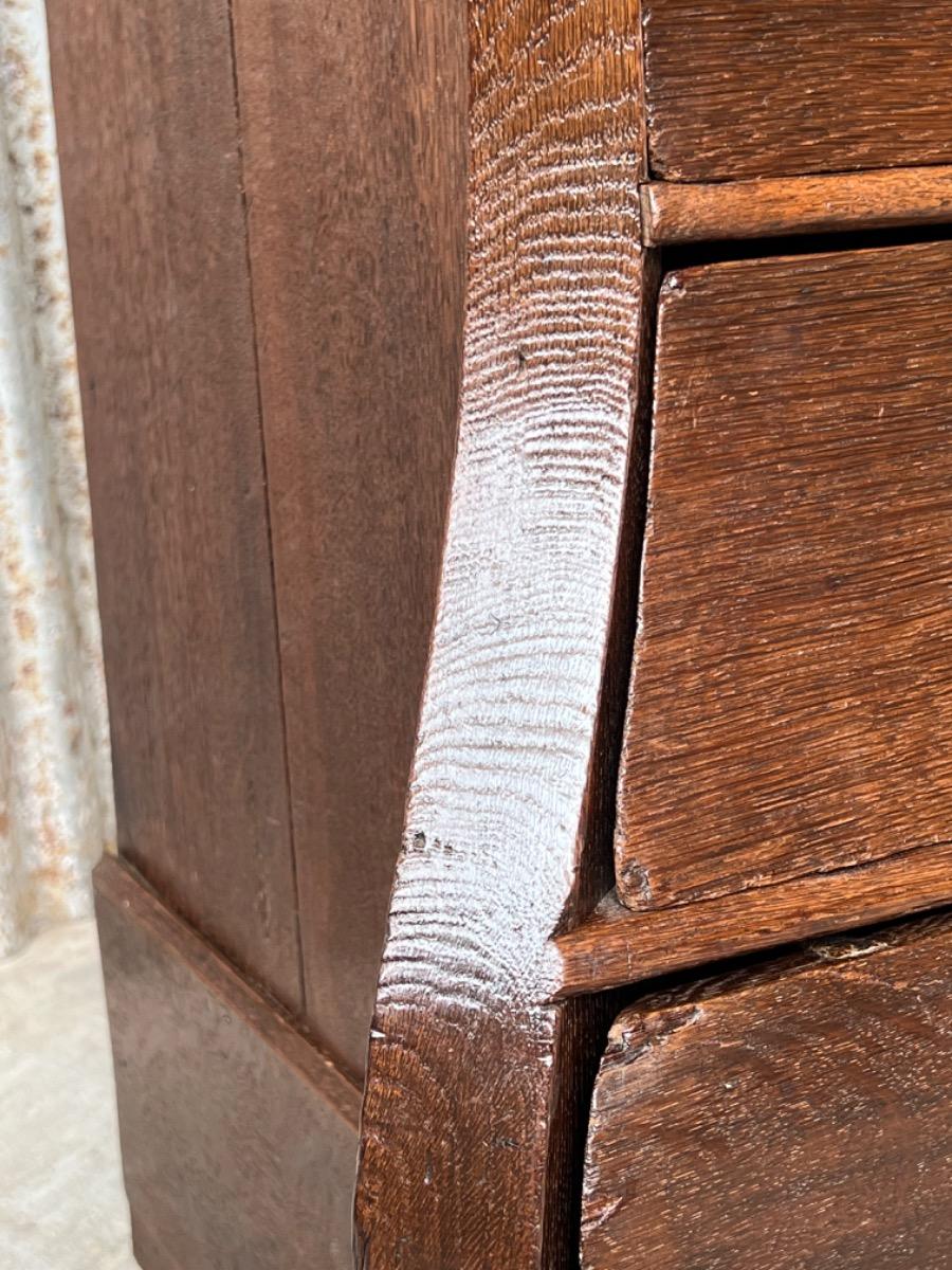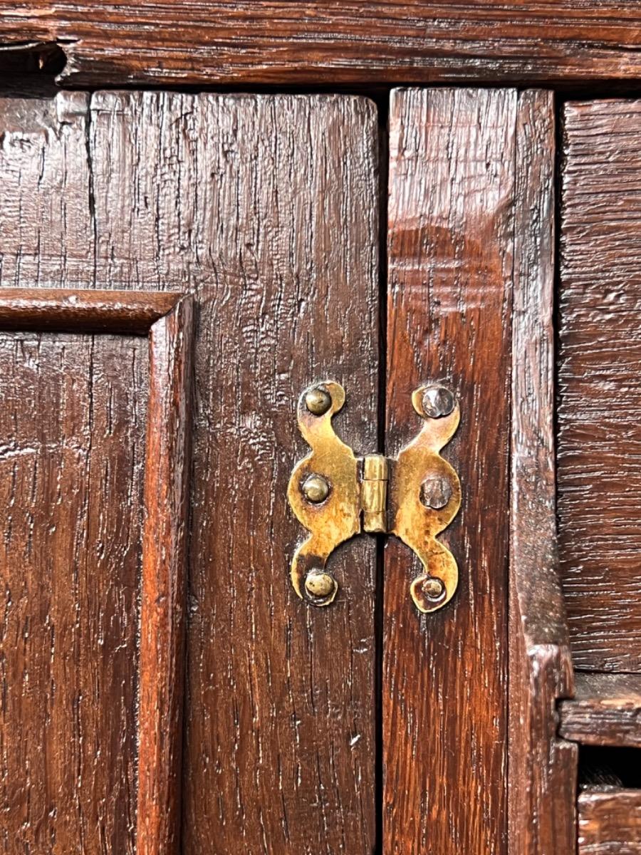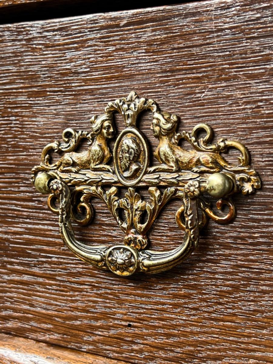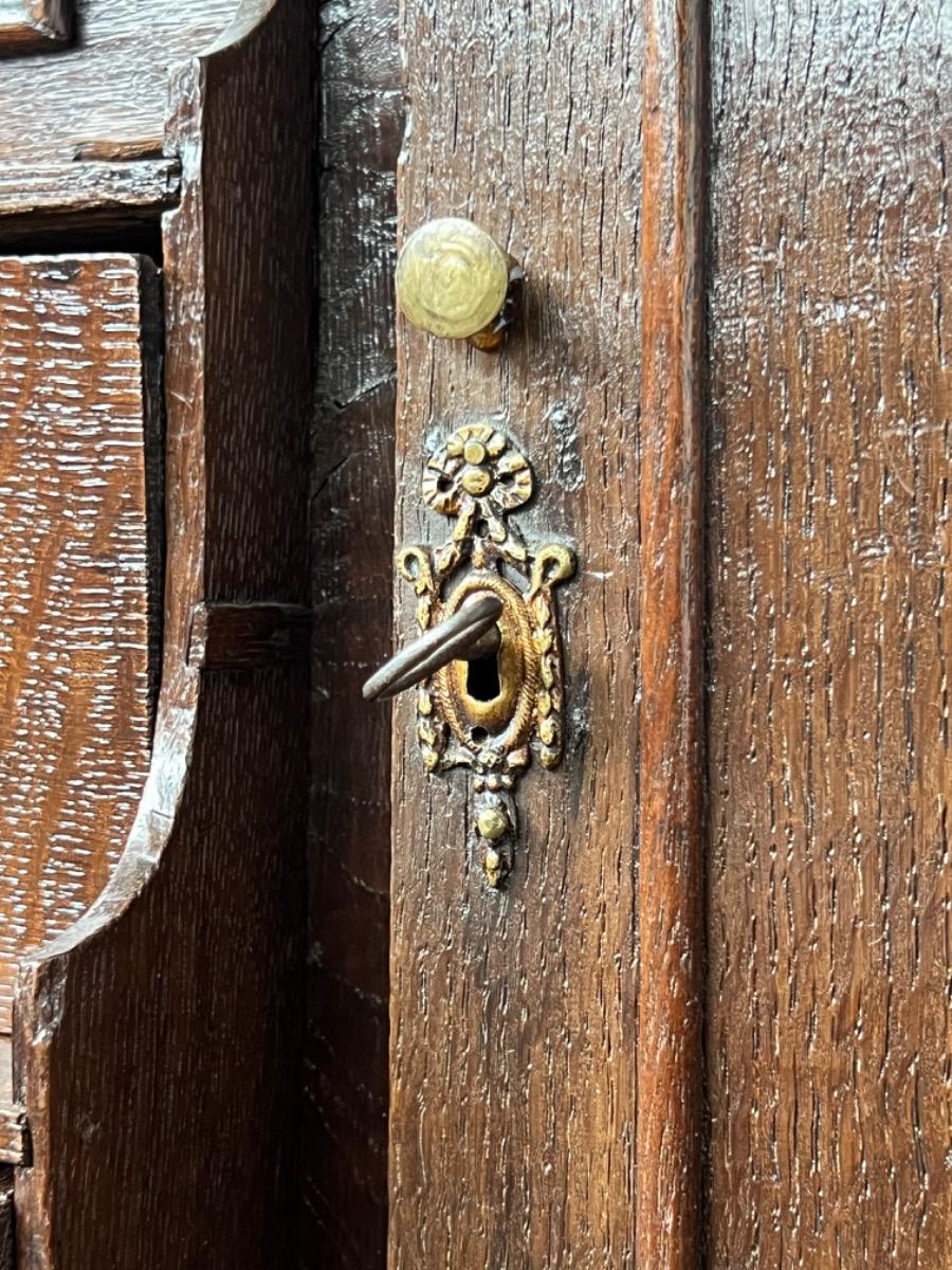 Hollands uitzonderlijk eiken houten klepbureau met deels verguld koper beslag, knopjes en scharnieren van massief koper. Op "scroll poten". Alle sloten aanwezig en oorspronkelijk.