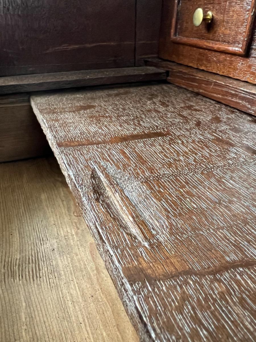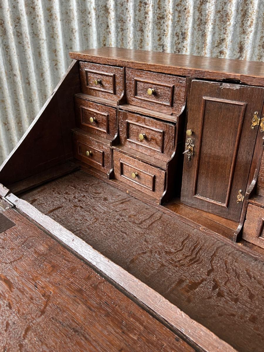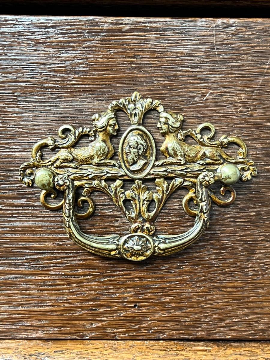 Onder de klep een 3 laads enkel gebogen onderkast met zeer fraai gedetailleerd beslag.