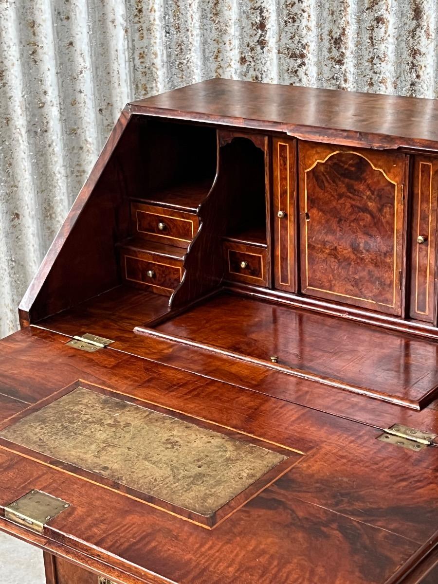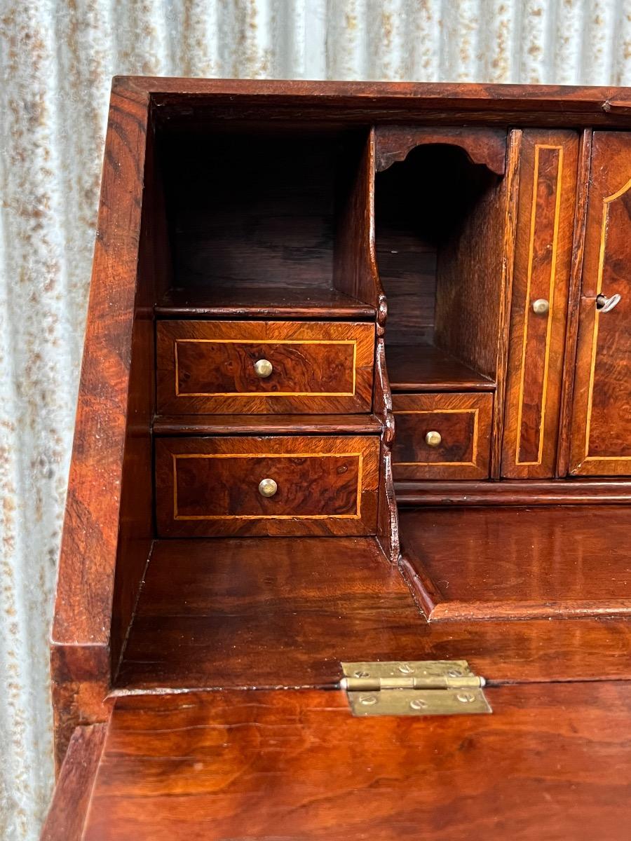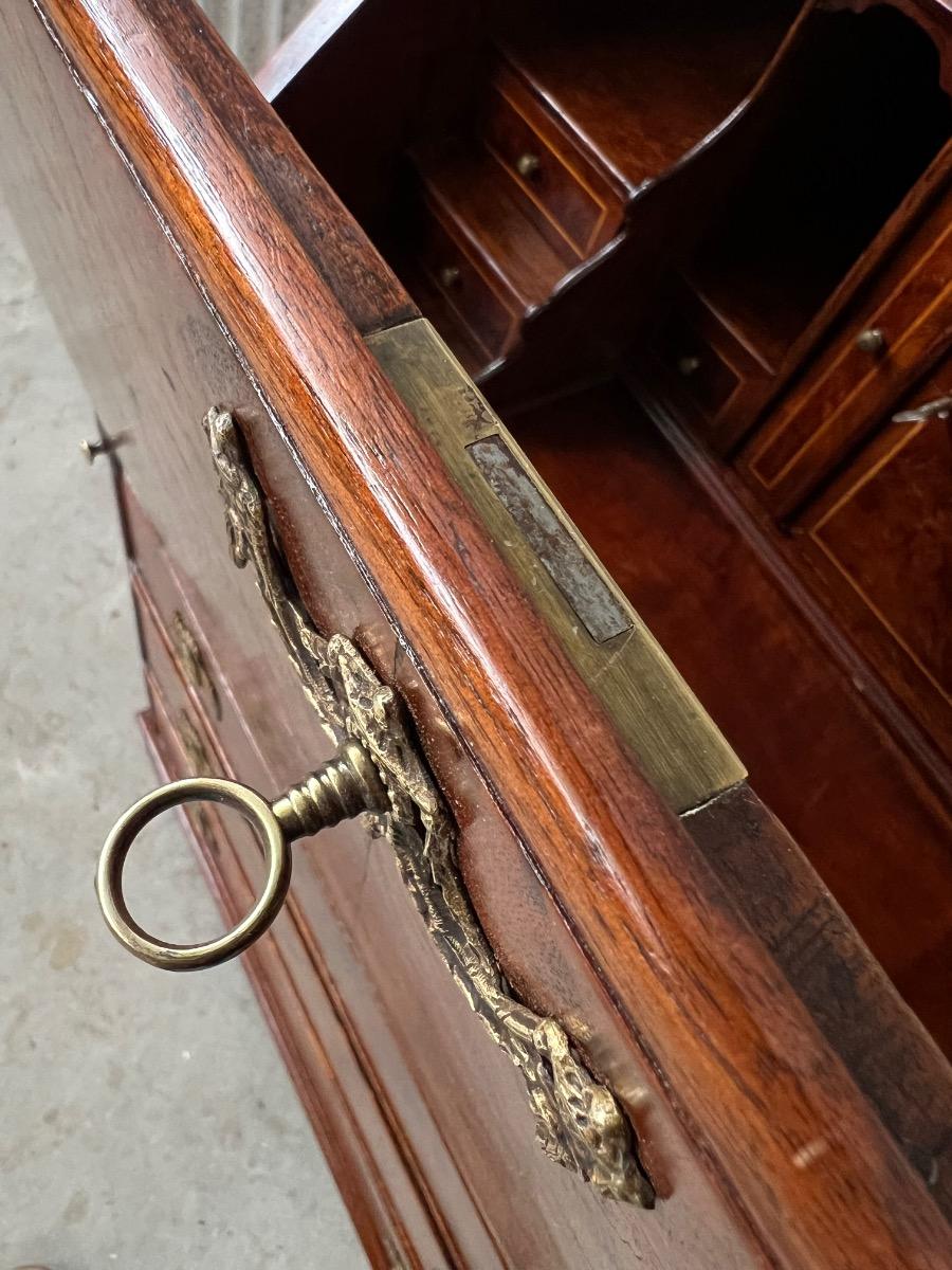 Hollands uitzonderlijk smal noten houten klepbureau met verguld messing beslag, knopjes en scharnieren van massief koper. Op "breacket poten". Alle sloten aanwezig en oorspronkelijk. Laden, keldertje in interieur. Klep ingelegd met olijf groen kalfsleder met bies. Fraaie warme tint van hand politoer met was. Holland, 2e helft 18de eeuw met wat latere aanpassingen. (Achterwand en tussen schot lade) Zijden niet gescheurd, klep niet krom, slot en sleutel werkend. In zeer goede en direct te gebruiken staat. Afm: H= 103 - 78 - 76 cm. (Hoog- bovenkant blad) B= 73 cm. (smalste - breedste punt) D= 46 - 80 cm. (Diep - klep open) Onlangs grondig nagelopen op losse delen van constructie en fineer. Houtworm controle : Geen actieve houtworm aangetroffen op 27/2/2025 Bur-2913~