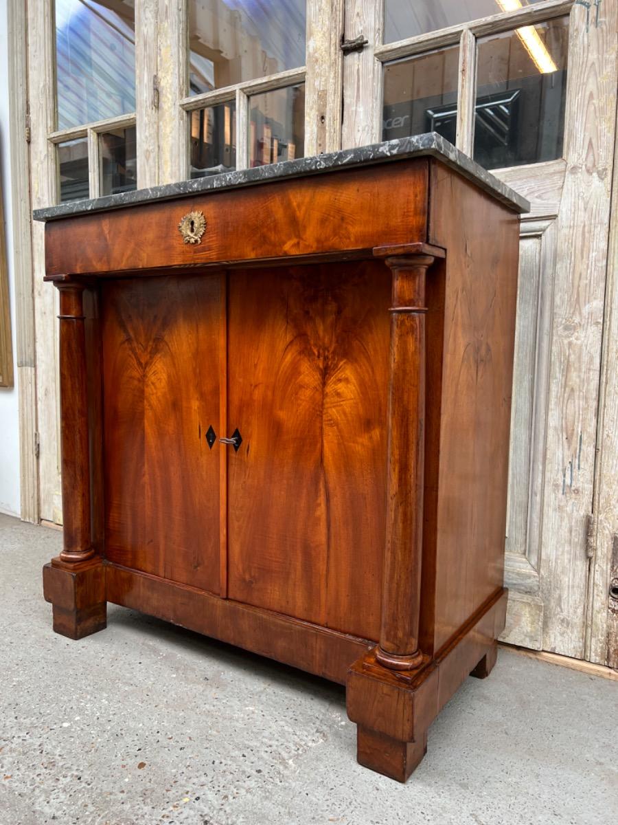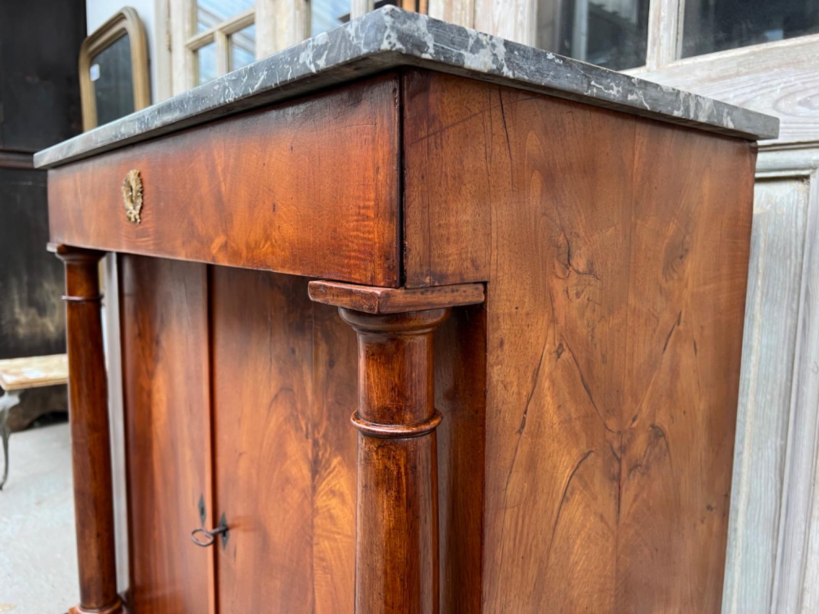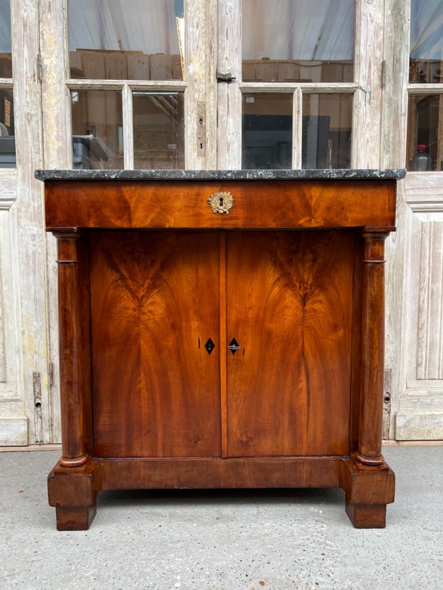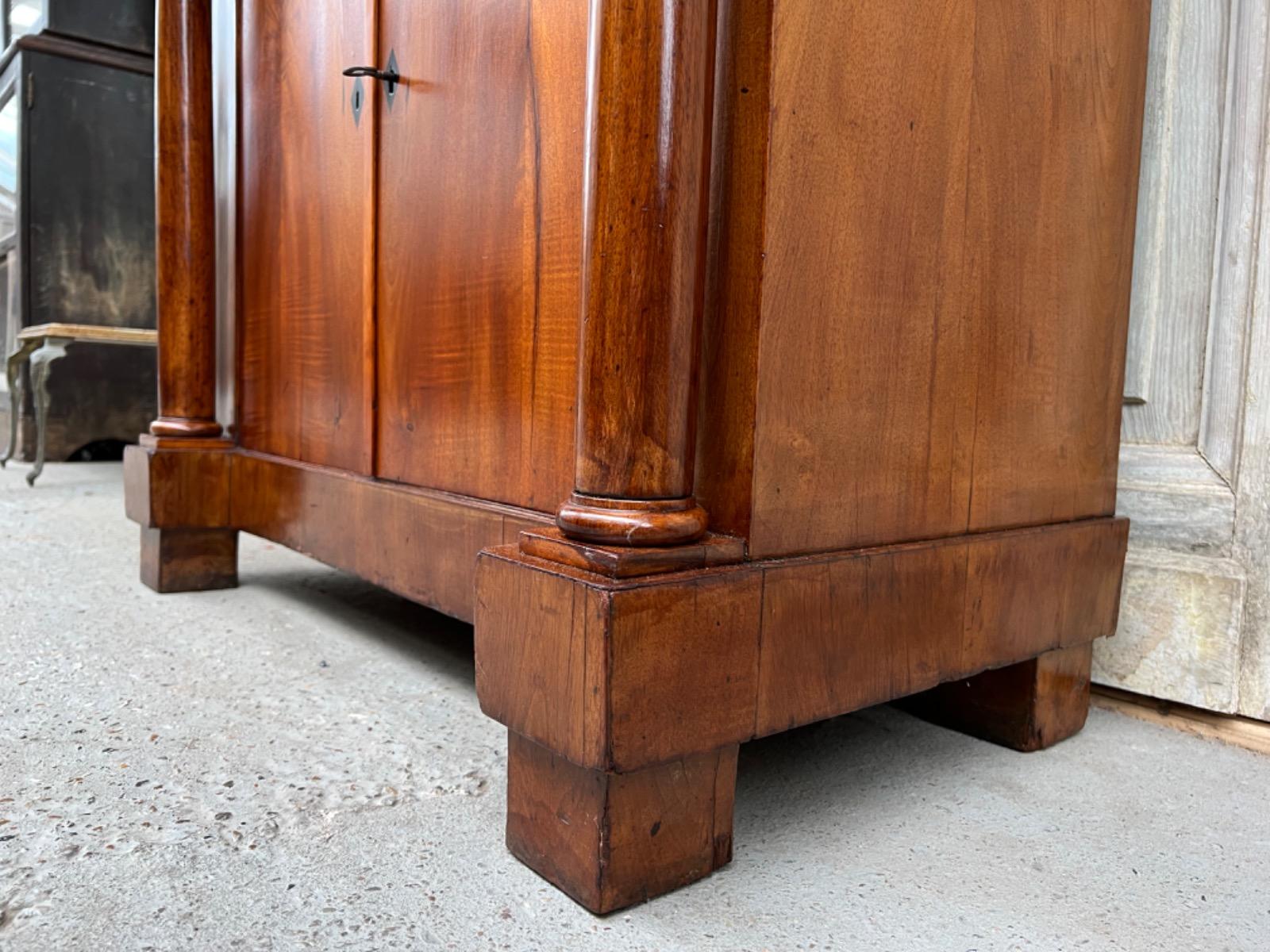Kersenhouten empire penant met volle pilaar, in Chapuis stijl met oorspronkelijk vuurvergulde messing entre Deuren met ebbenhouten ruitvorm ingelegd entré. (Chapuis) Belgisch meubel in oorspronkelijke patina en zeer goede staat. Belgie Ca. 1800-1825 Afm; H= 88 cm. B= 86 cm. D= 54 cm. Onlangs grondig nagelopen op losse delen van constructie en fineer. Geen levende houtworm aangetroffen op 7/10/2022. Pen-2476~