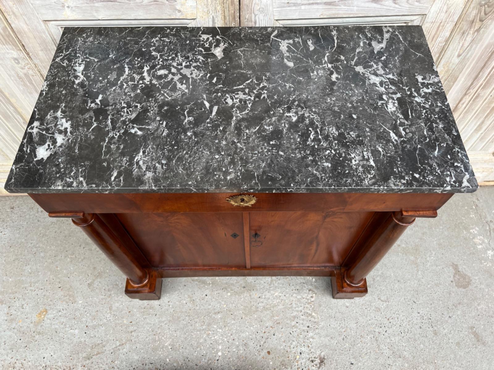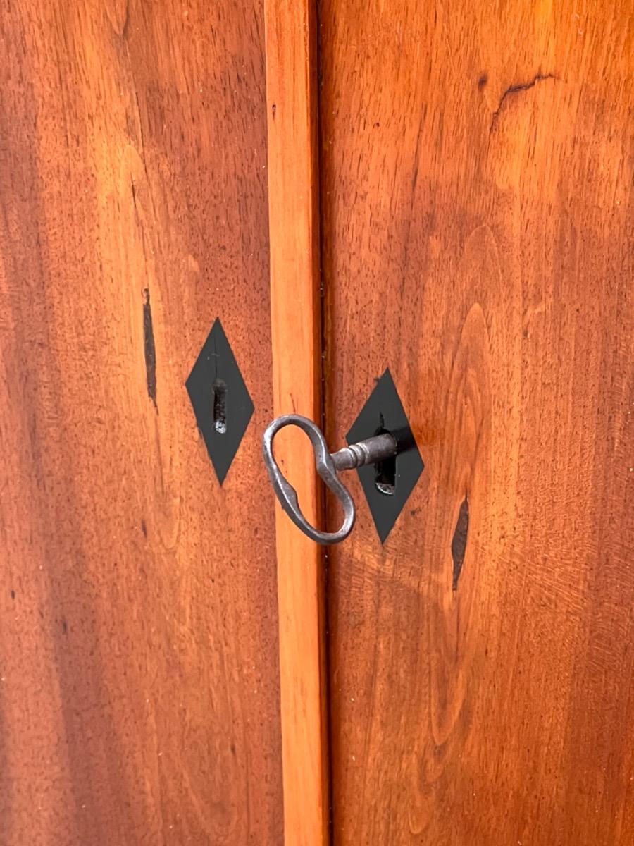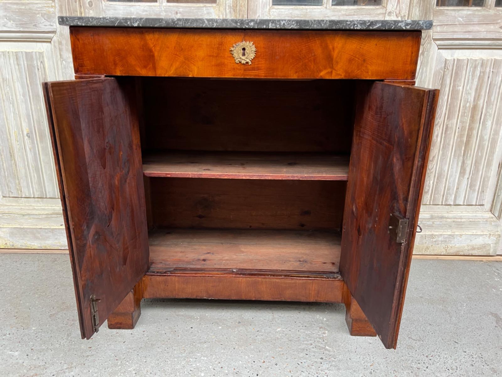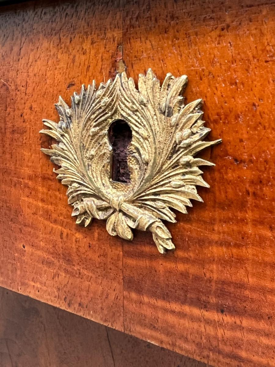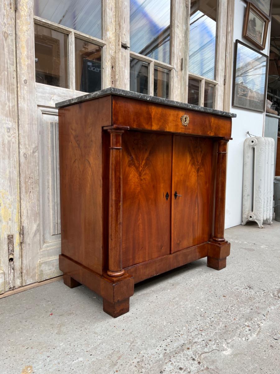 Kersenhouten empire penant met volle pilaar, in Chapuis stijl met oorspronkelijk vuurvergulde messing entre Deuren met ebbenhouten ruitvorm ingelegd entré. (Chapuis) Belgisch meubel in oorspronkelijke patina en zeer goede staat. Belgie Ca. 1800-1825 Afm; H= 88 cm. B= 86 cm. D= 54 cm. Onlangs grondig nagelopen op losse delen van constructie en fineer. Geen levende houtworm aangetroffen op 7/10/2022. Pen-2476~