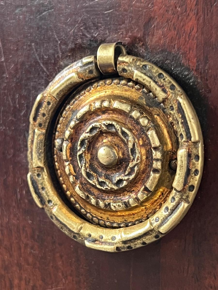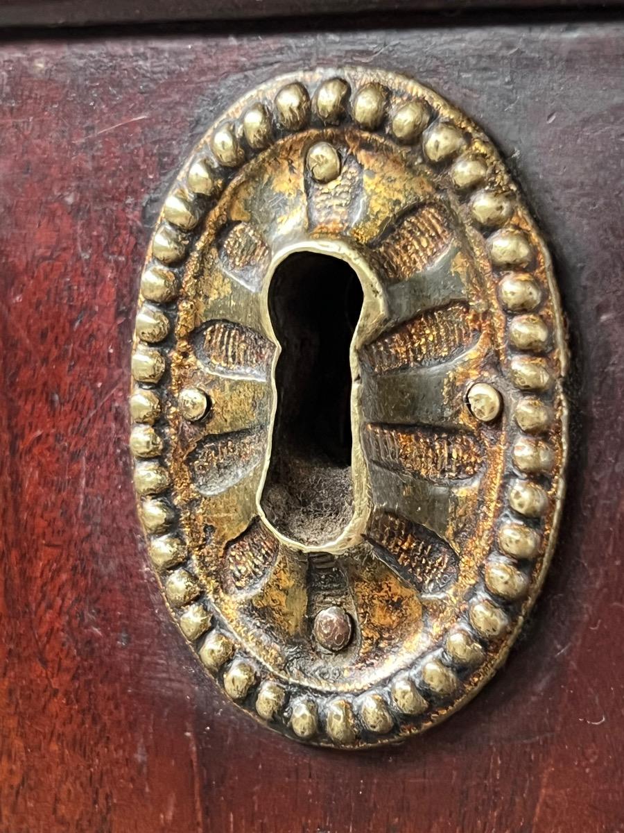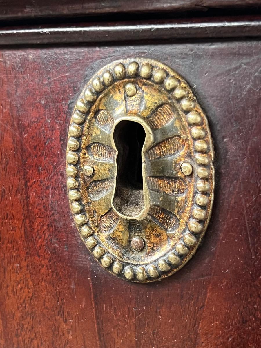 In heel goede conditie, oorspronkelijk vuur vergulde beslag, ‘sjabots’, ring beslag op de lade en knopjes.