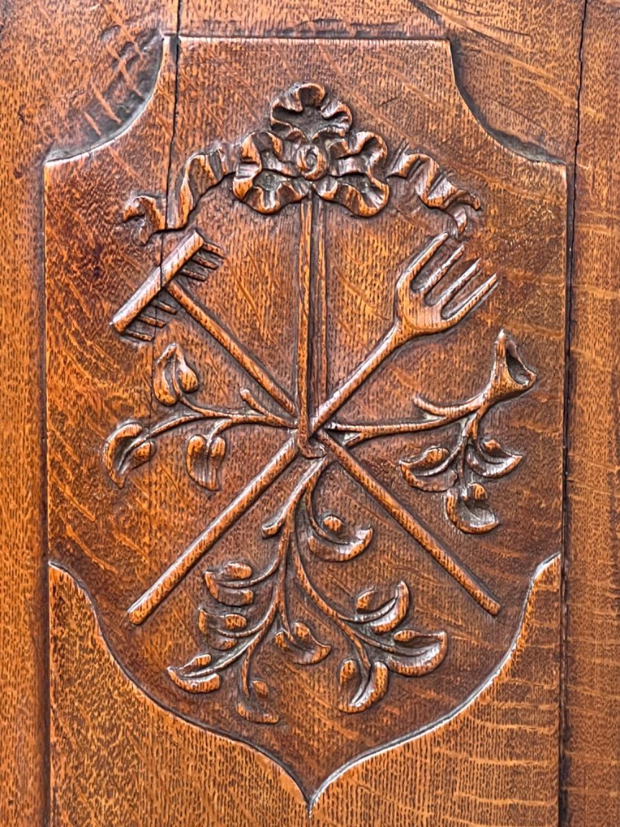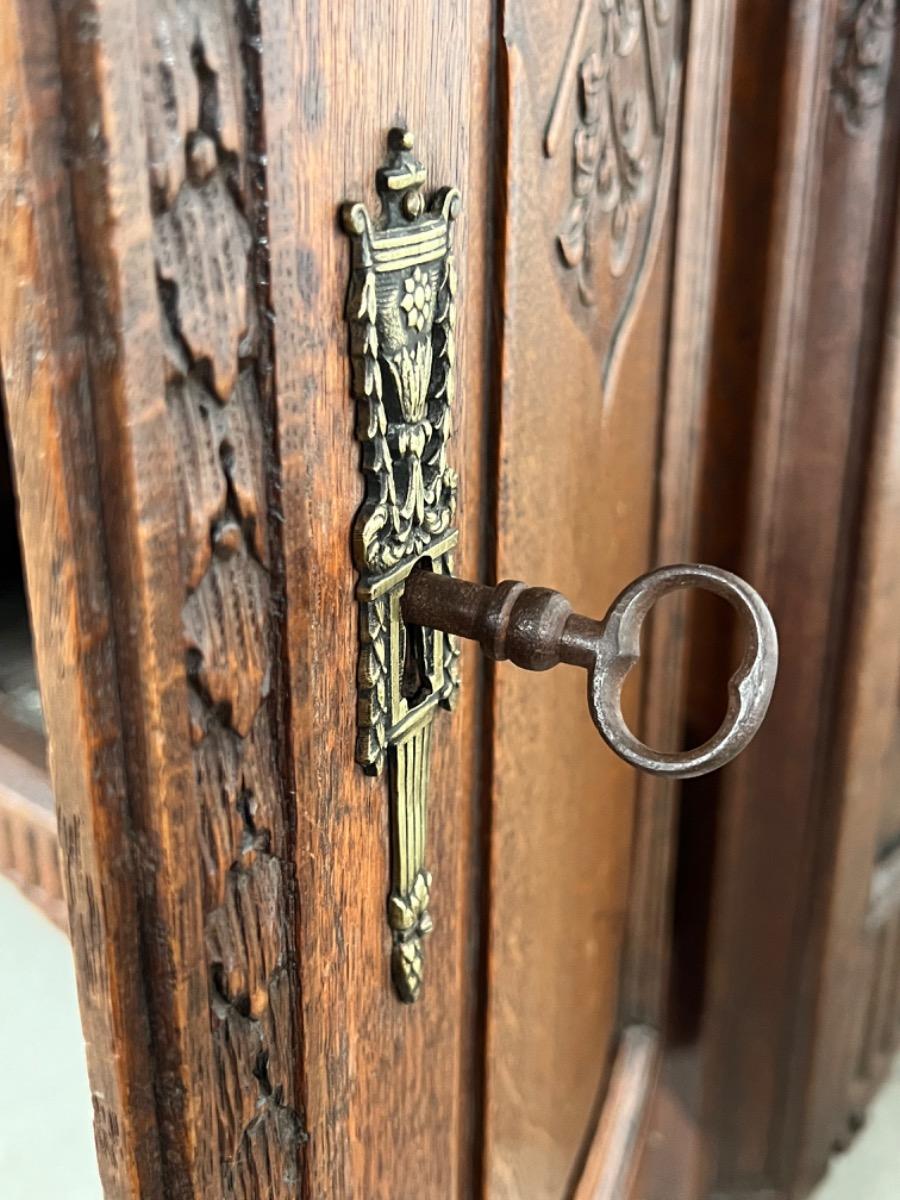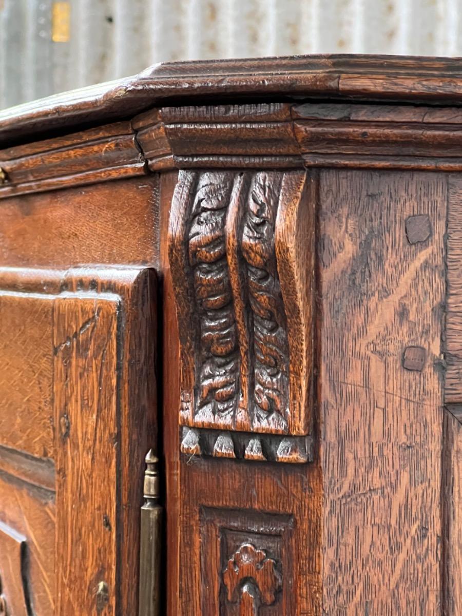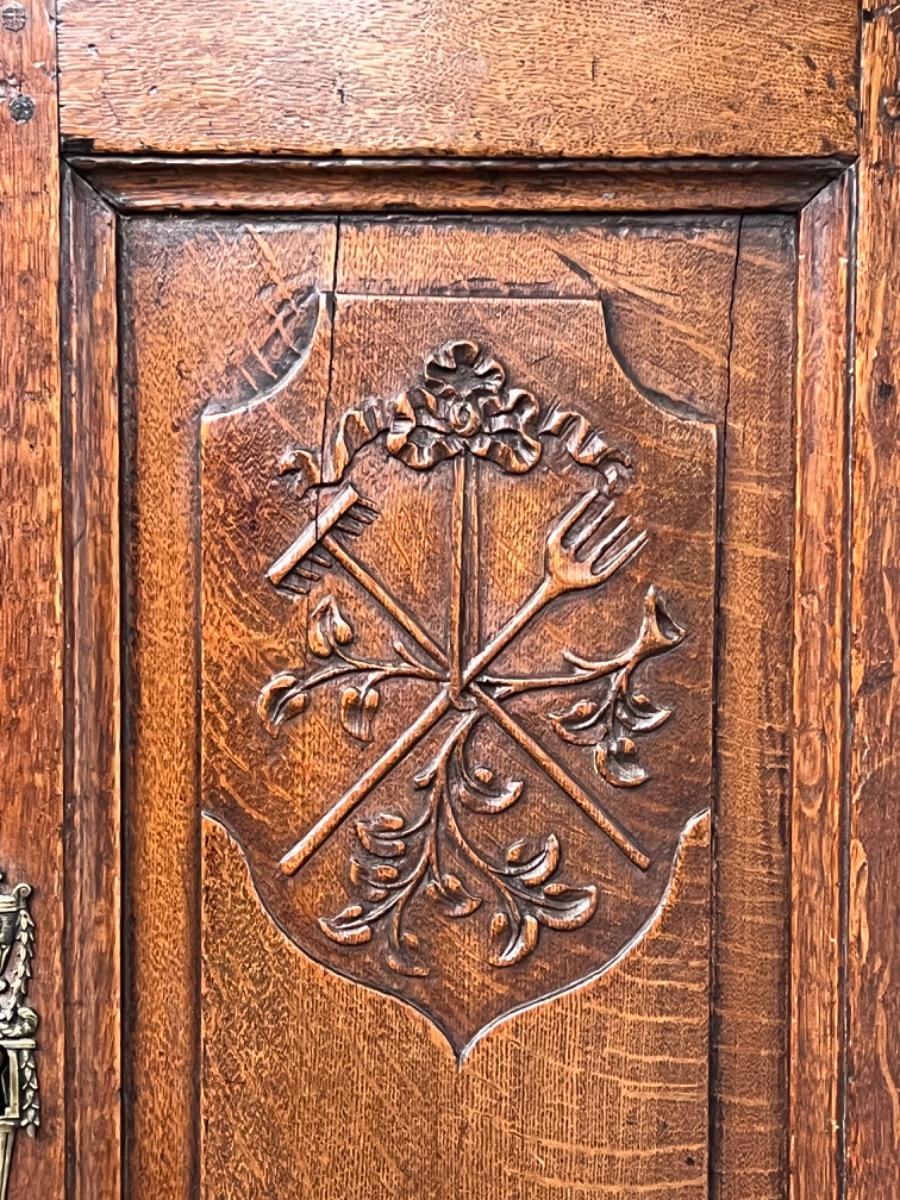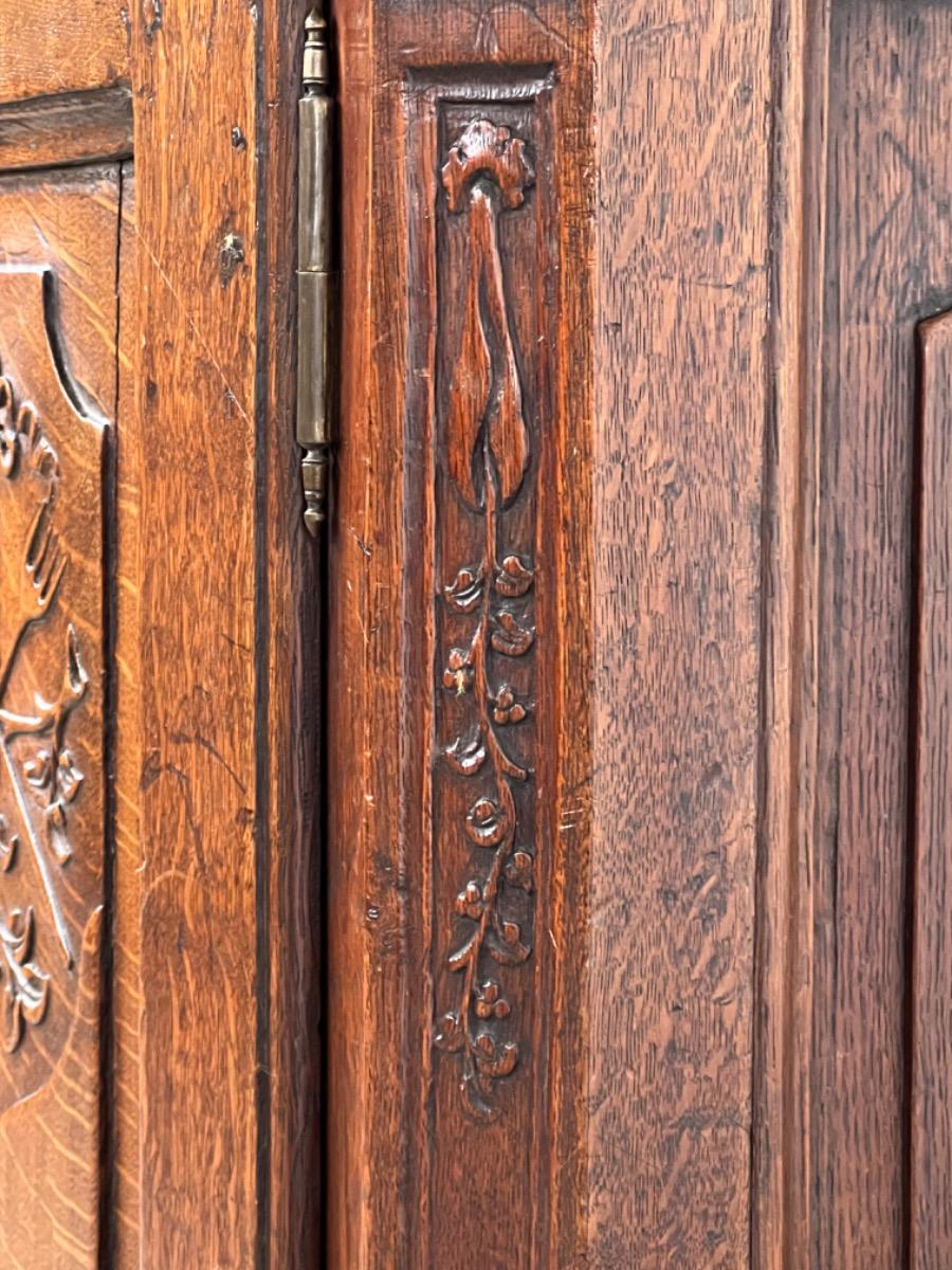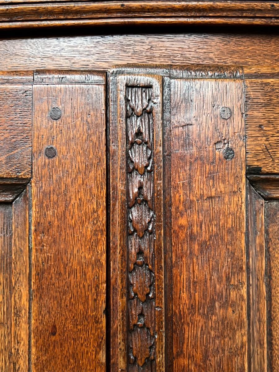 Vol eiken ‘penantkast’ met 2 paneel deuren voorzien van fraai fijn en gedetailleerd (uit) snijwerk. Zijden ook gepaneeld.