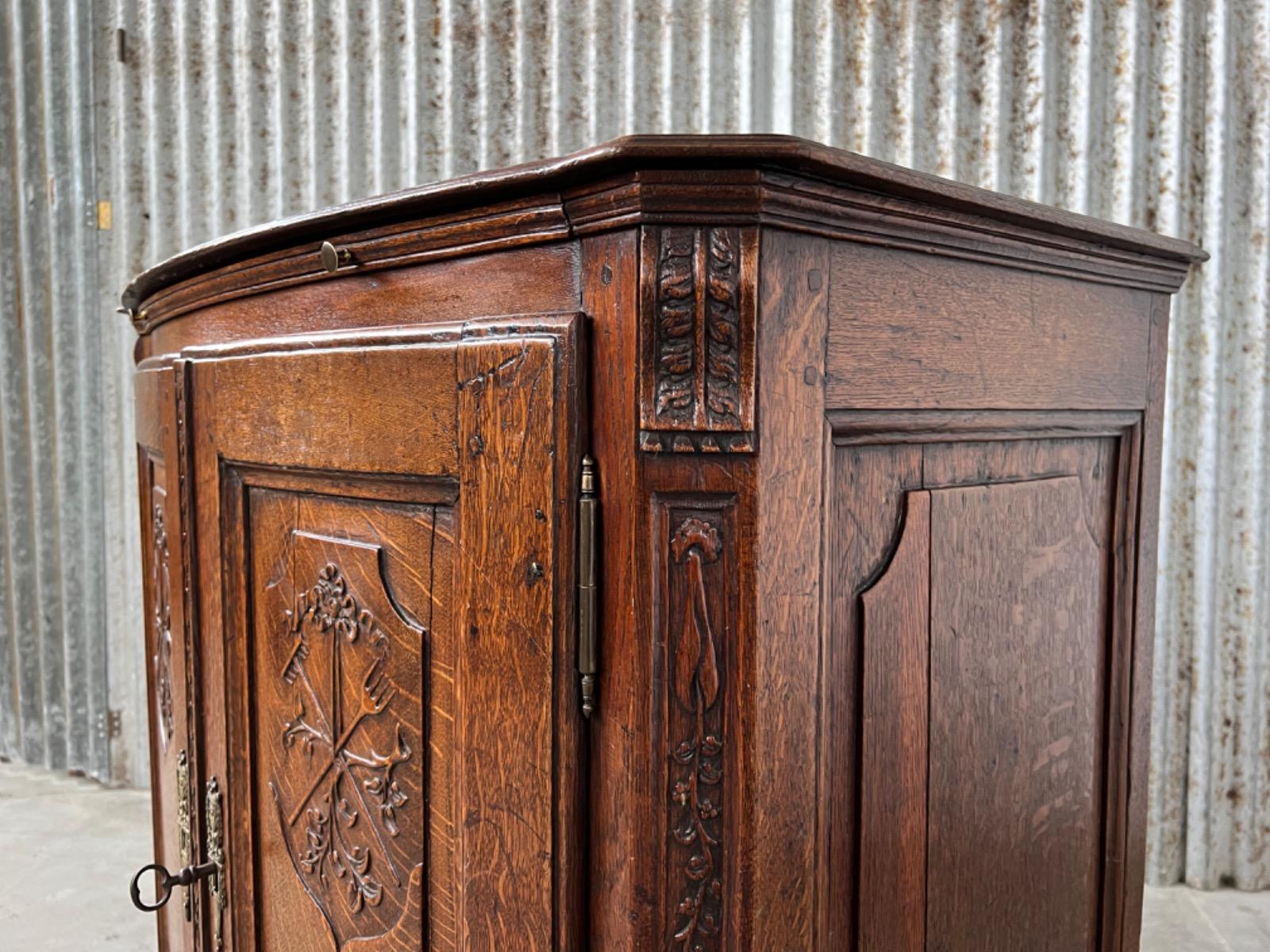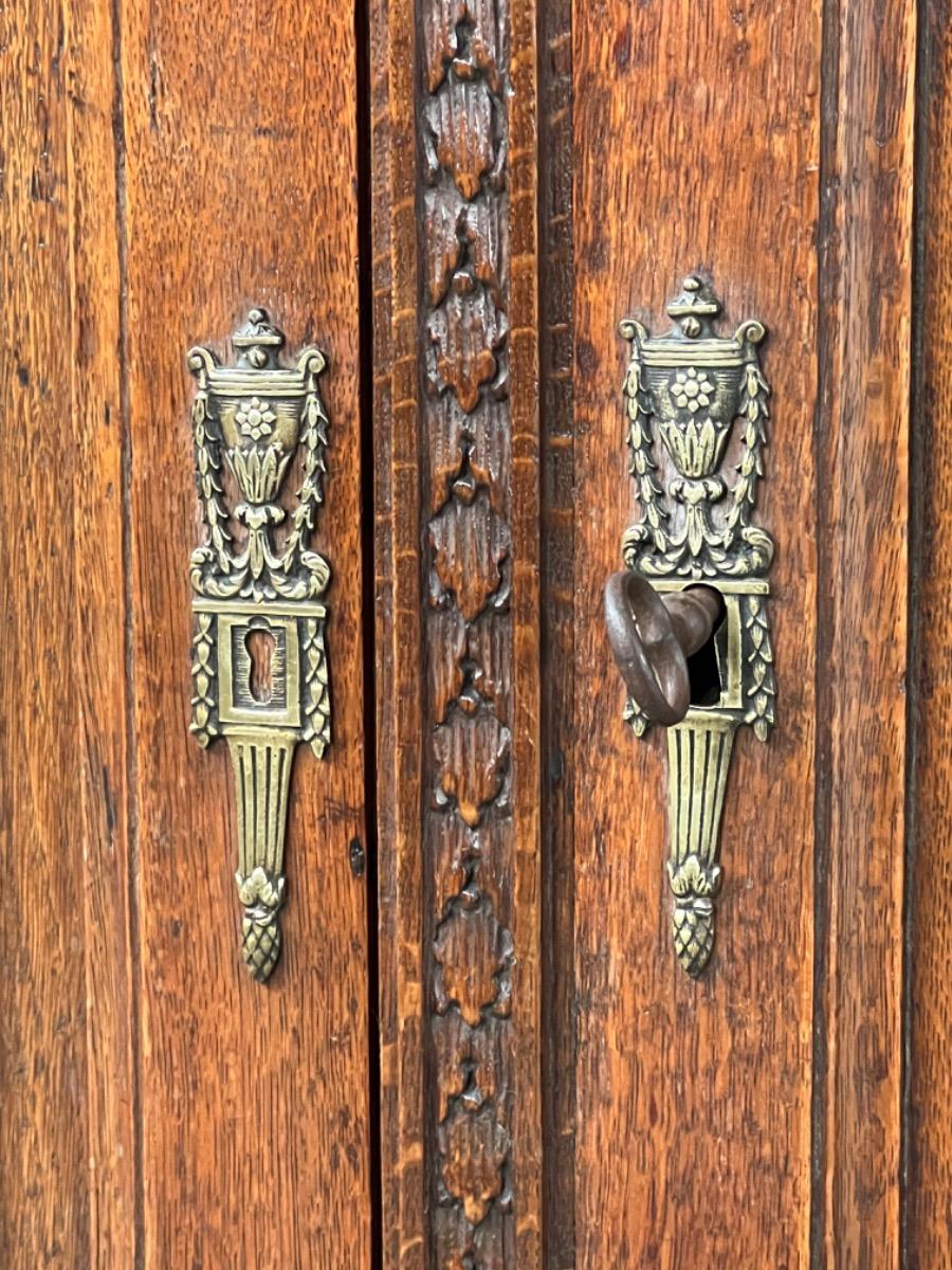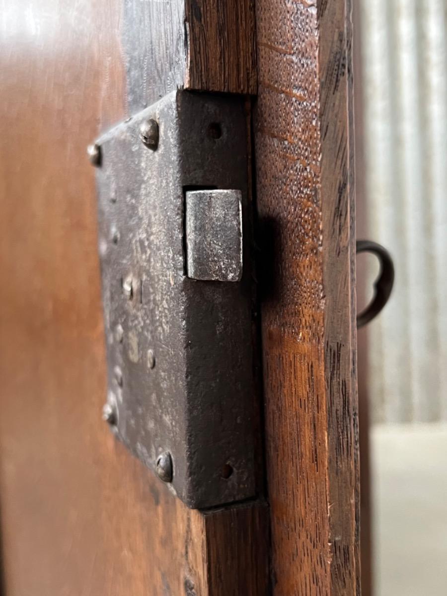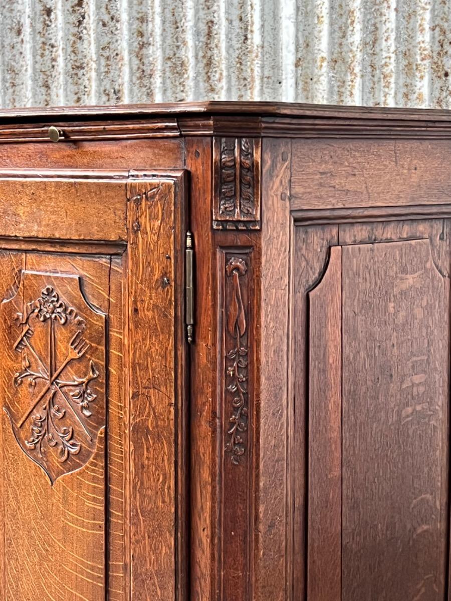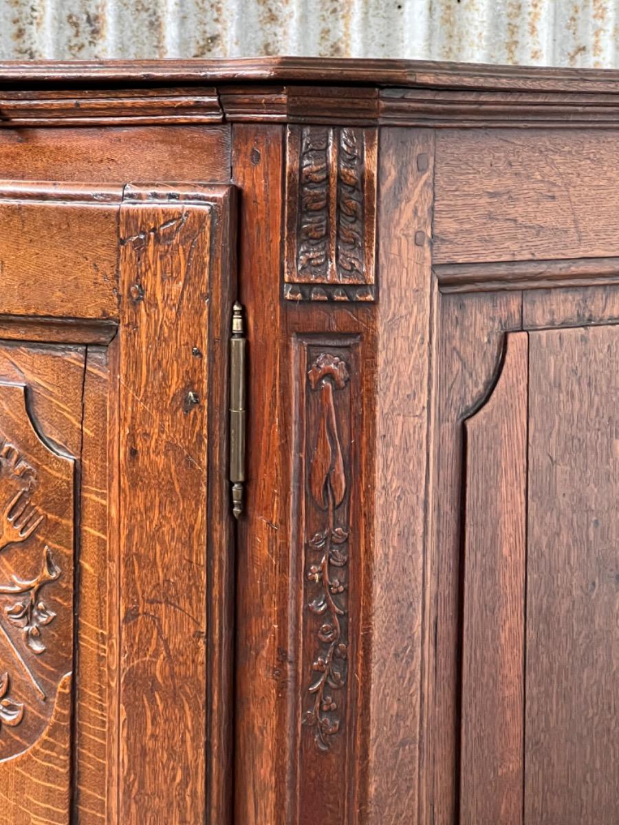 Vol eiken ‘penantkast’ met 2 paneel deuren voorzien van fraai fijn en gedetailleerd (uit) snijwerk. Zijden ook gepaneeld.