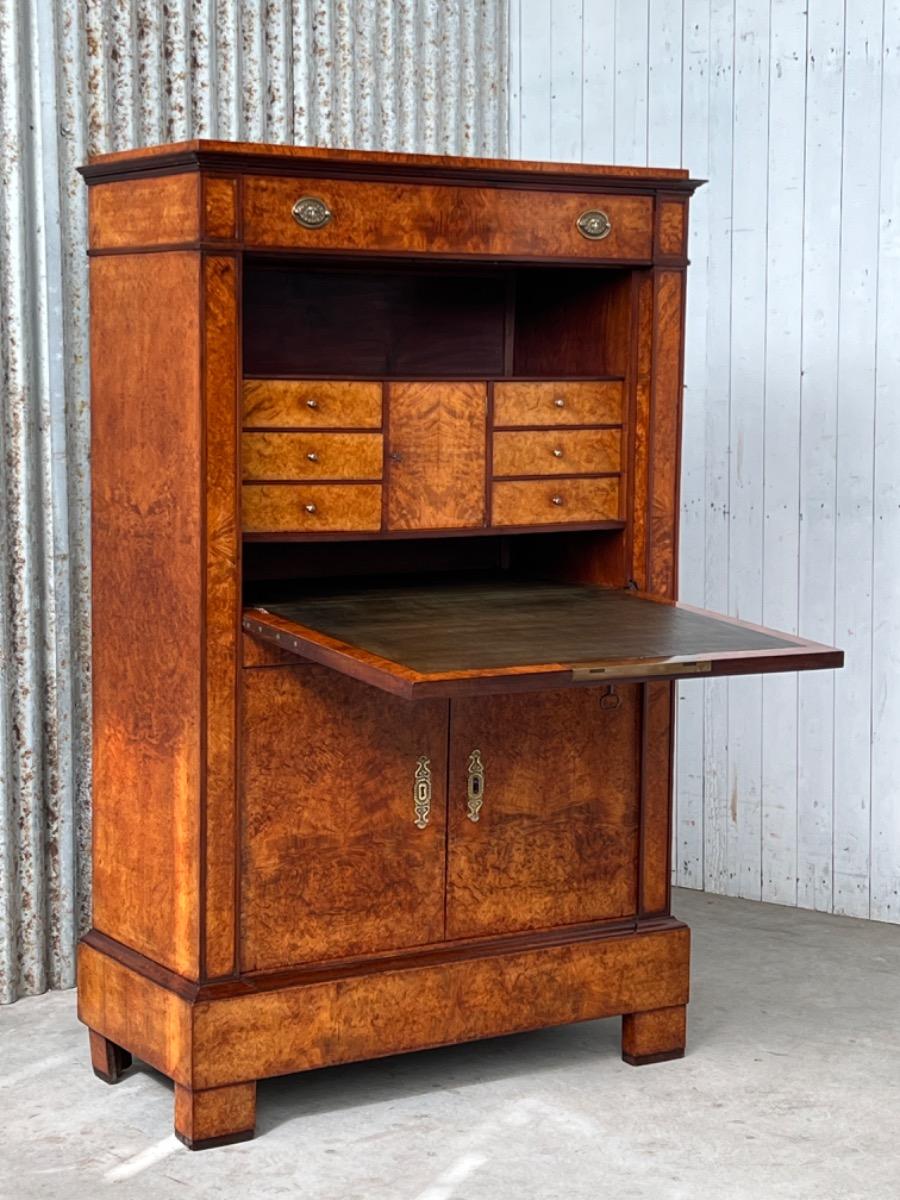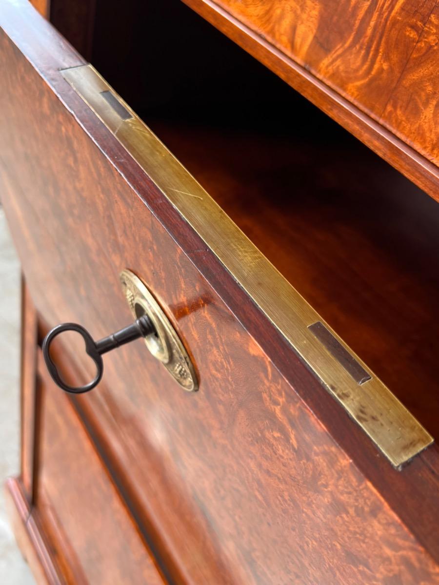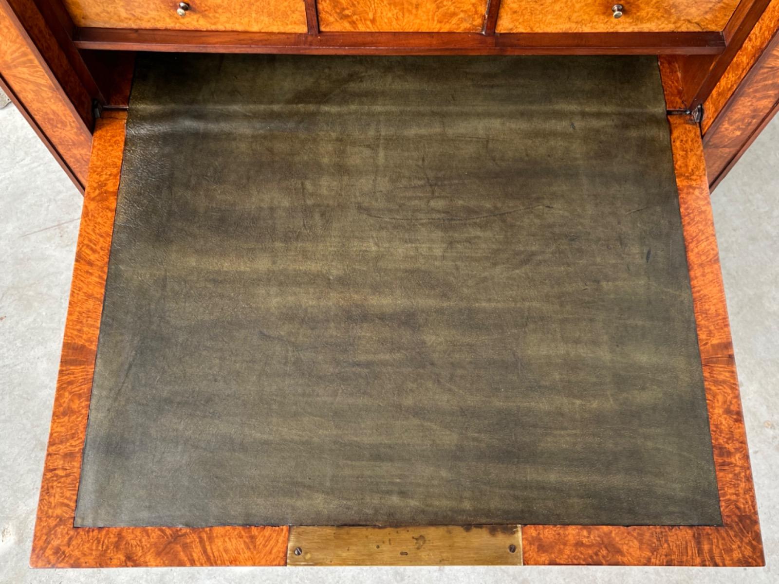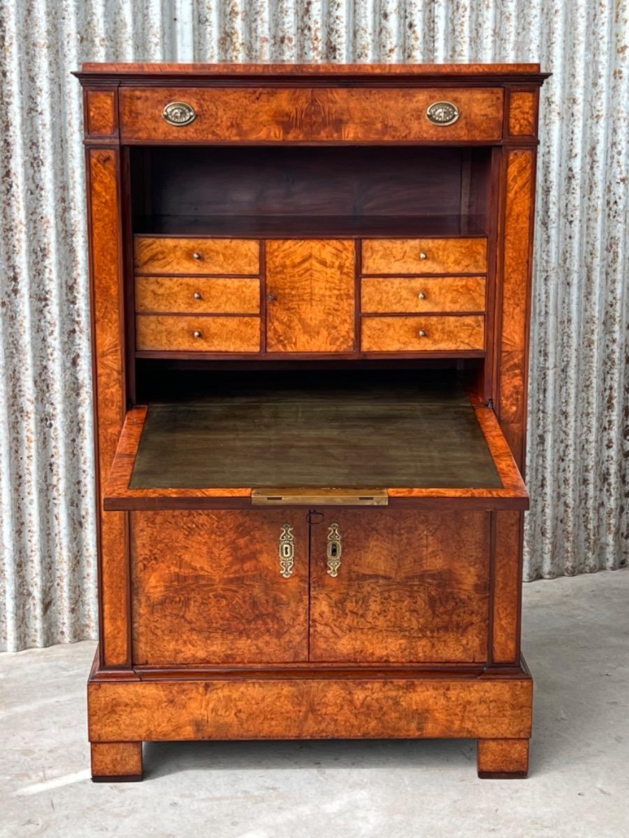 Directoire klep secretaire, Thuya / Amboina wortel gefineerd. Interieur met lade en afsluitbaar deurtje eveneens Thuya gefineerd met Padouk elementen. Klep met olijfgroen leder bekleed.