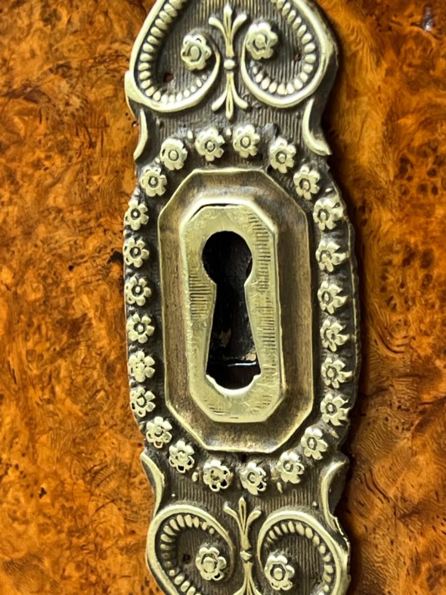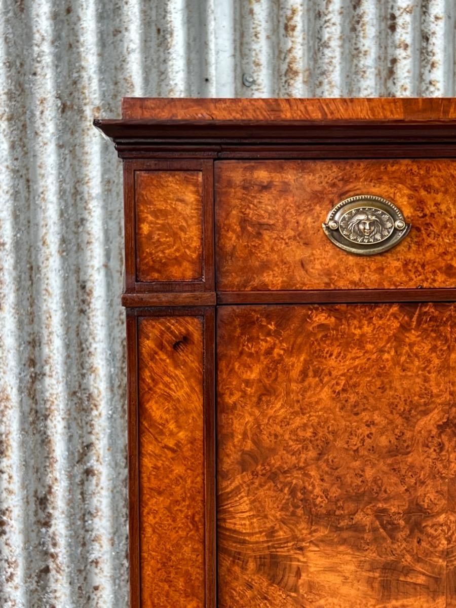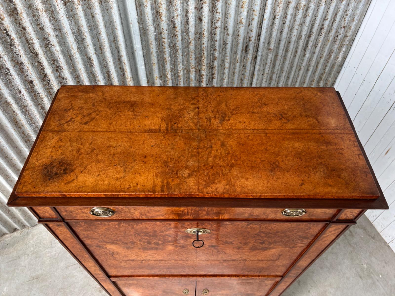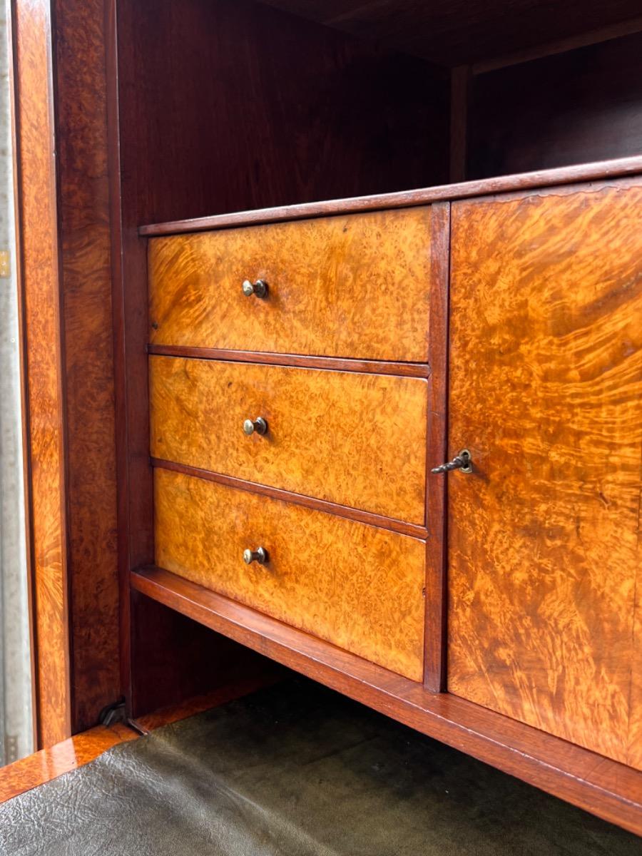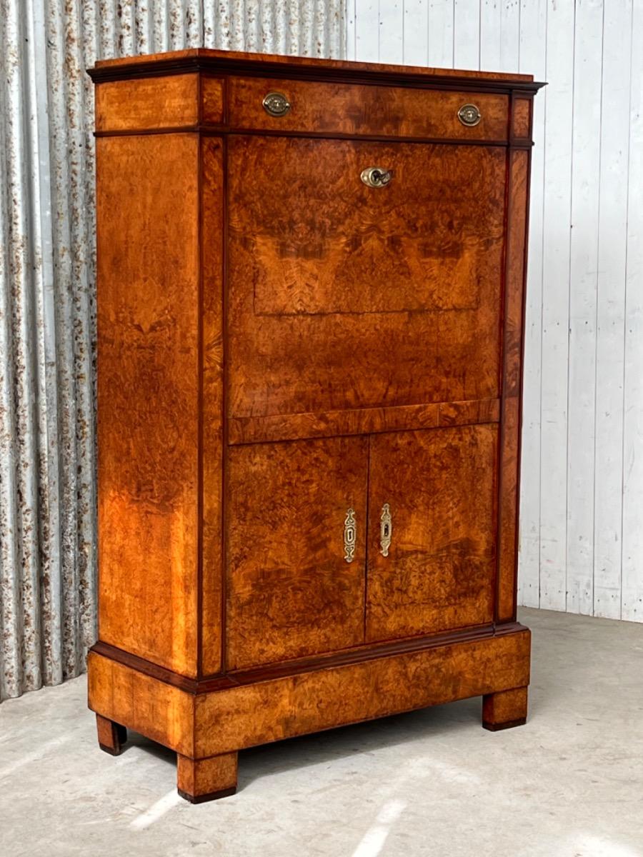 Directoire klep secretaire, Thuya / Amboina wortel gefineerd. Interieur met lade en afsluitbaar deurtje eveneens Thuya gefineerd met Padouk elementen. Klep met olijfgroen leder bekleed.