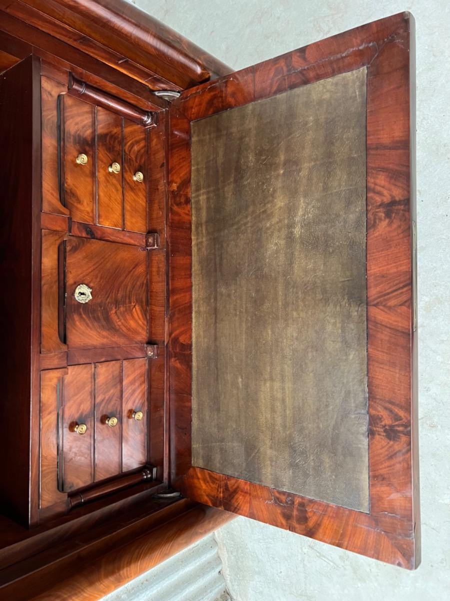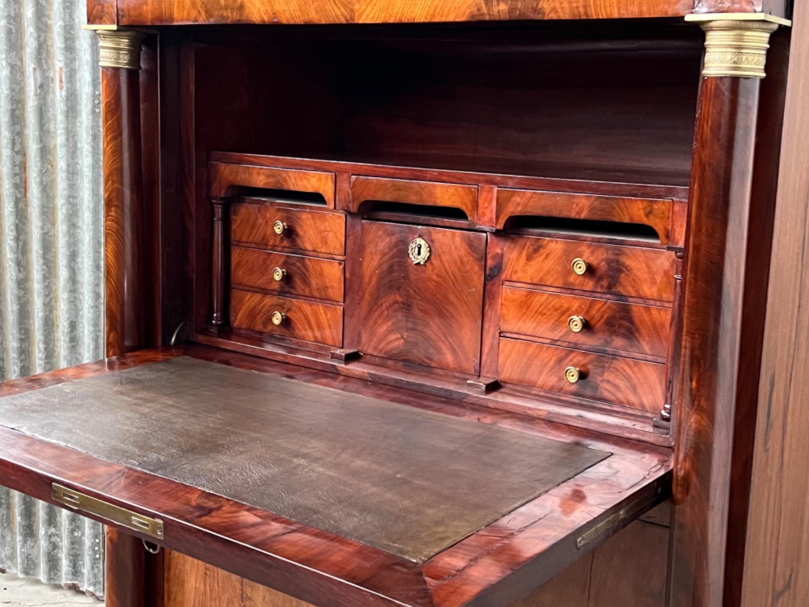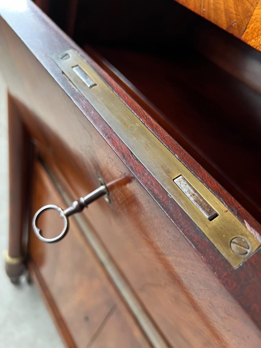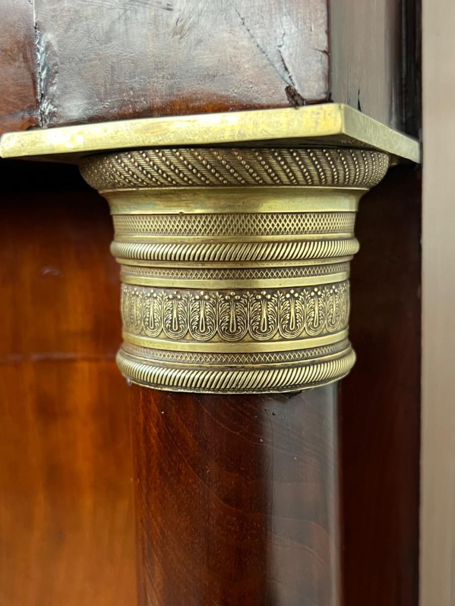 Strak model,zeer fraai boek bloem mahonie gefineerd. Overstekende kap lade en pilaren met vuur verguld beslag.