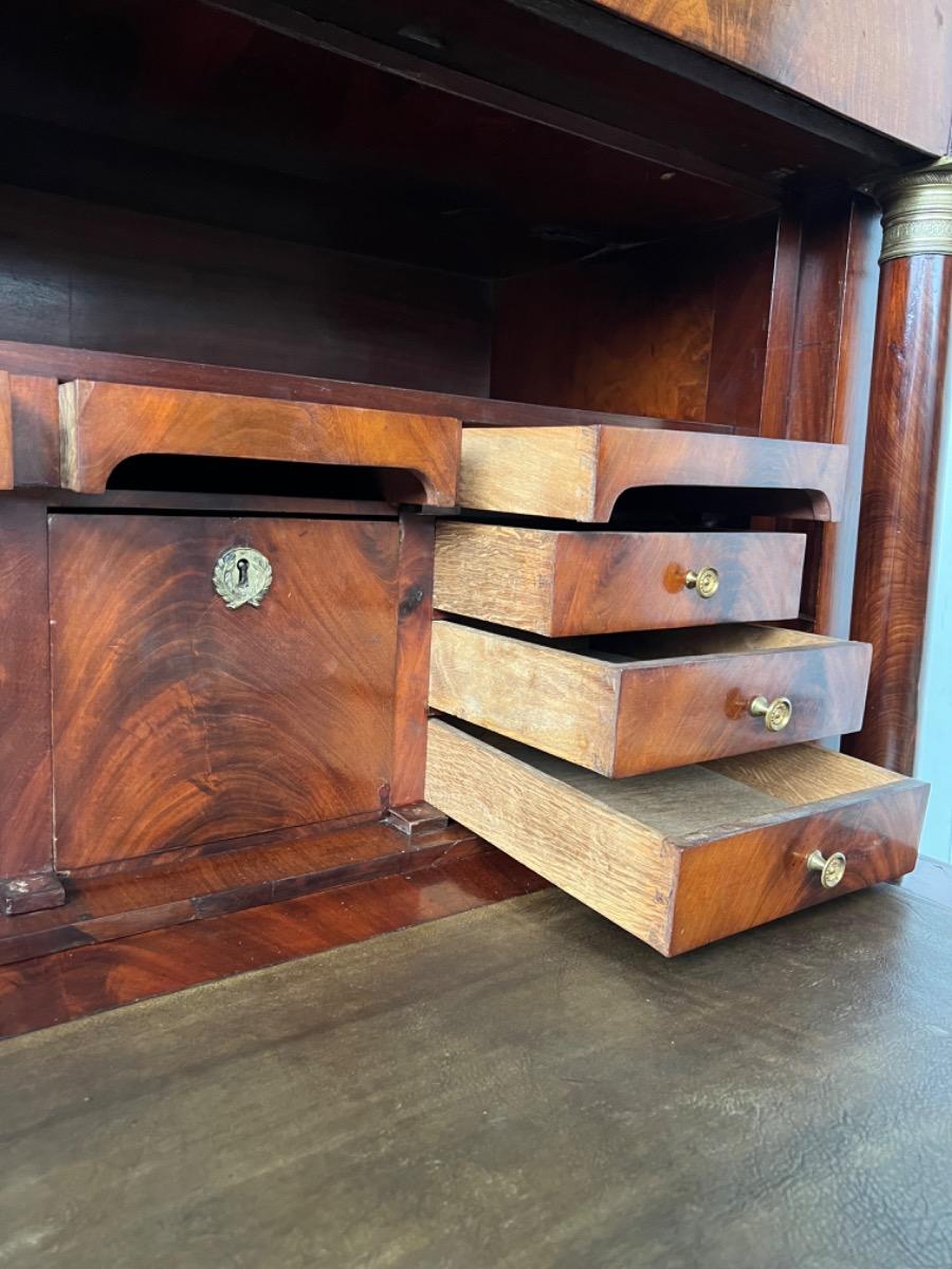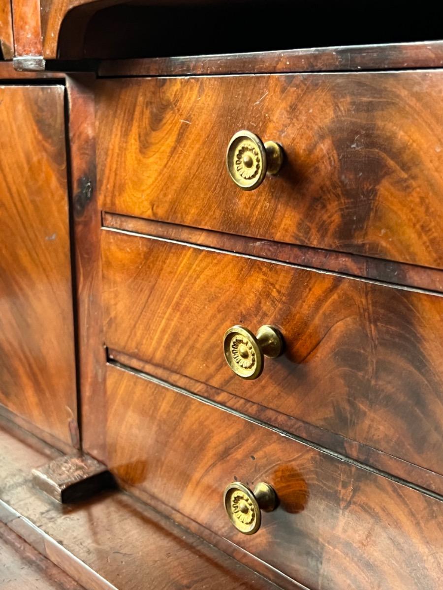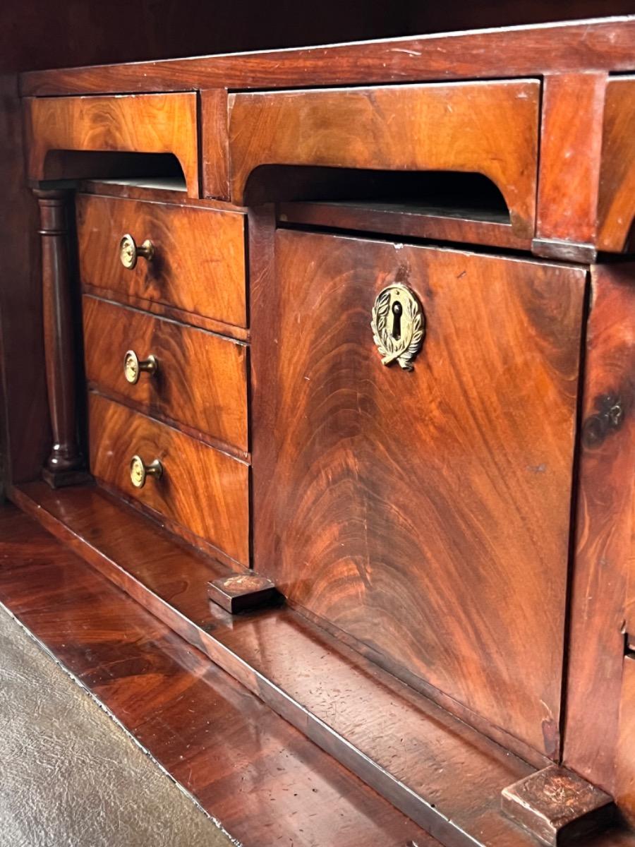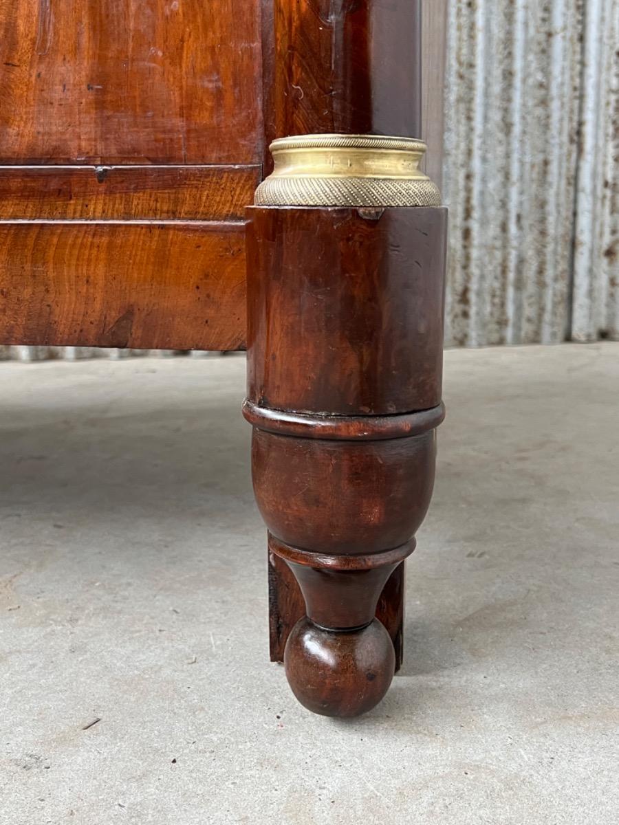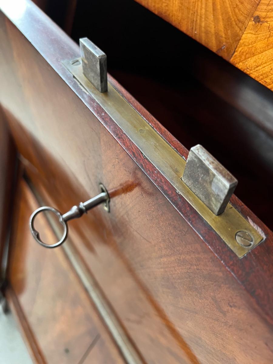 Strak model,zeer fraai boek bloem mahonie gefineerd. Overstekende kap lade en pilaren met vuur verguld beslag.