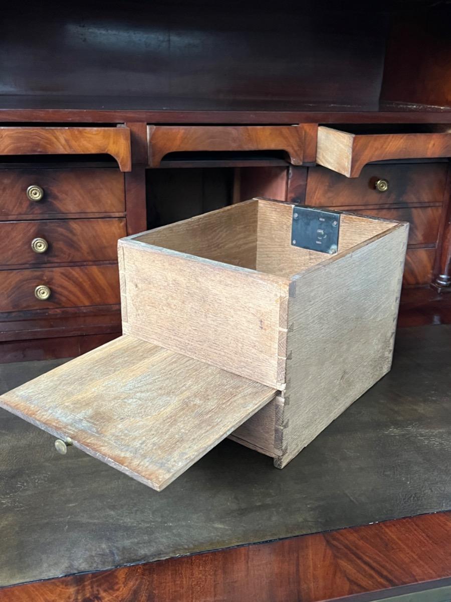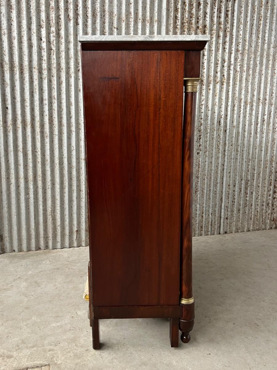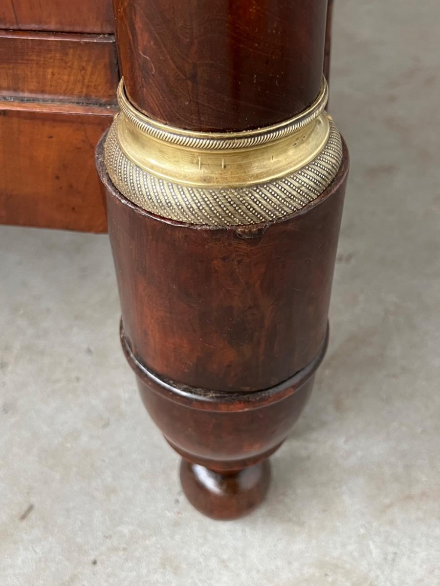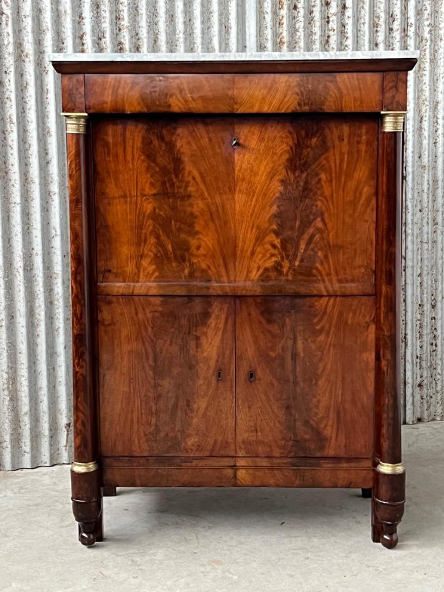 Strak model,zeer fraai boek bloem mahonie gefineerd. Overstekende kap lade en pilaren met vuur verguld beslag.