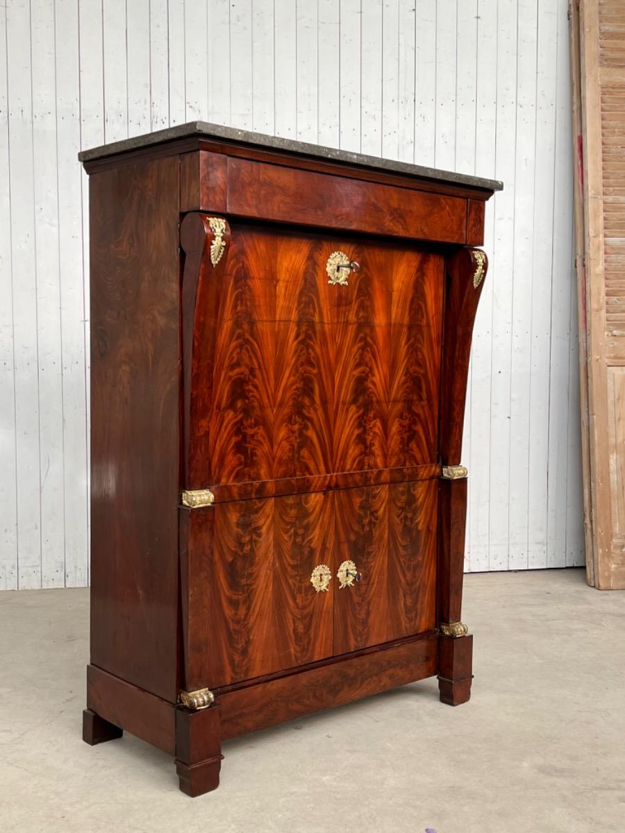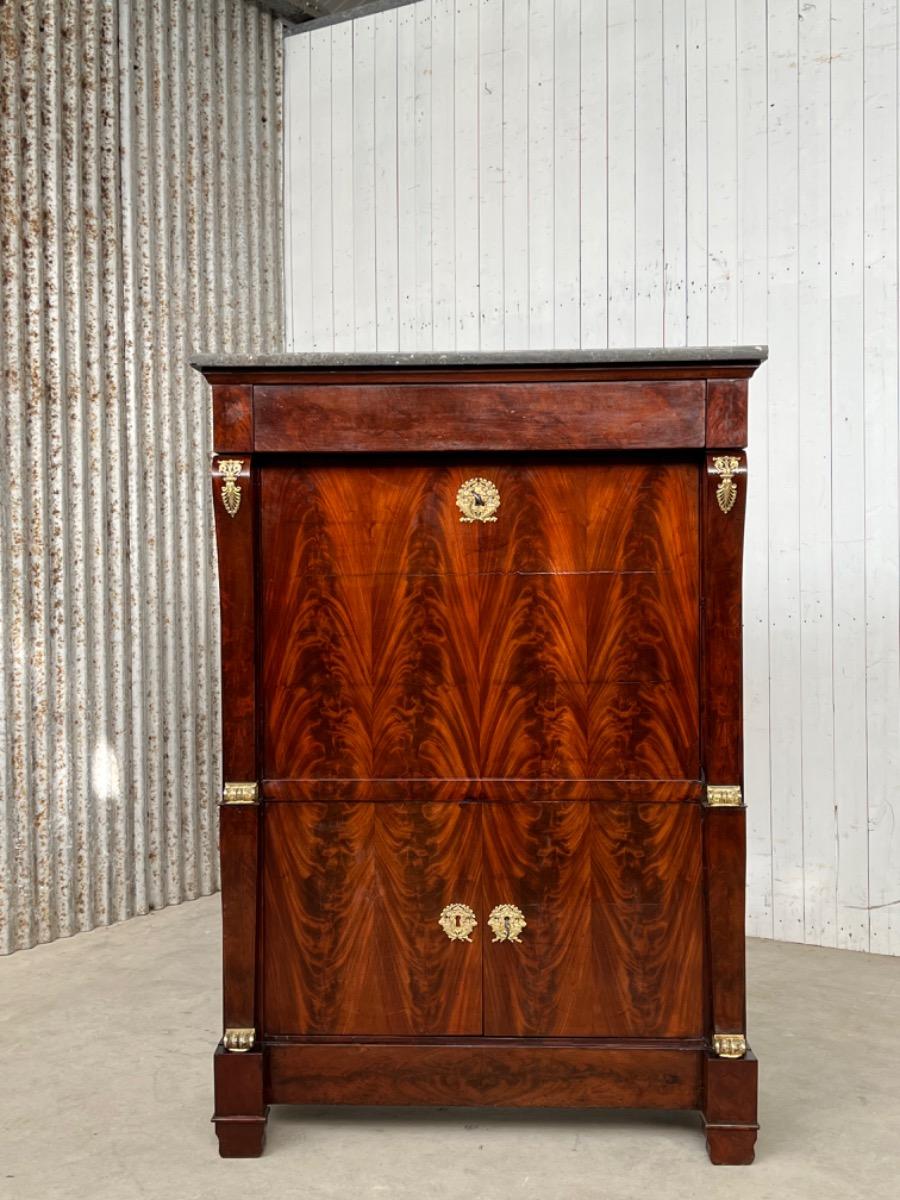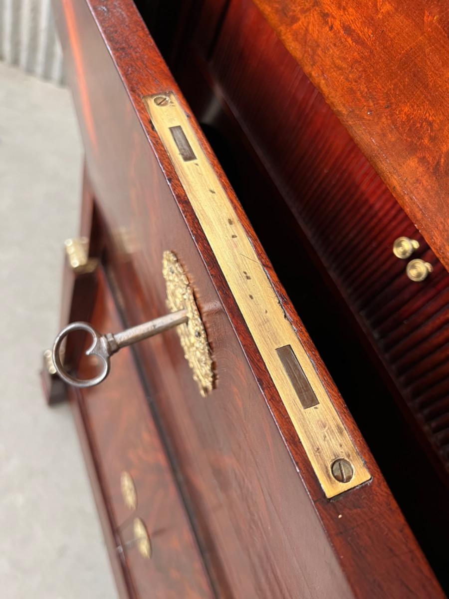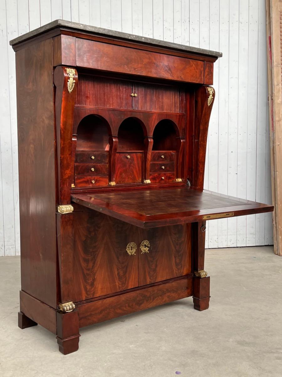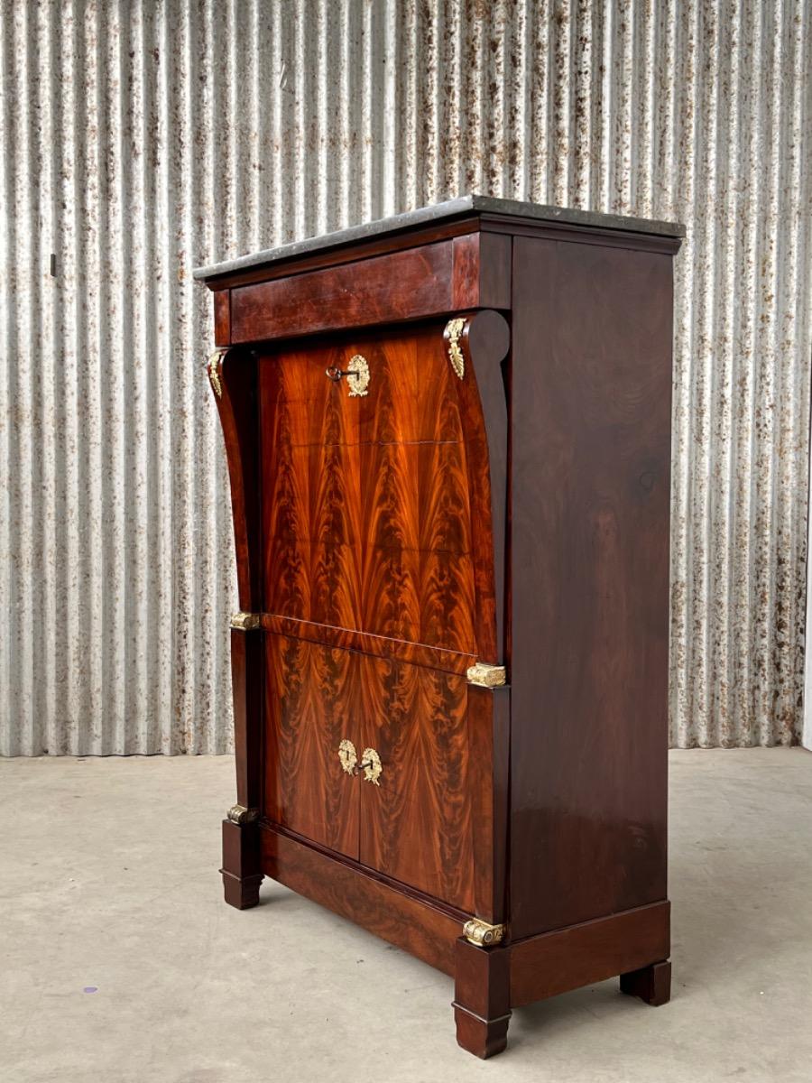 Strak model, zeer fraai boek bloem mahonie gefineerd. overstekende kap lade met overdadig veel vuur verguld beslag. Het interieur vol met laden, centrale lade met verborgen vak / kelder. De voluut vormige pilaren met eveneens verguld beslag, tussen de interrieur laden zijn gelijk ook geheime vakken. Alle laden hebben als blind hout ook mahonie! (zie fotoo) De klep is ingelegd met olijf groen kalfsleder, het oorspronkelijke slot is werkend met sleutel (en 1 reserve sleutel). Onder de klep, twee deuren met daarachter een drie laads onderkast eveneens met vuur verguld knop beslag. Geheel is gedragen door 4, voor de "epoque" peroide gekenmerkte blokpoten. Het meubel is gedekt met zijn oorspronkelijke grijze marmer. Alles compleet en werkend, in zeer goede en direct te gebruiken staat. Frankrijk, ca. 1800 - 1815. Afm: H= 148 cm. B= 103 cm. D= 51 cm. Onlangs grondig nagelopen op losse delen van constructie en fineer. Houtworm controle : Geen levende houtworm aangetroffen 27/11/2021 sec-2241~
