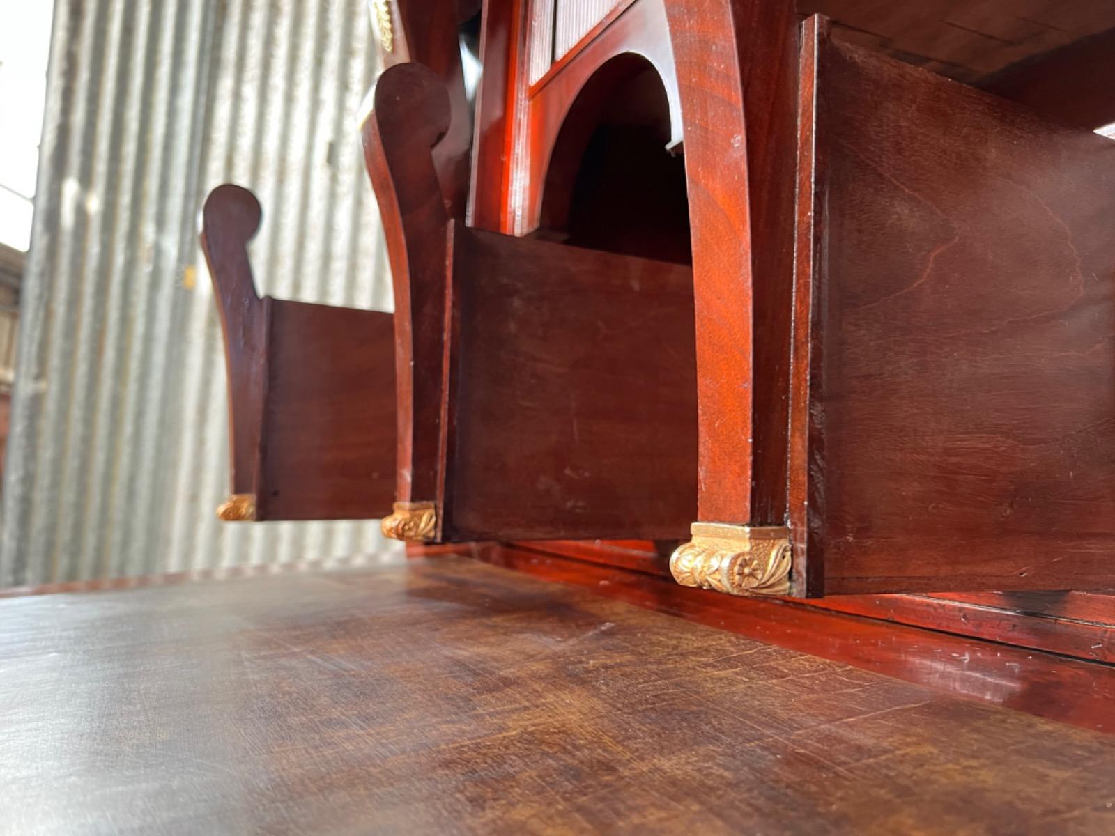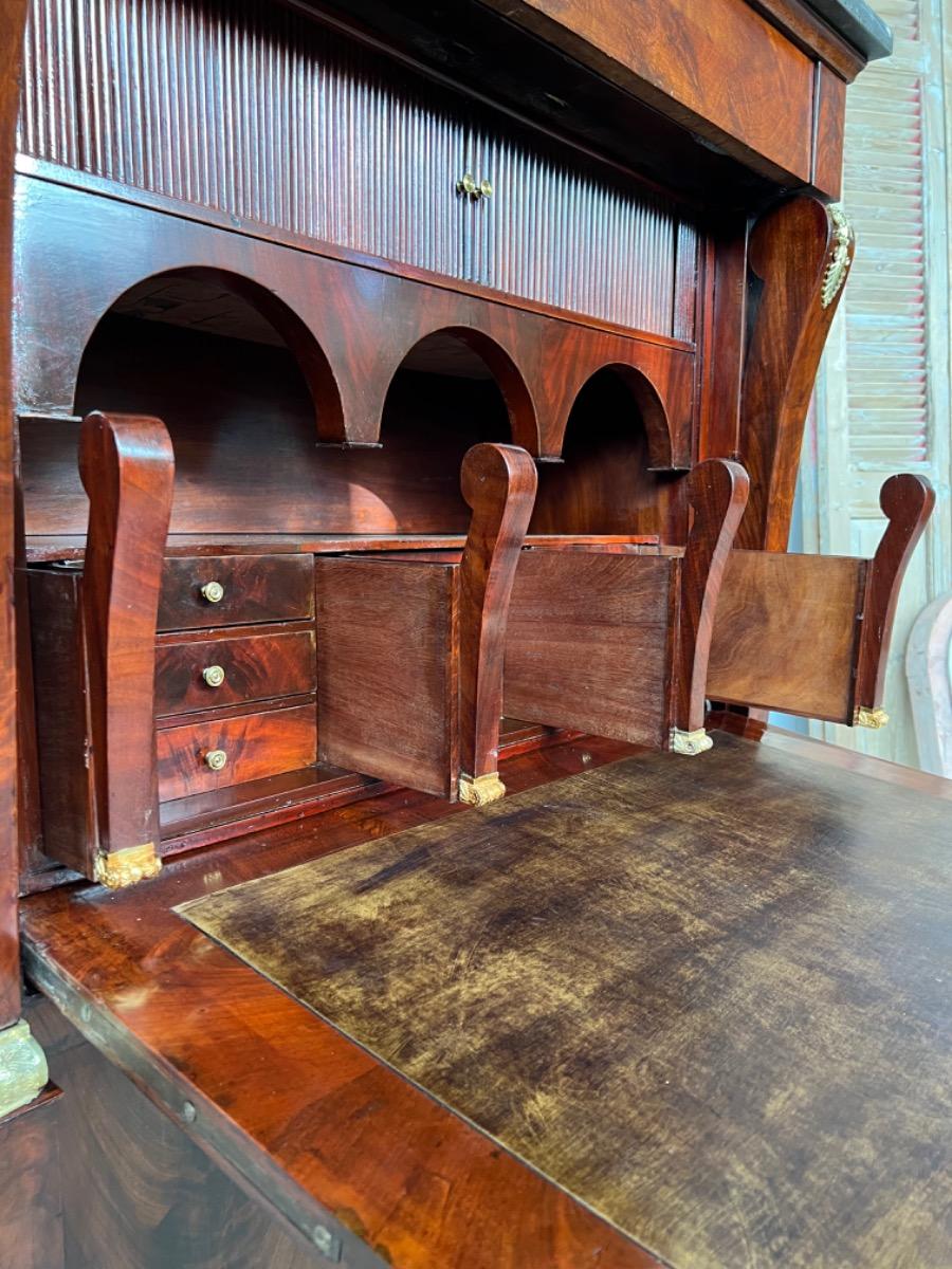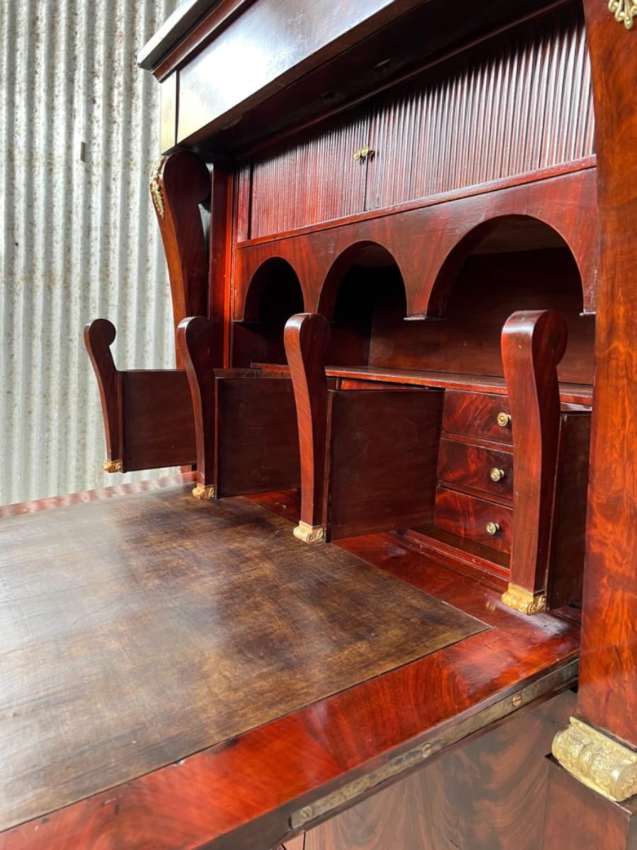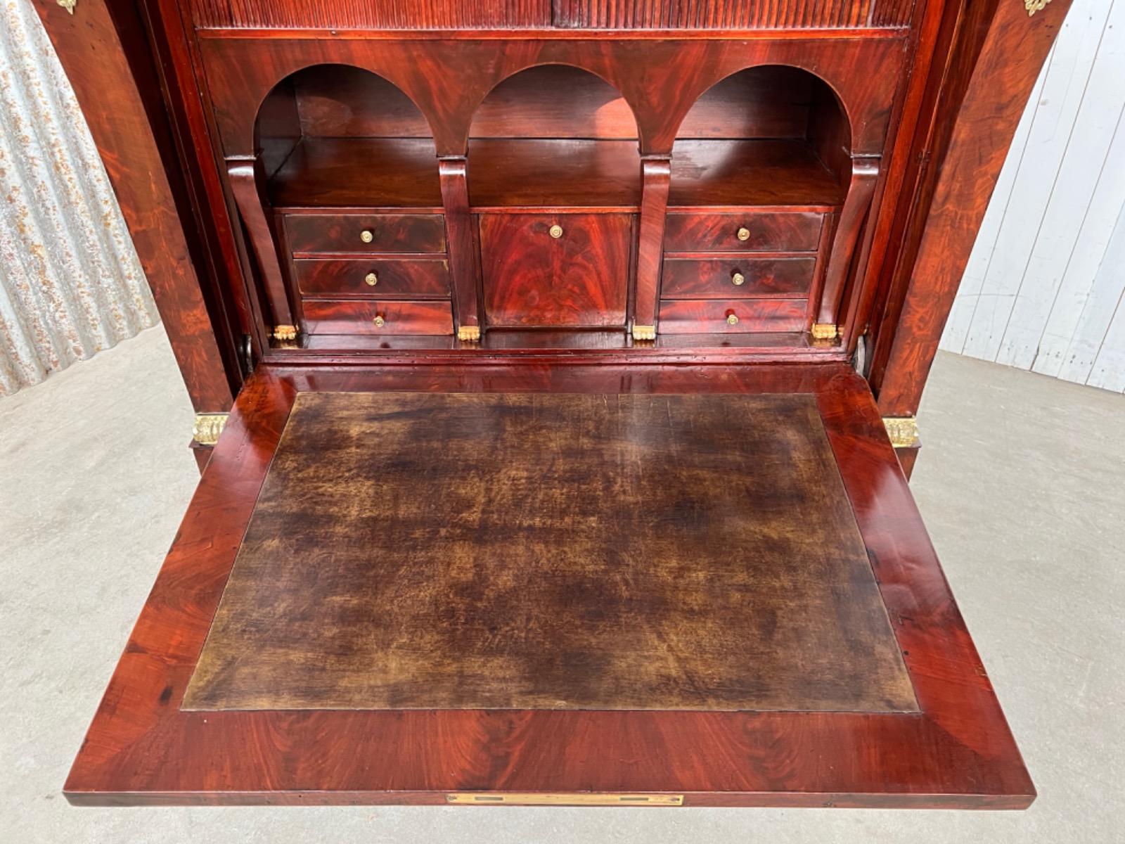 Strak model, zeer fraai boek bloem mahonie gefineerd. overstekende kap lade met overdadig veel vuur verguld beslag. Het interieur vol met laden, centrale lade met verborgen vak / kelder. De voluut vormige pilaren met eveneens verguld beslag, tussen de interrieur laden zijn gelijk ook geheime vakken. Alle laden hebben als blind hout ook mahonie! (zie fotoo) De klep is ingelegd met olijf groen kalfsleder, het oorspronkelijke slot is werkend met sleutel (en 1 reserve sleutel). Onder de klep, twee deuren met daarachter een drie laads onderkast eveneens met vuur verguld knop beslag. Geheel is gedragen door 4, voor de "epoque" peroide gekenmerkte blokpoten. Het meubel is gedekt met zijn oorspronkelijke grijze marmer. Alles compleet en werkend, in zeer goede en direct te gebruiken staat. Frankrijk, ca. 1800 - 1815. Afm: H= 148 cm. B= 103 cm. D= 51 cm. Onlangs grondig nagelopen op losse delen van constructie en fineer. Houtworm controle : Geen levende houtworm aangetroffen 27/11/2021 sec-2241~