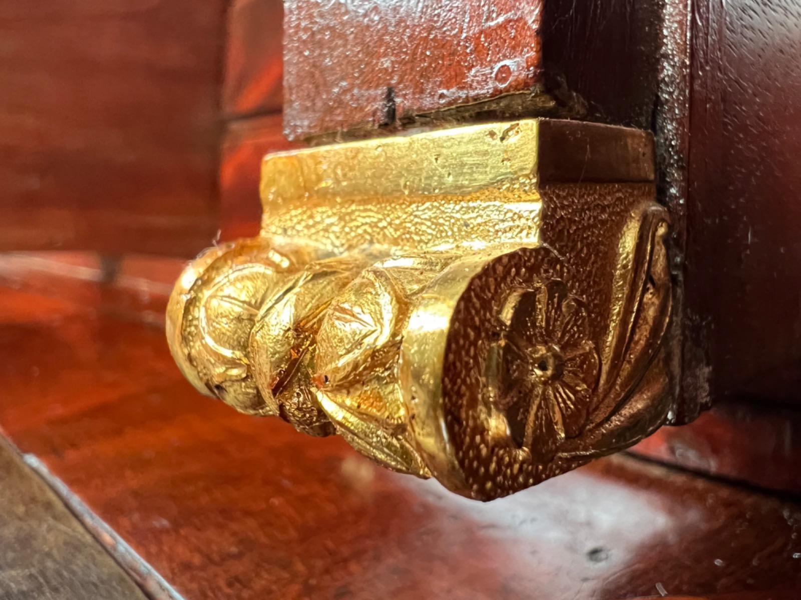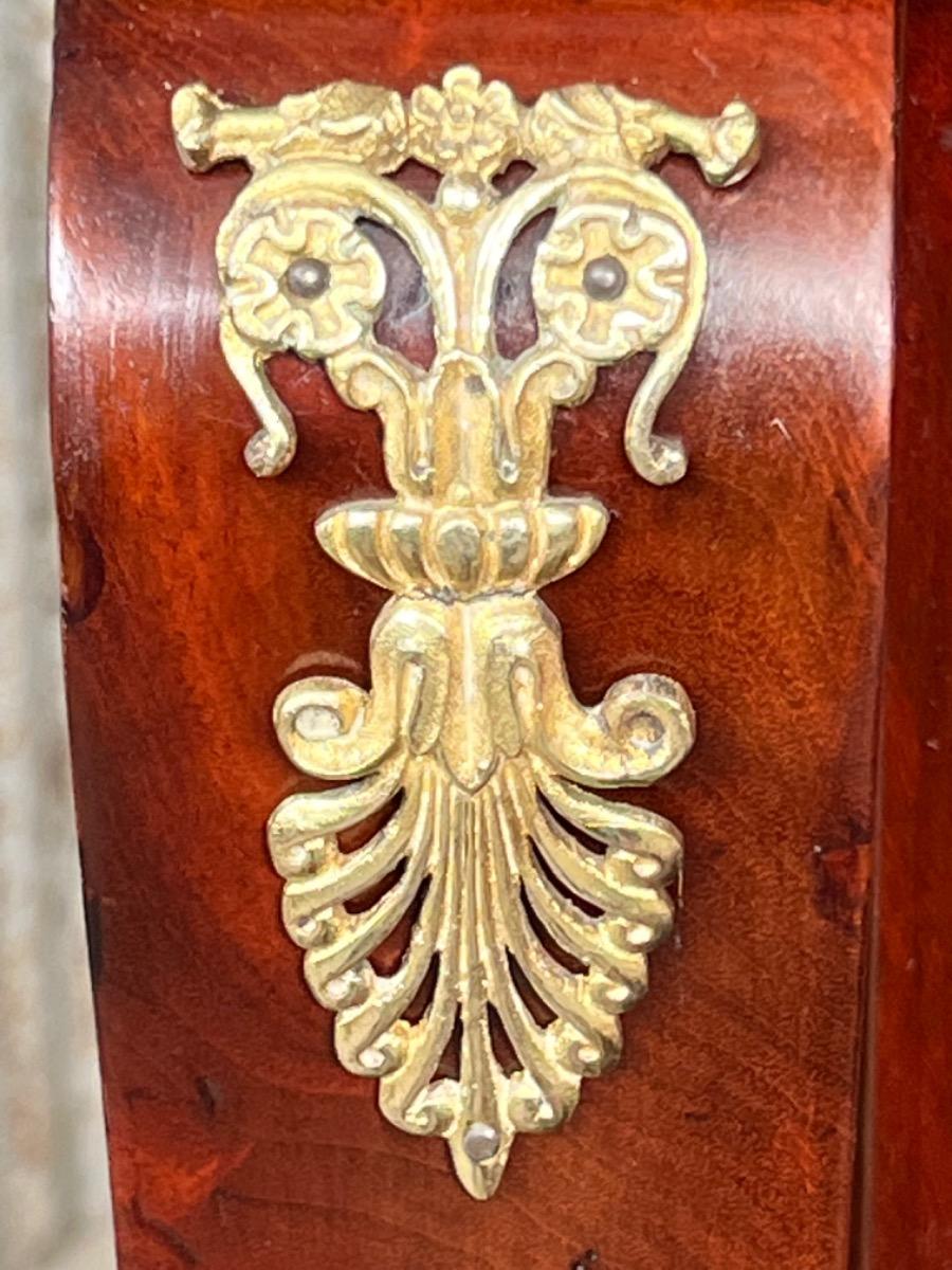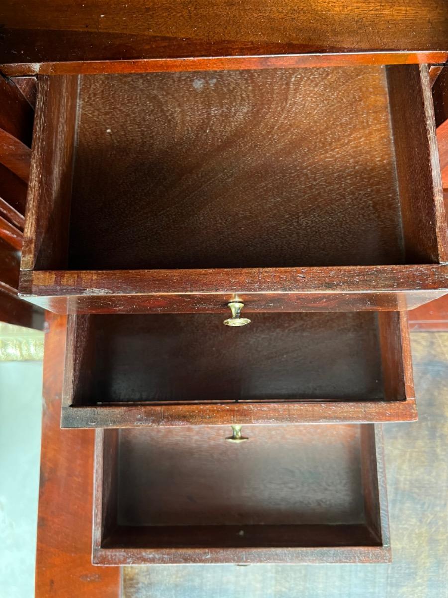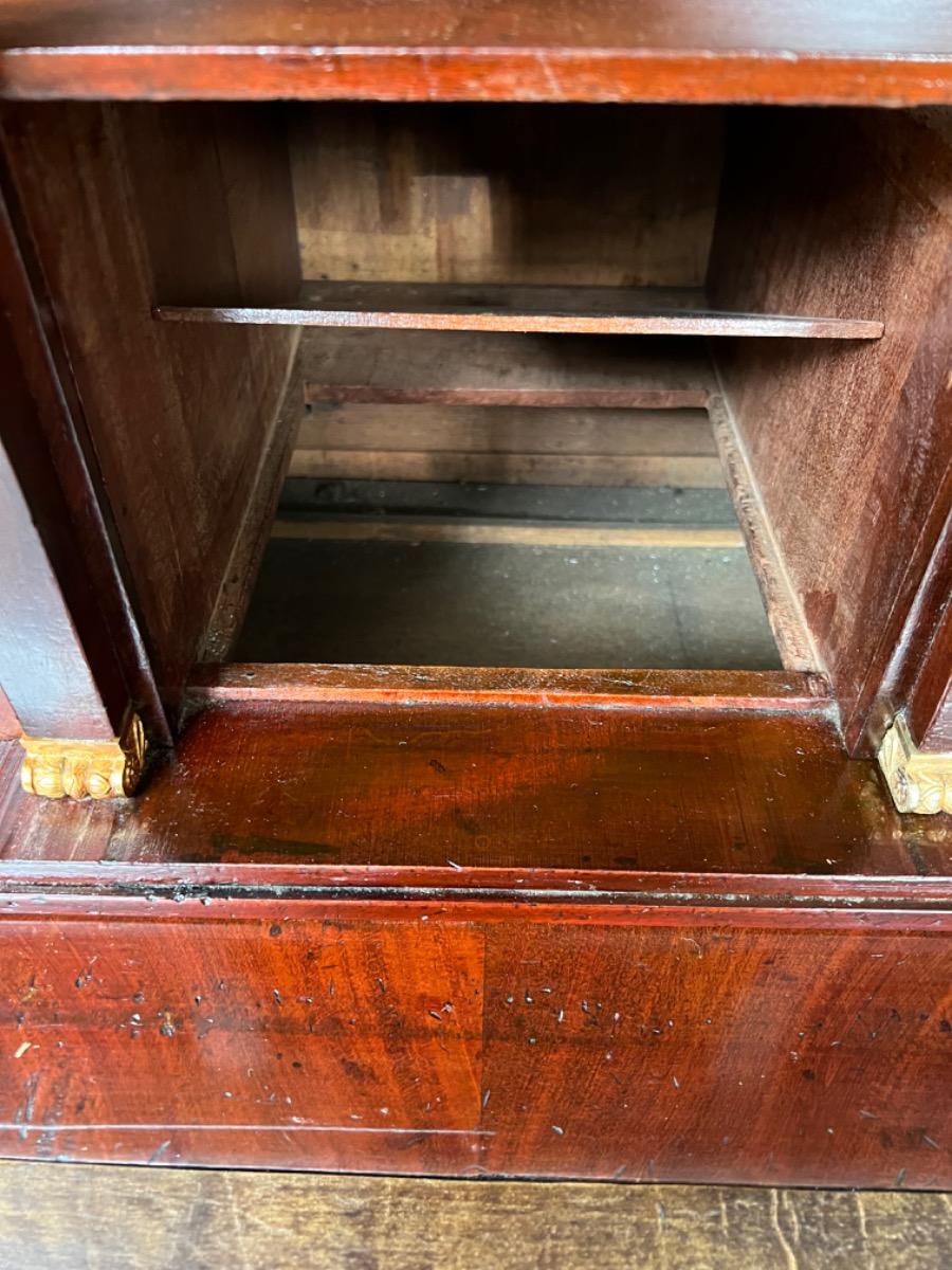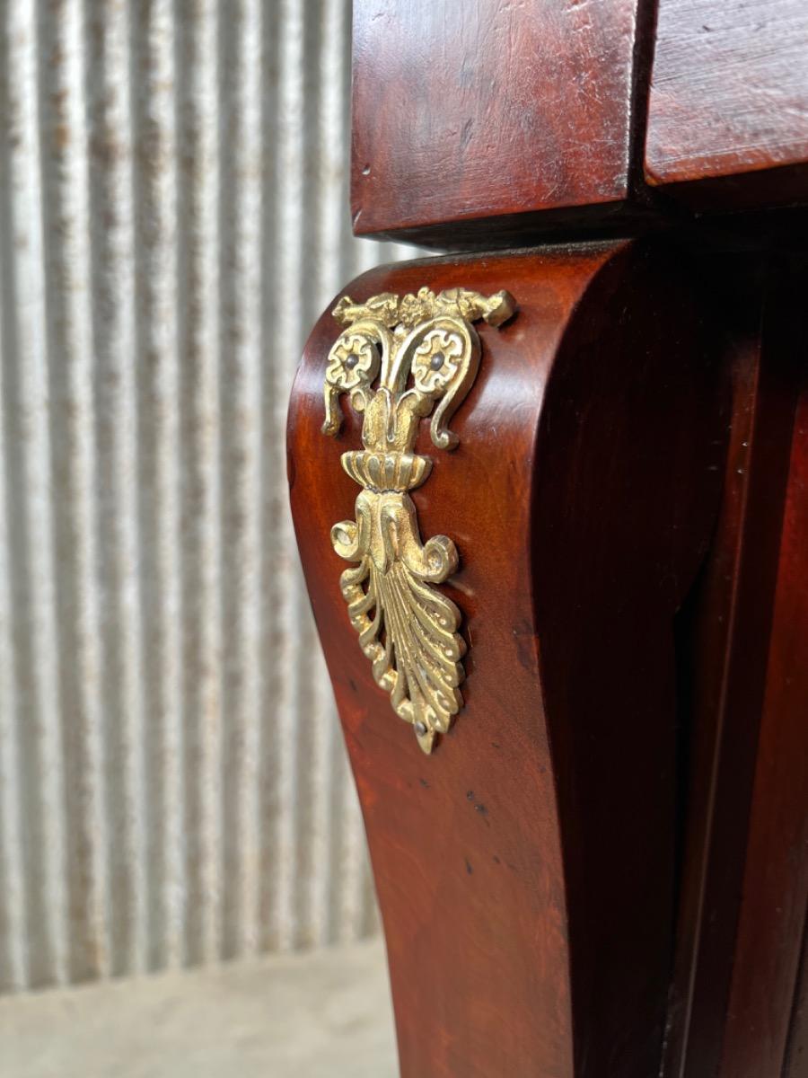 Strak model, zeer fraai boek bloem mahonie gefineerd. overstekende kap lade met overdadig veel vuur verguld beslag. Het interieur vol met laden, centrale lade met verborgen vak / kelder. De voluut vormige pilaren met eveneens verguld beslag, tussen de interrieur laden zijn gelijk ook geheime vakken. Alle laden hebben als blind hout ook mahonie! (zie fotoo) De klep is ingelegd met olijf groen kalfsleder, het oorspronkelijke slot is werkend met sleutel (en 1 reserve sleutel). Onder de klep, twee deuren met daarachter een drie laads onderkast eveneens met vuur verguld knop beslag. Geheel is gedragen door 4, voor de "epoque" peroide gekenmerkte blokpoten. Het meubel is gedekt met zijn oorspronkelijke grijze marmer. Alles compleet en werkend, in zeer goede en direct te gebruiken staat. Frankrijk, ca. 1800 - 1815. Afm: H= 148 cm. B= 103 cm. D= 51 cm. Onlangs grondig nagelopen op losse delen van constructie en fineer. Houtworm controle : Geen levende houtworm aangetroffen 27/11/2021 sec-2241~