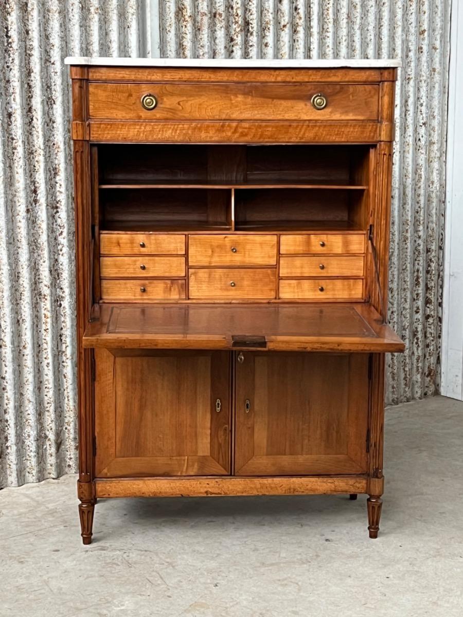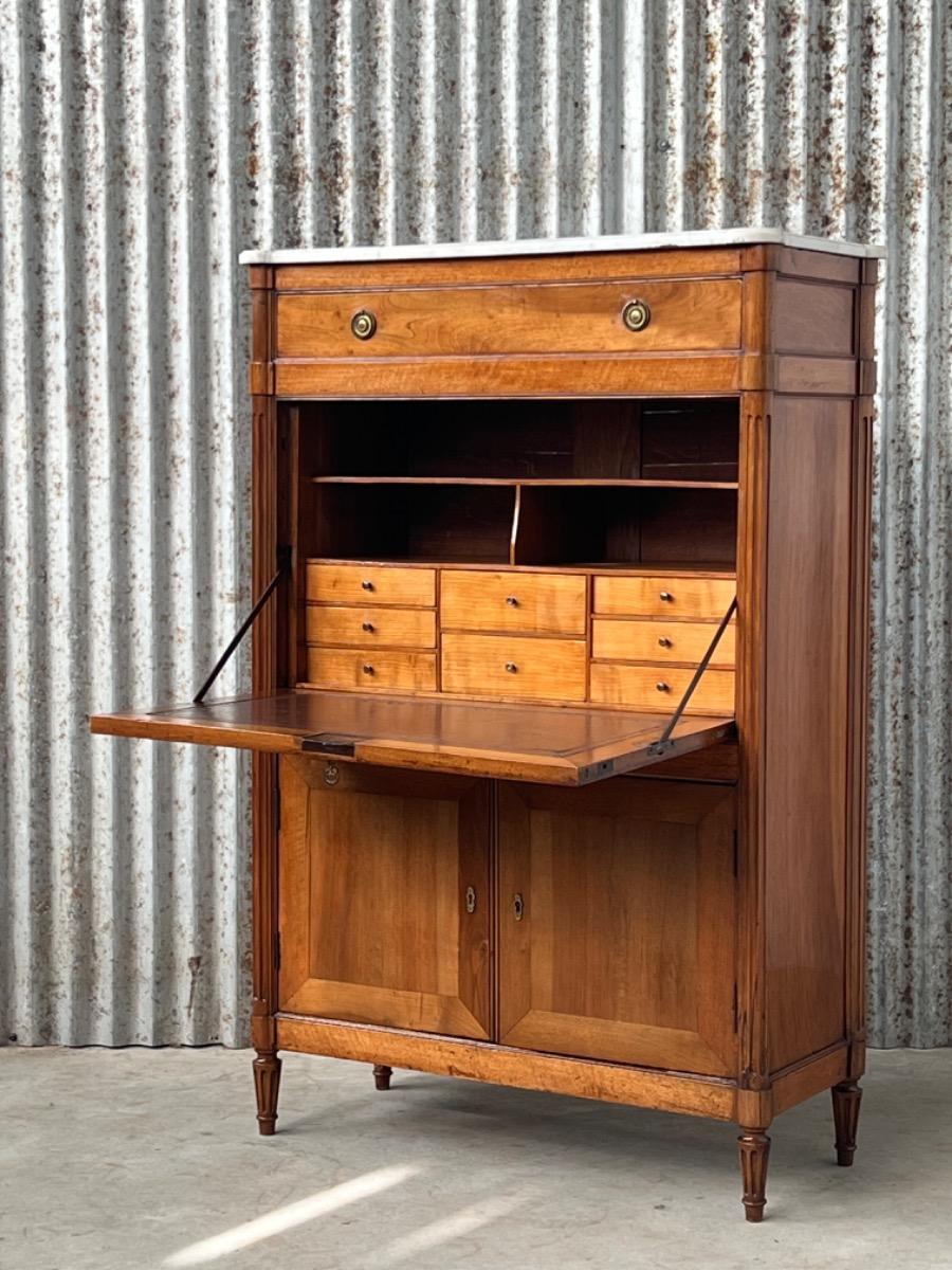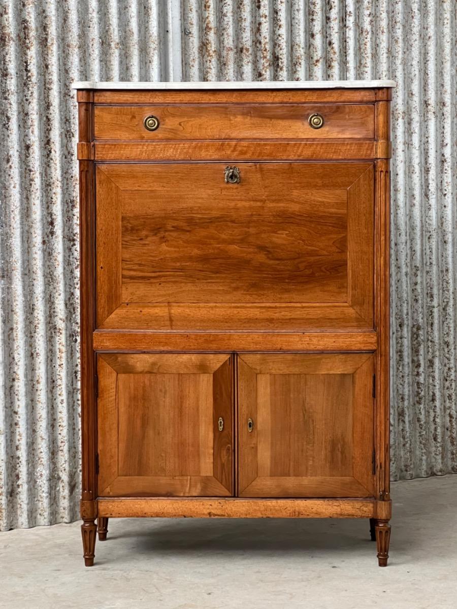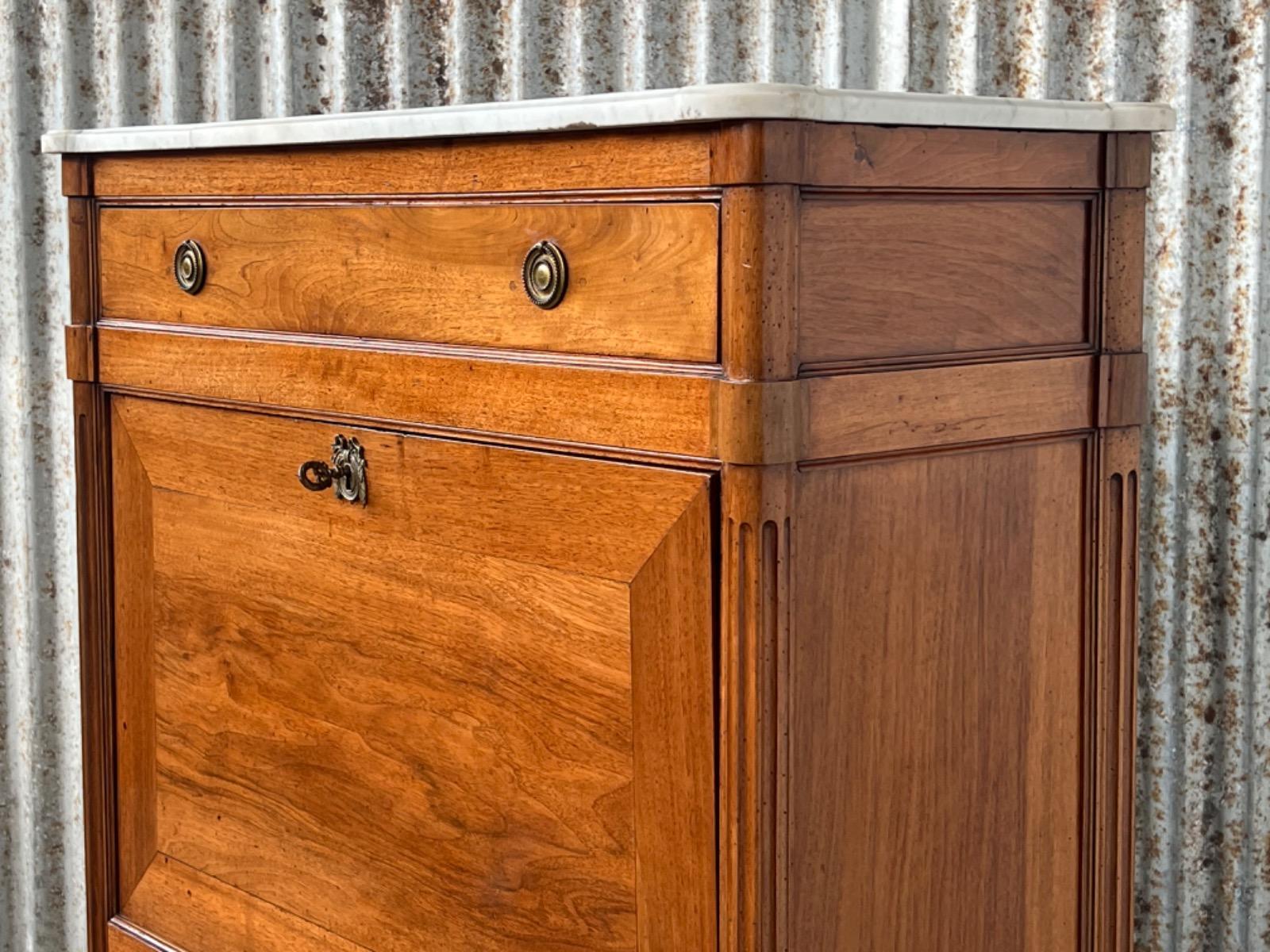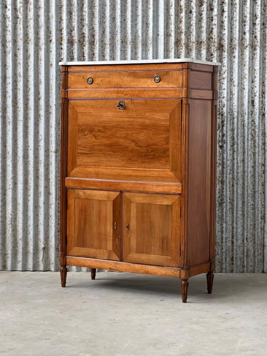 Louis XVI walnut secretaire à abattant By J.F Leleu with its original ‘Bianca Carrara’ marble top with rounded front corners.