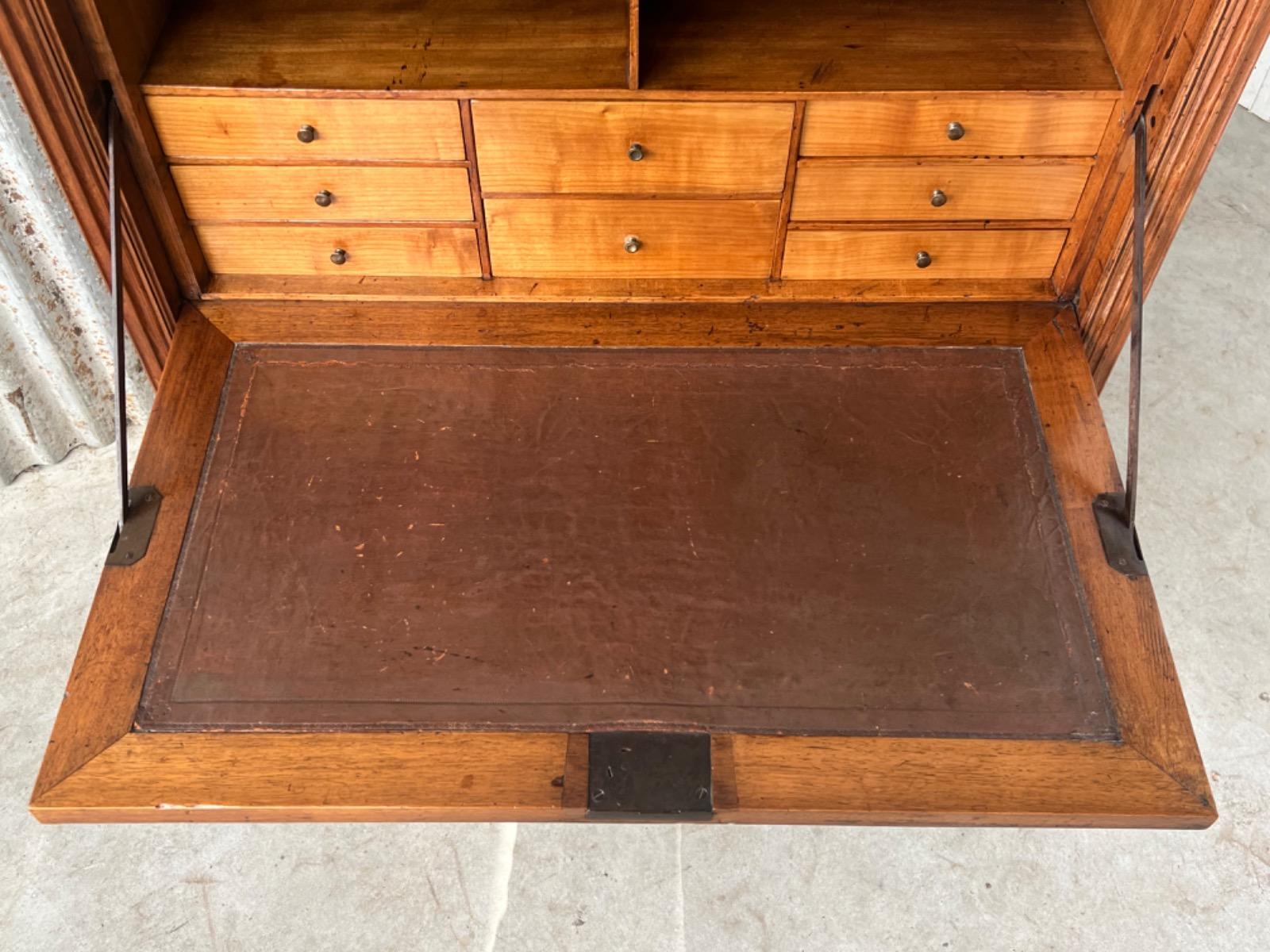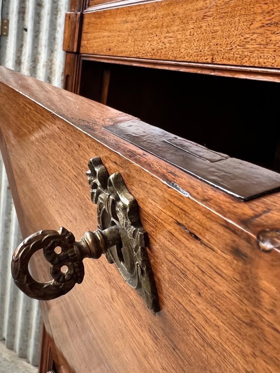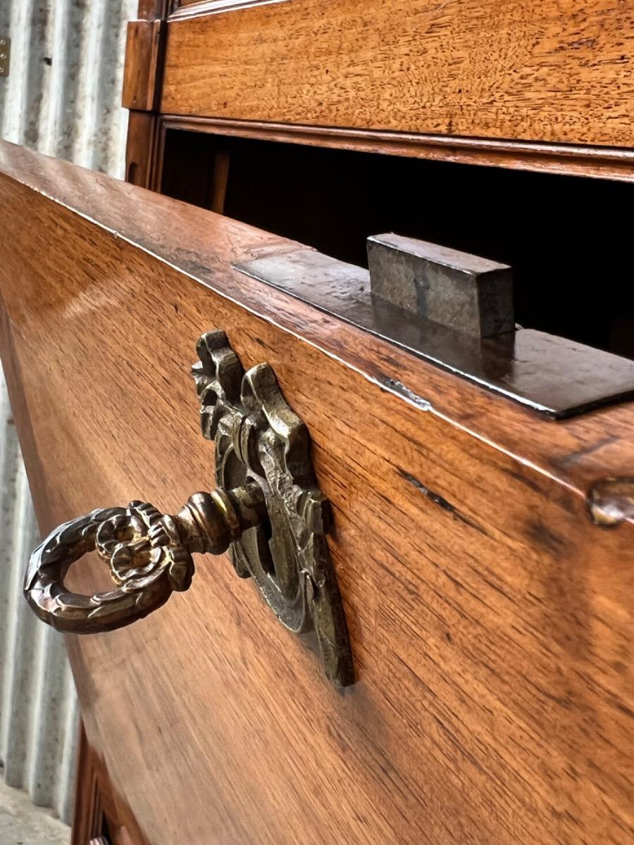 Brown gilded edge calf leather inlay, Turned tapered legs (from top to bottom ) with cannelures, locks and keys working. Panelled sides, flap and doors. General in good vintage condition as comes with the age.