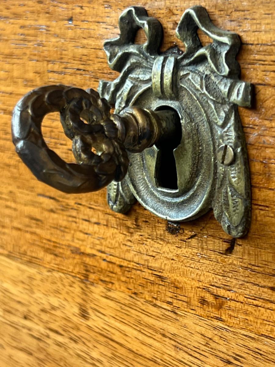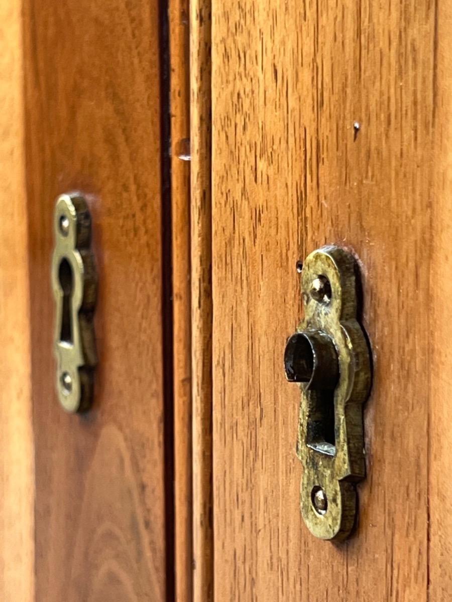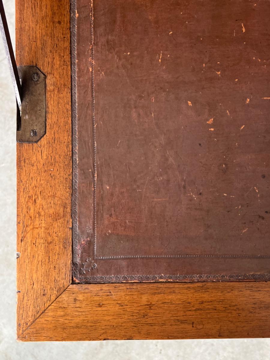 Brown gilded edge calf leather inlay, Turned tapered legs (from top to bottom ) with cannelures, locks and keys working. Panelled sides, flap and doors. General in good vintage condition as comes with the age.
